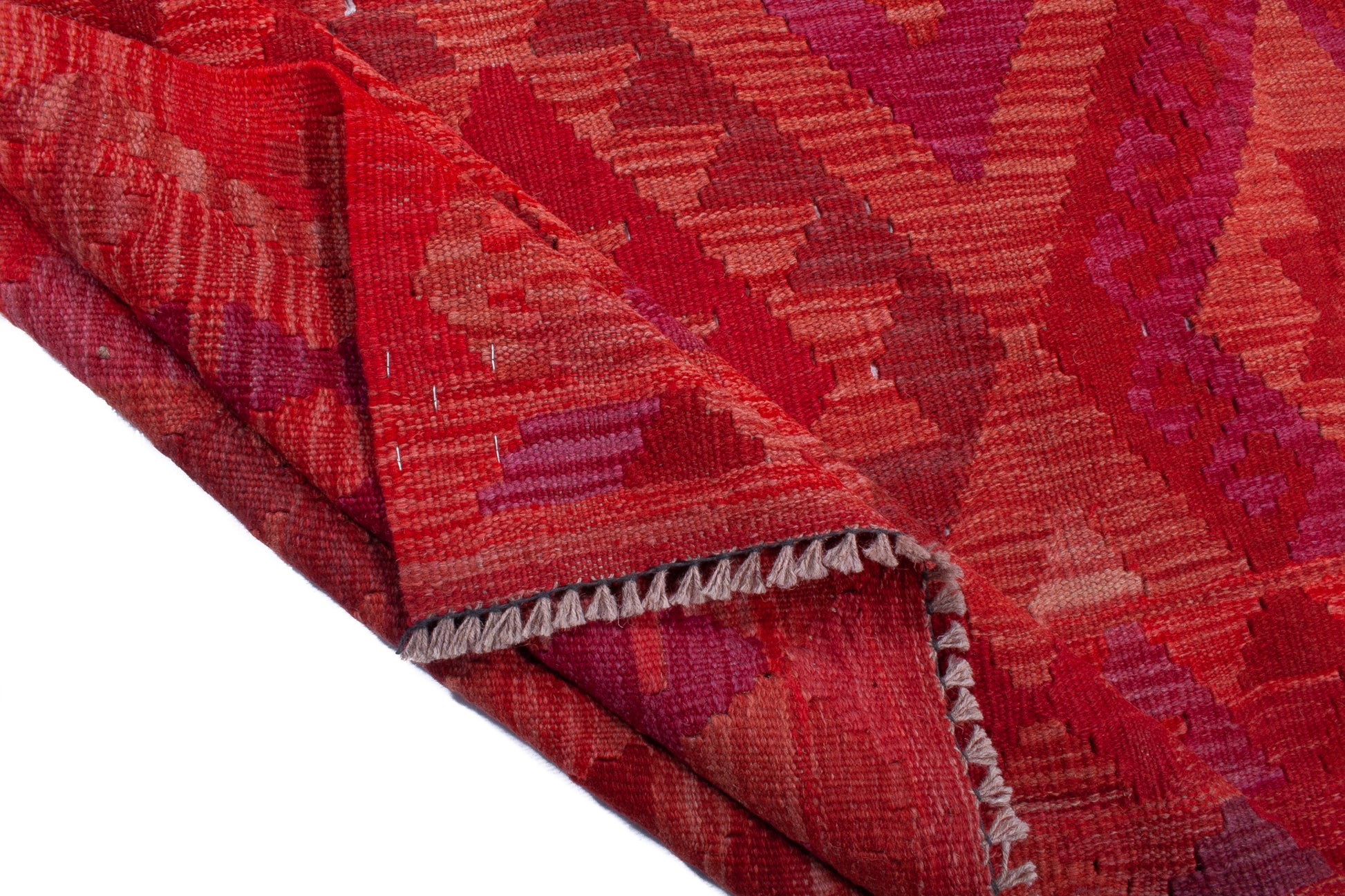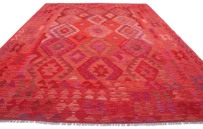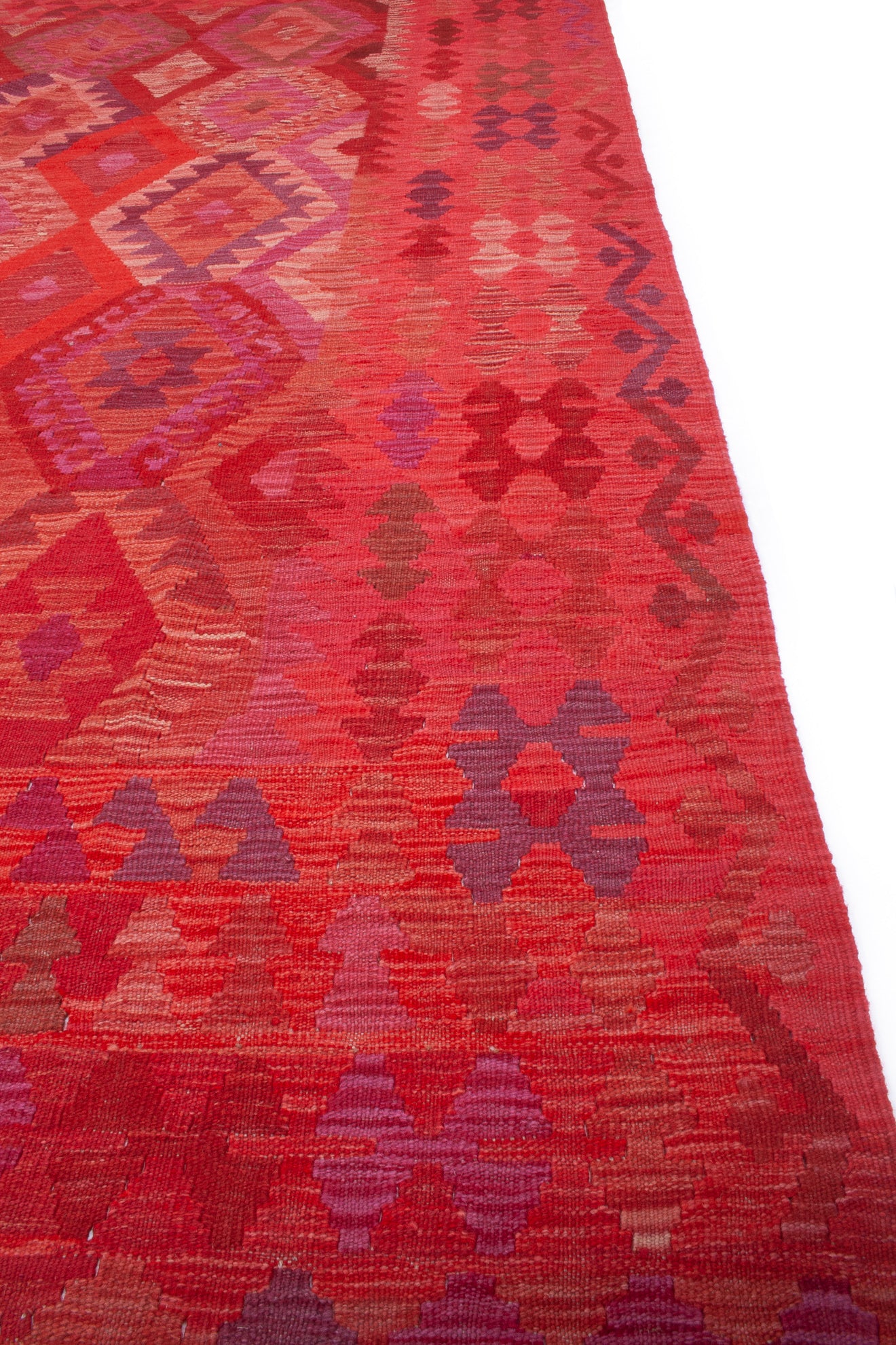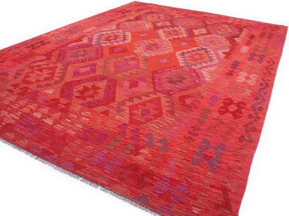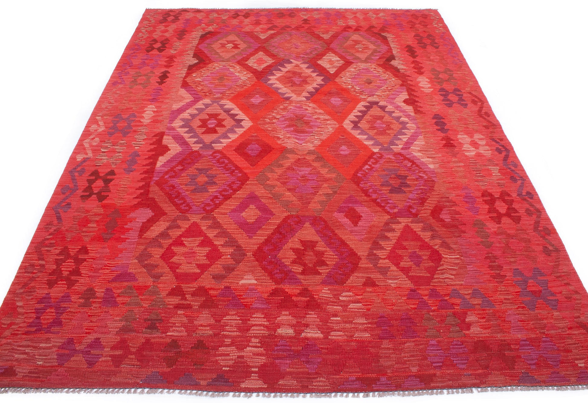 Handwoven in Afghanistan, this Kilim rug embodies the bold geometry and rich colour of tribal weaving. Its all-over diamond medallion layout creates a striking sense of rhythm, enhanced by a palette of crimson, burgundy, plum, and coral, with accents of rose pink and violet.