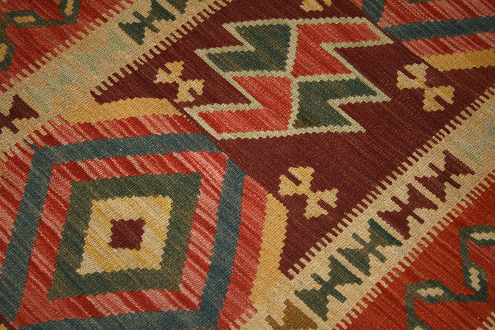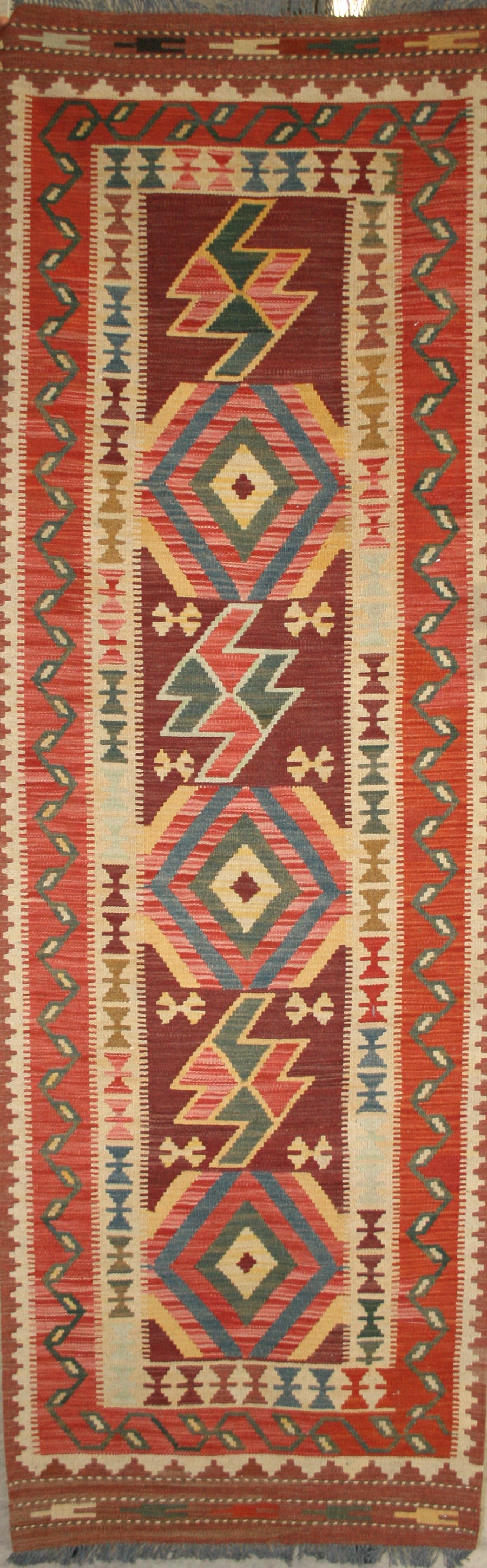 This Afghan Kilim runner captures the bold symmetry and earthy warmth of tribal weaving. Its repeat medallion layout features diamond motifs nested within a deep burgundy field, punctuated by zigzag lightning forms and stylised geometric shapes that add dynamic movement to the design.