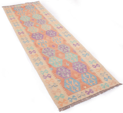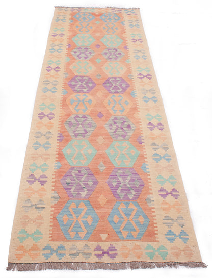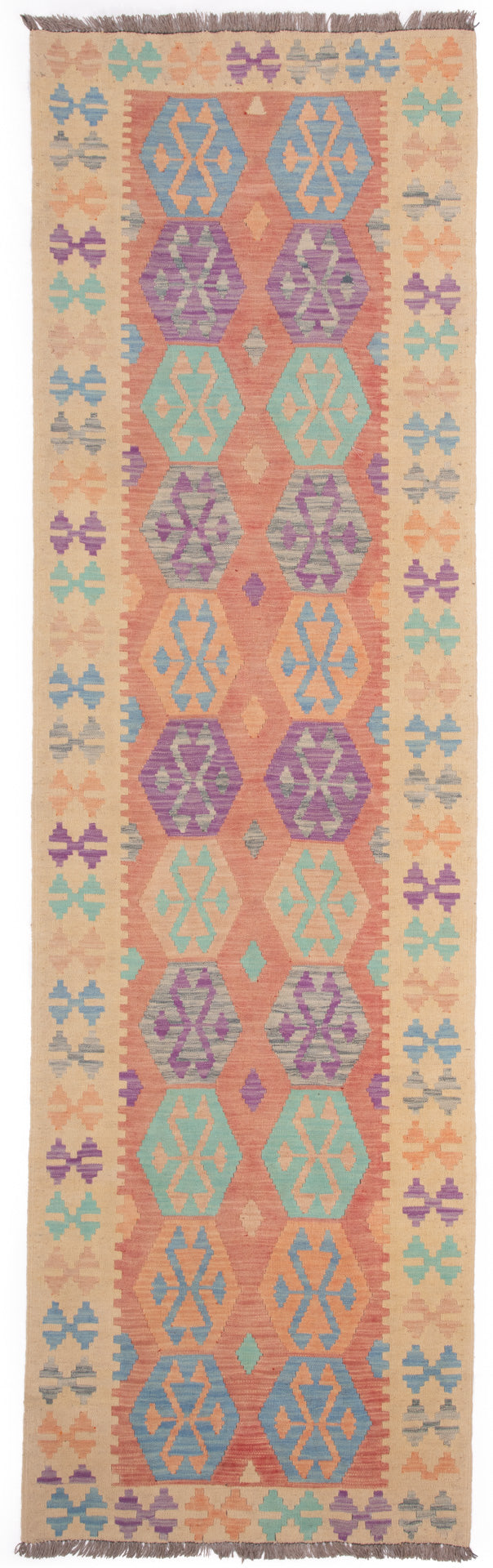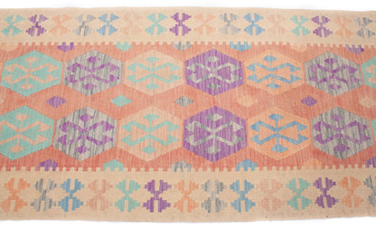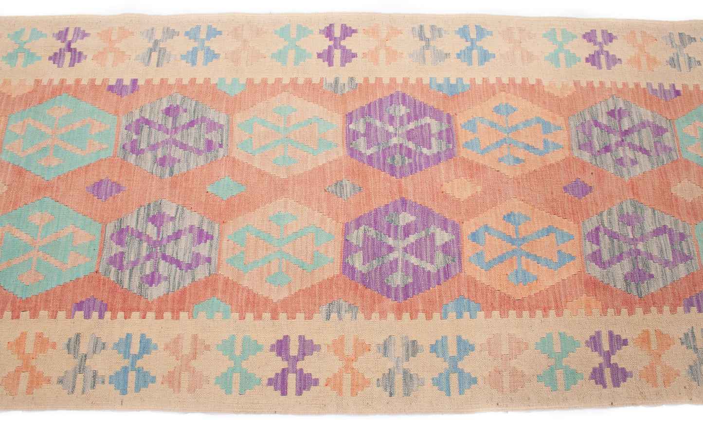 This Afghan Kilim runner weaves geometry and symbolism into a softly muted palette, perfect for hallways or transitional spaces. A series of hexagonal medallions, each containing mirrored Koçboynuzu (Ram’s Horn) motifs, runs along the central axis, creating a rhythm of repetition and symmetry. The peach field, contrasted with lavender and turquoise medallions, is framed by a beige border of small geometric shapes, accented with subtle guard bands for added structure.