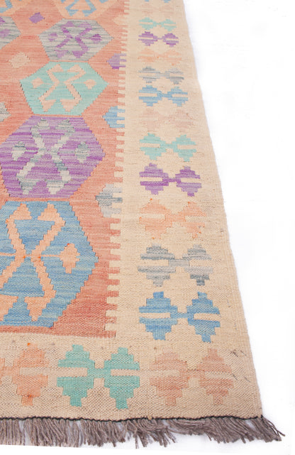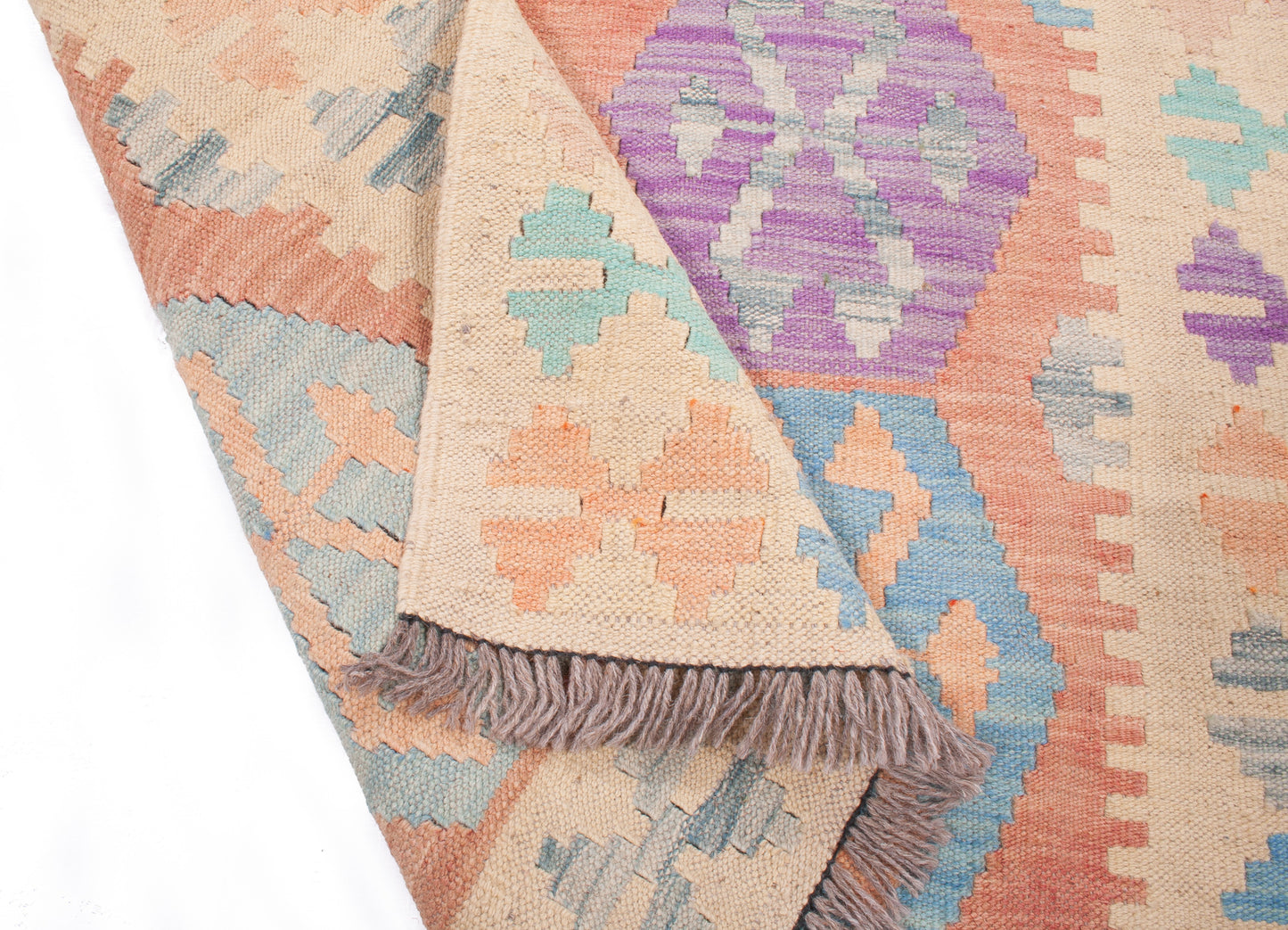 Woven from wool on a cotton foundation, this Kilim is lightweight yet durable, reflecting generations of Afghan weaving tradition. Its earthy tones of peach, lavender, and beige blend effortlessly into traditional or eclectic interiors, offering a grounded elegance without overpowering a space.