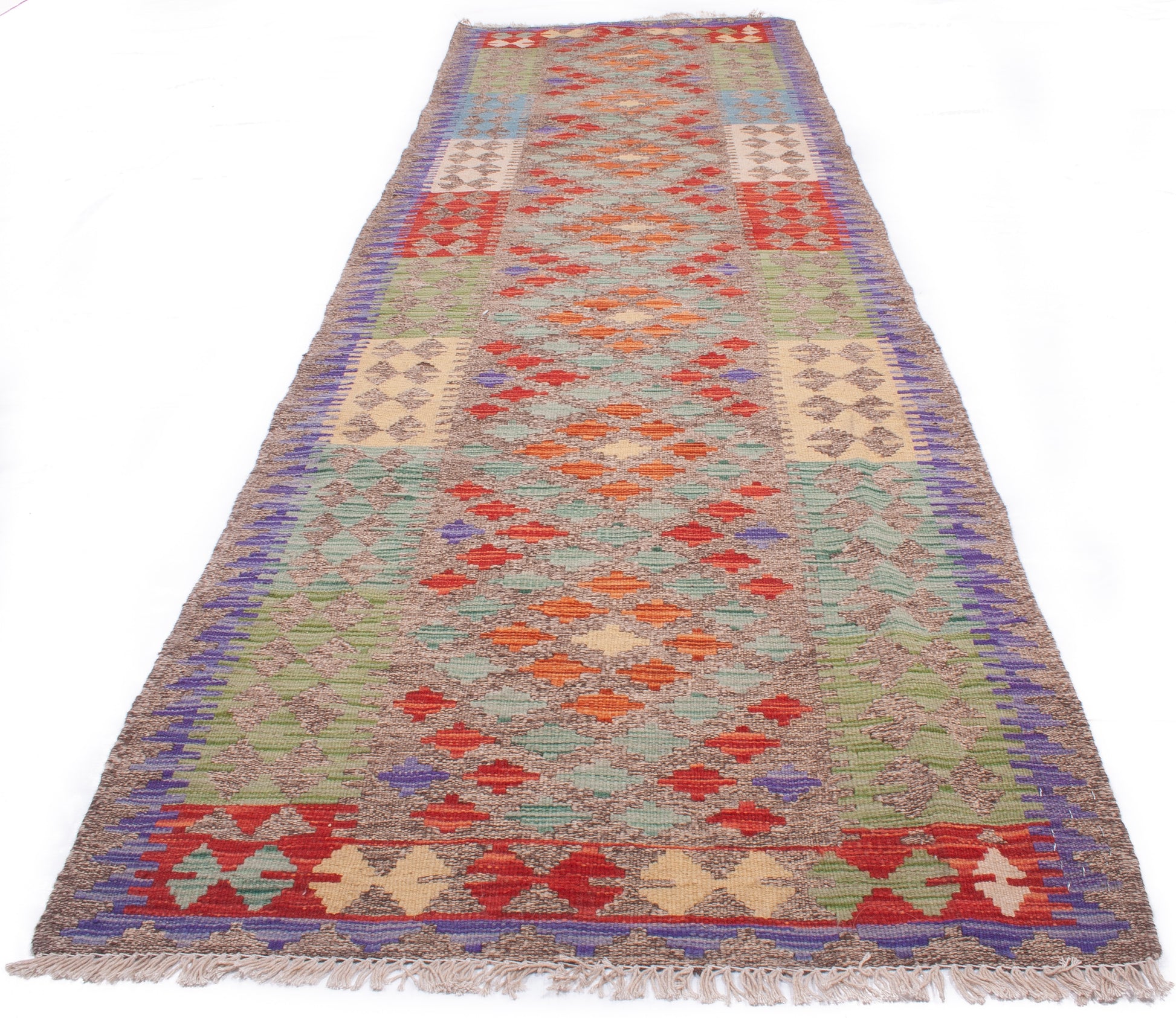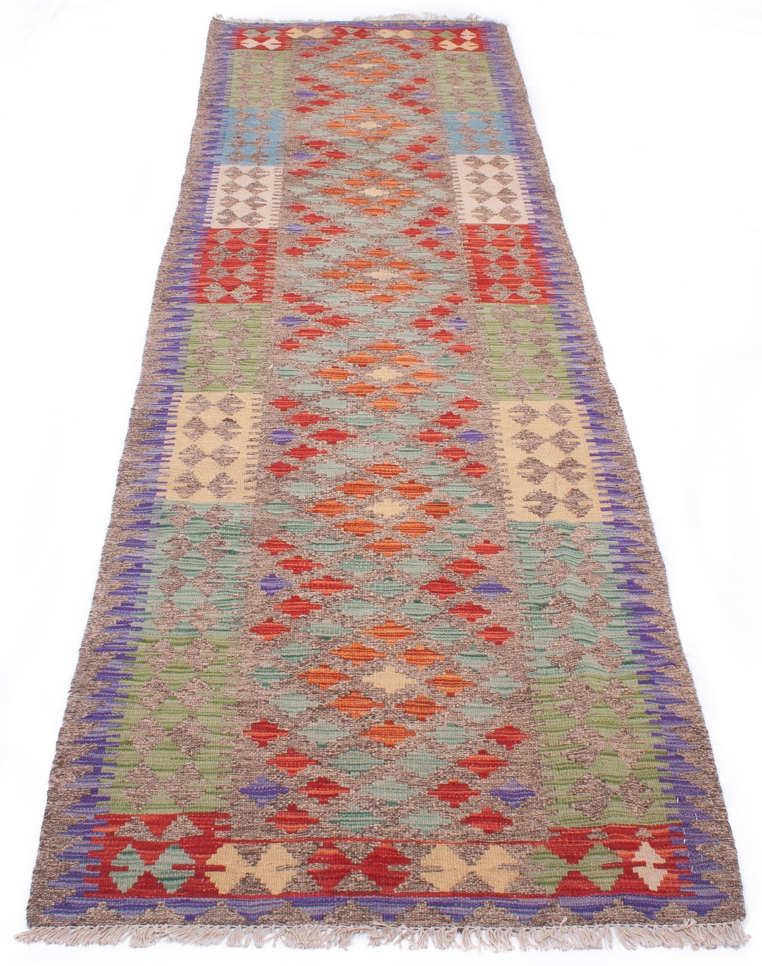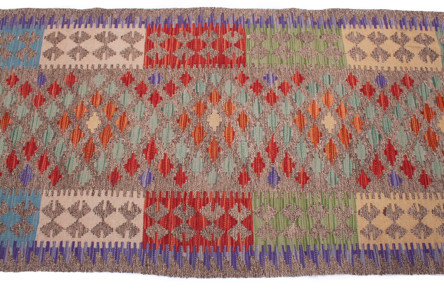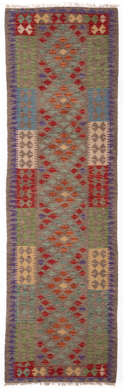 Handwoven in Afghanistan, this Kilim runner embodies the bold geometry and rich tradition of tribal weaving. Its mirrored rows of nested diamonds create a rhythmic, linear flow, softened by an earthy palette of sage green, burnt orange, brick red, and mustard yellow, with accents of sky blue and purple adding subtle contrast.
