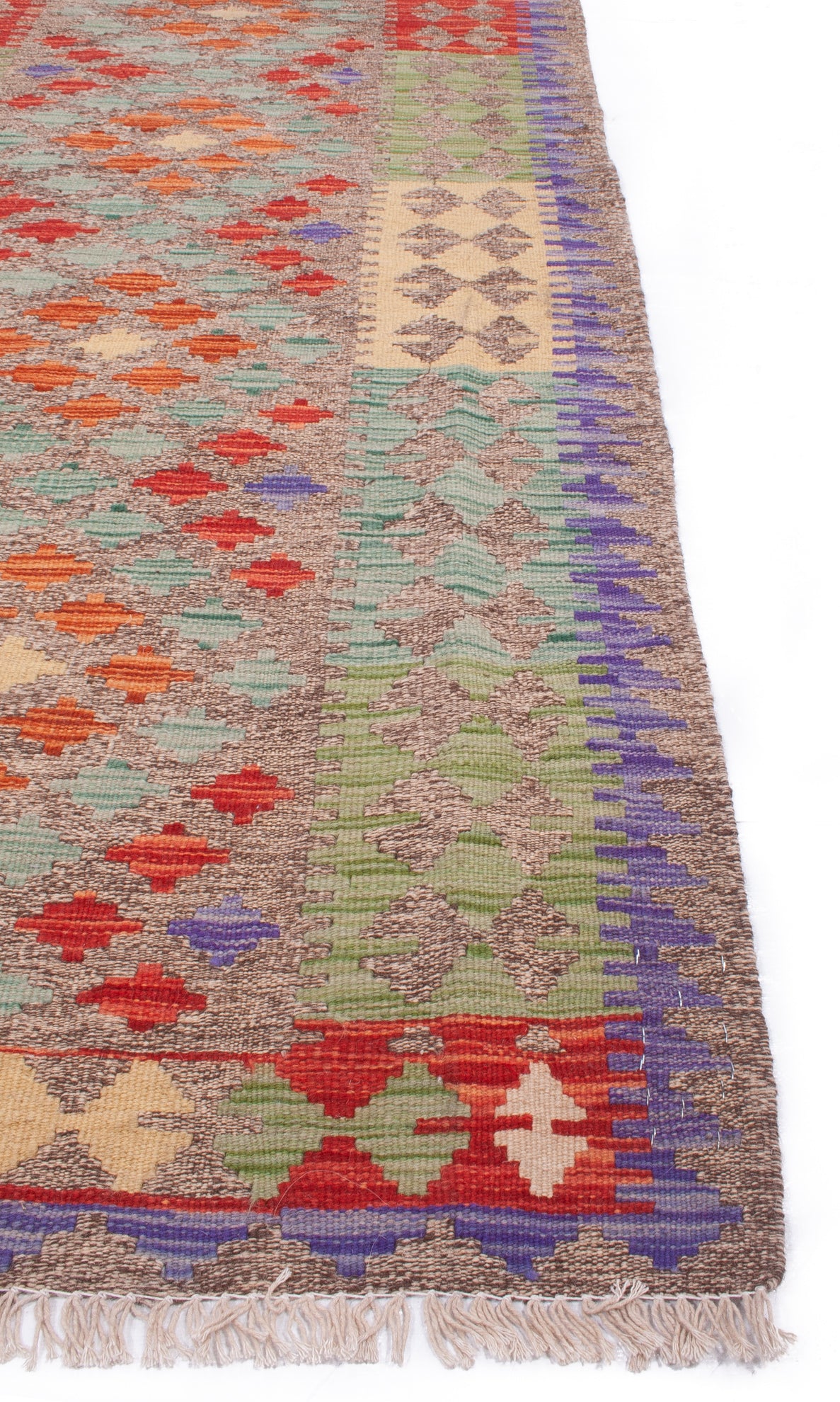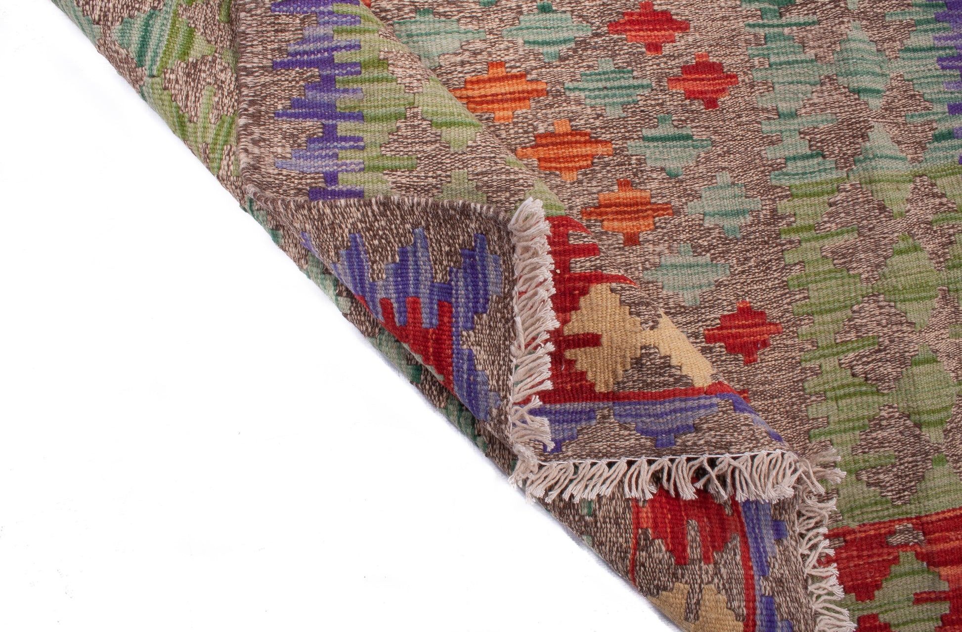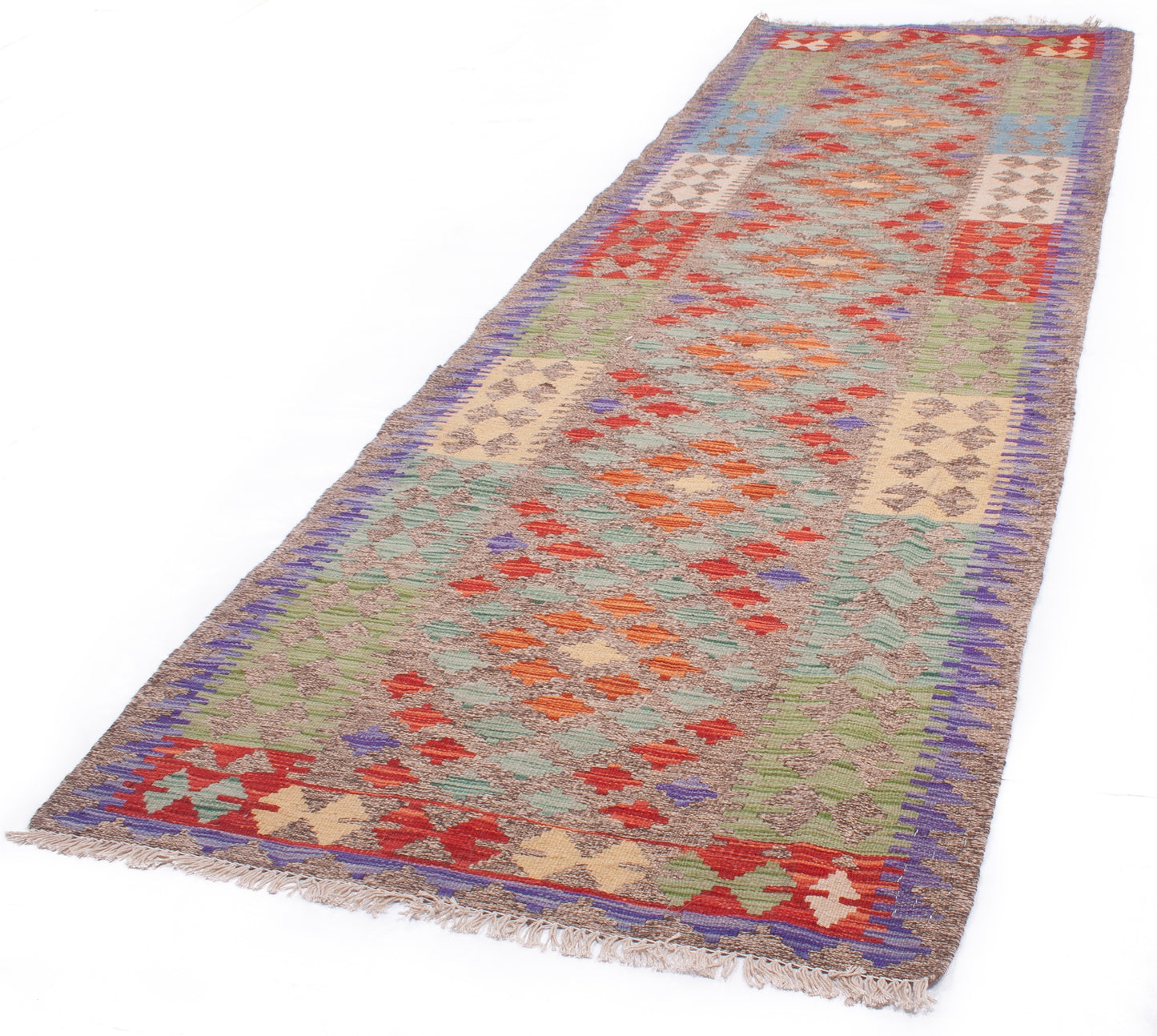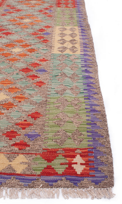 Handwoven in Afghanistan, this Kilim runner embodies the bold geometry and rich tradition of tribal weaving. Its mirrored rows of nested diamonds create a rhythmic, linear flow, softened by an earthy palette of sage green, burnt orange, brick red, and mustard yellow, with accents of sky blue and purple adding subtle contrast.