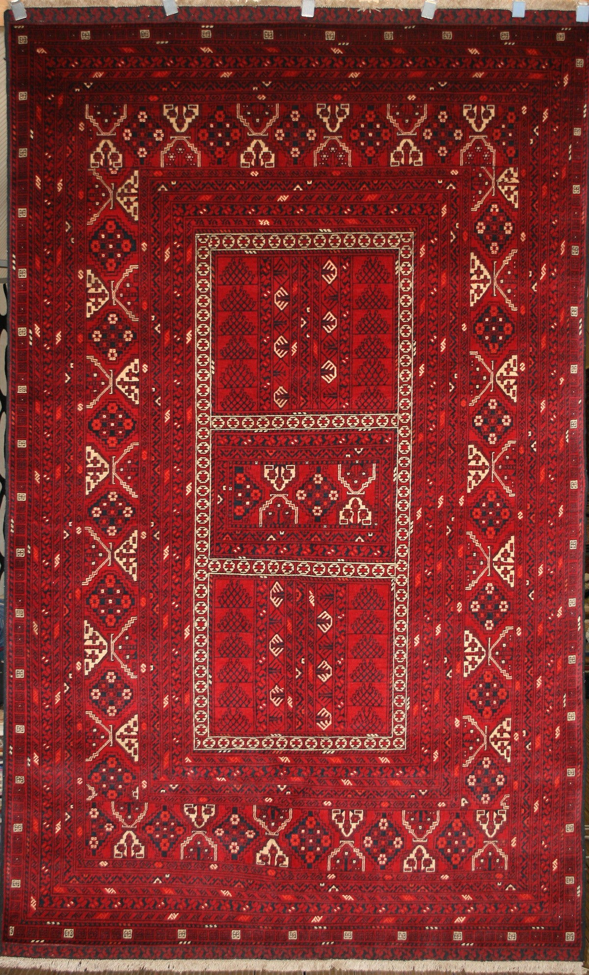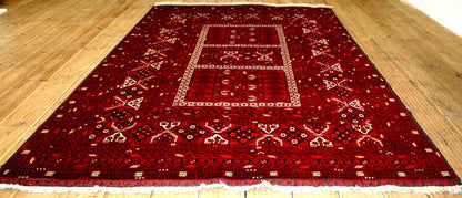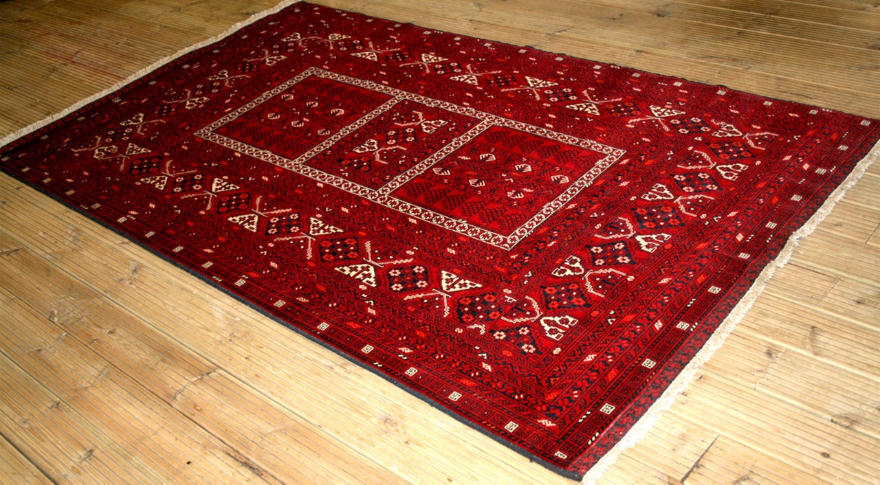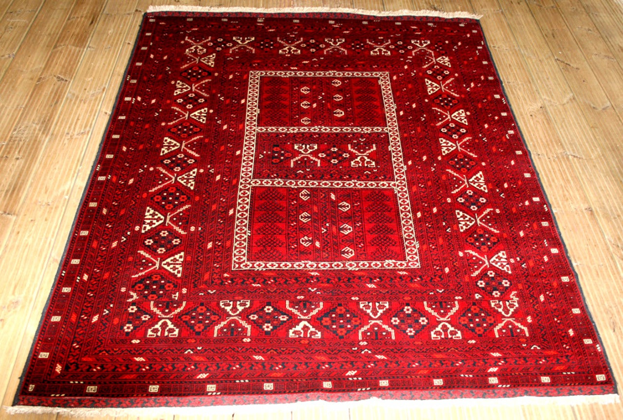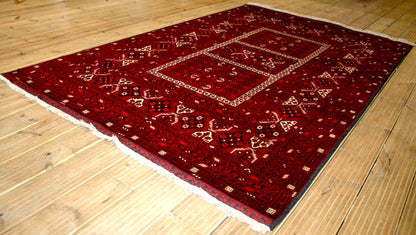 This hand-knotted Afghan rug from Kunduz embodies the tribal strength and symmetry of the Khesti (Panel) design, where rectangular compartments frame stylised Gul motifs in a bold, mirrored arrangement. Each panel reflects the geometric clarity and repetition that define traditional Afghan weaving.