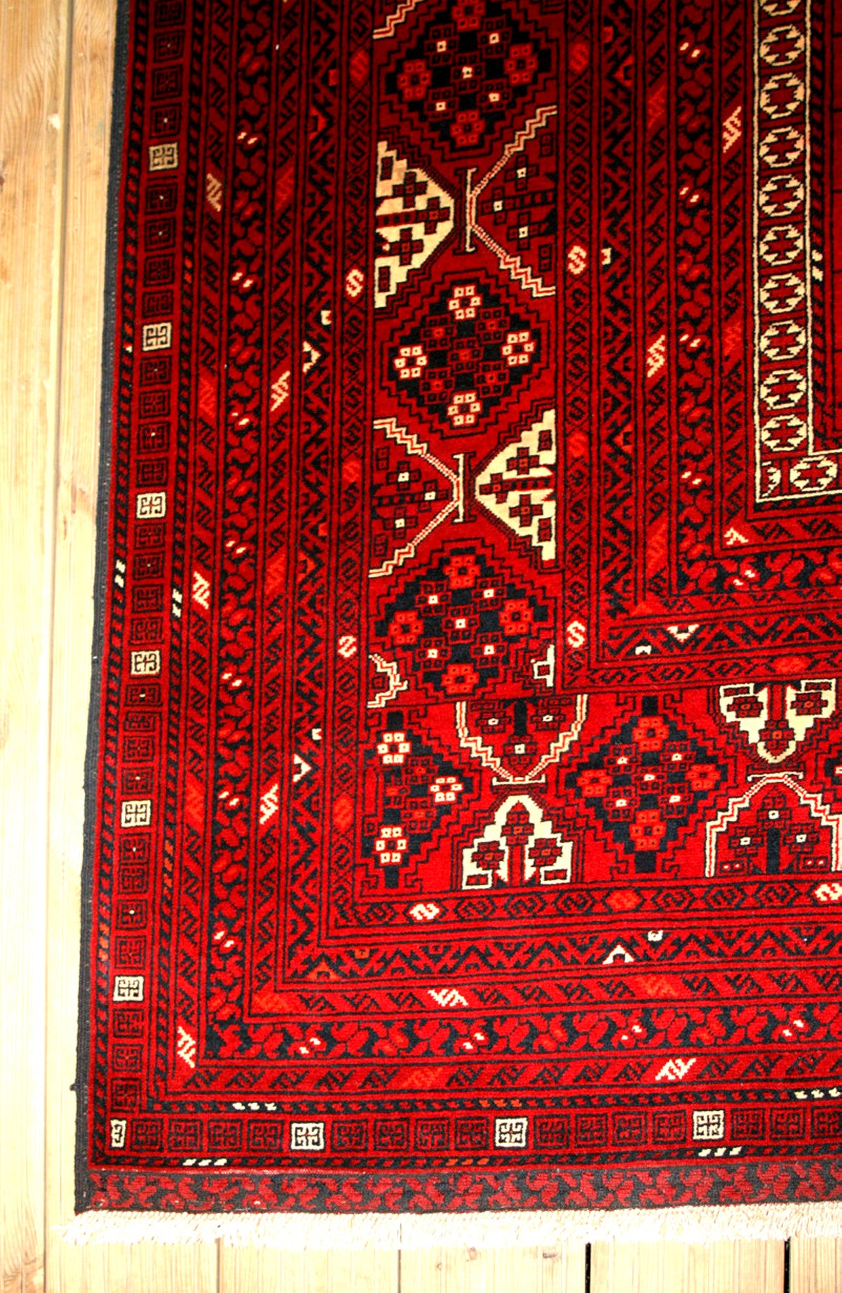 The deep crimson field is punctuated by accents of ivory and midnight blue, with tones of brick red and charcoal black adding depth and contrast. A series of diamond and cross motifs animate the main border, while narrow guard bands provide a rhythmic transition between the field and edge.