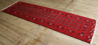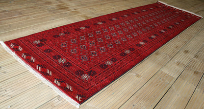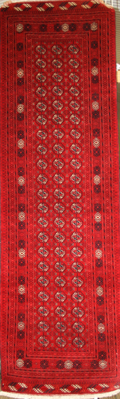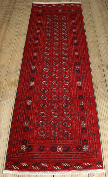 Hand-knotted in Kunduz, Afghanistan, this tribal runner captures the raw elegance of Afghan weaving tradition. Its repeat medallion layout features octagonal Gul motifs—symbols of strength and lineage—arranged in a bold, grid-like formation, flanked by stylised hooks and geometric accents.