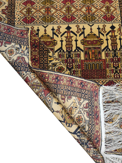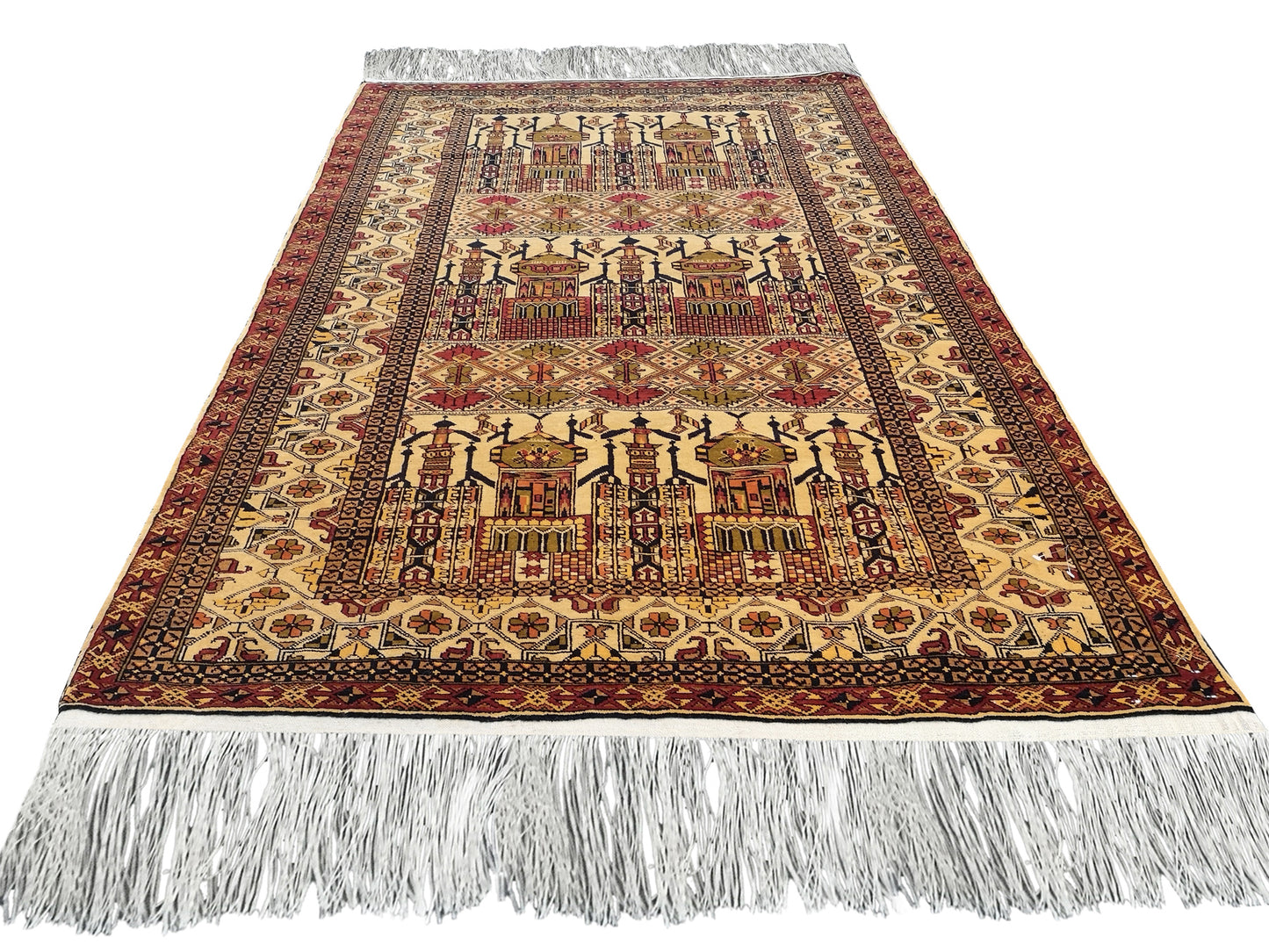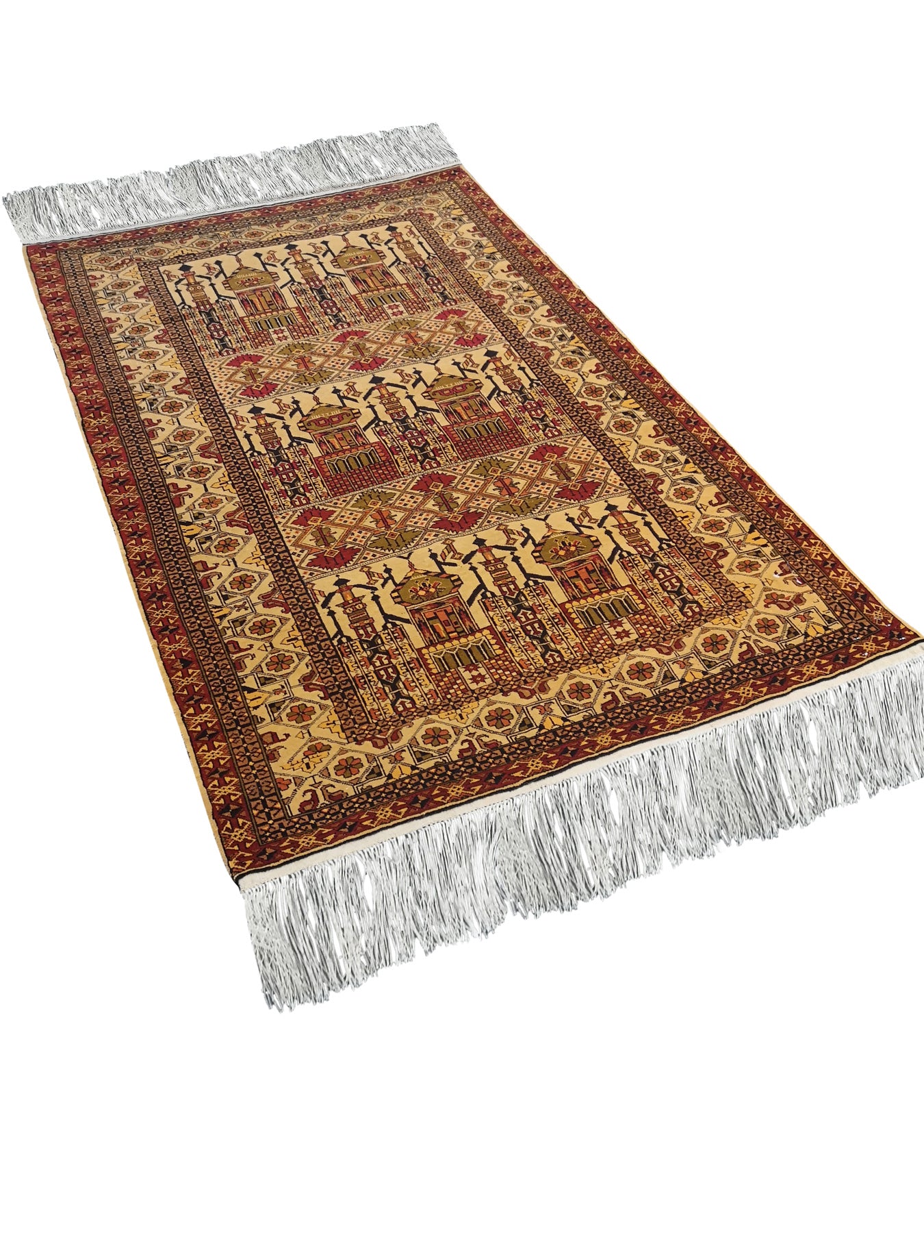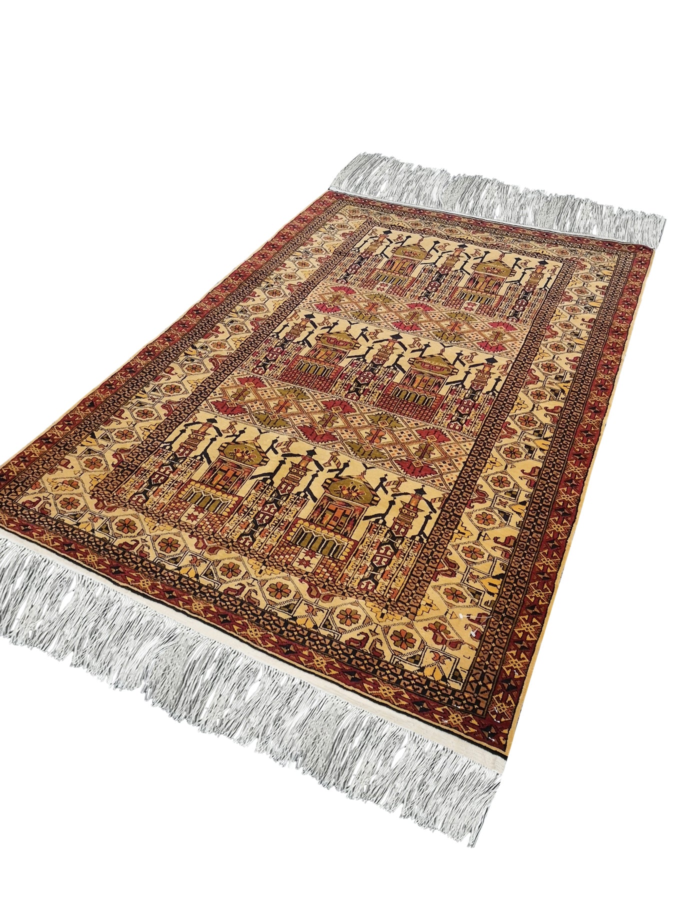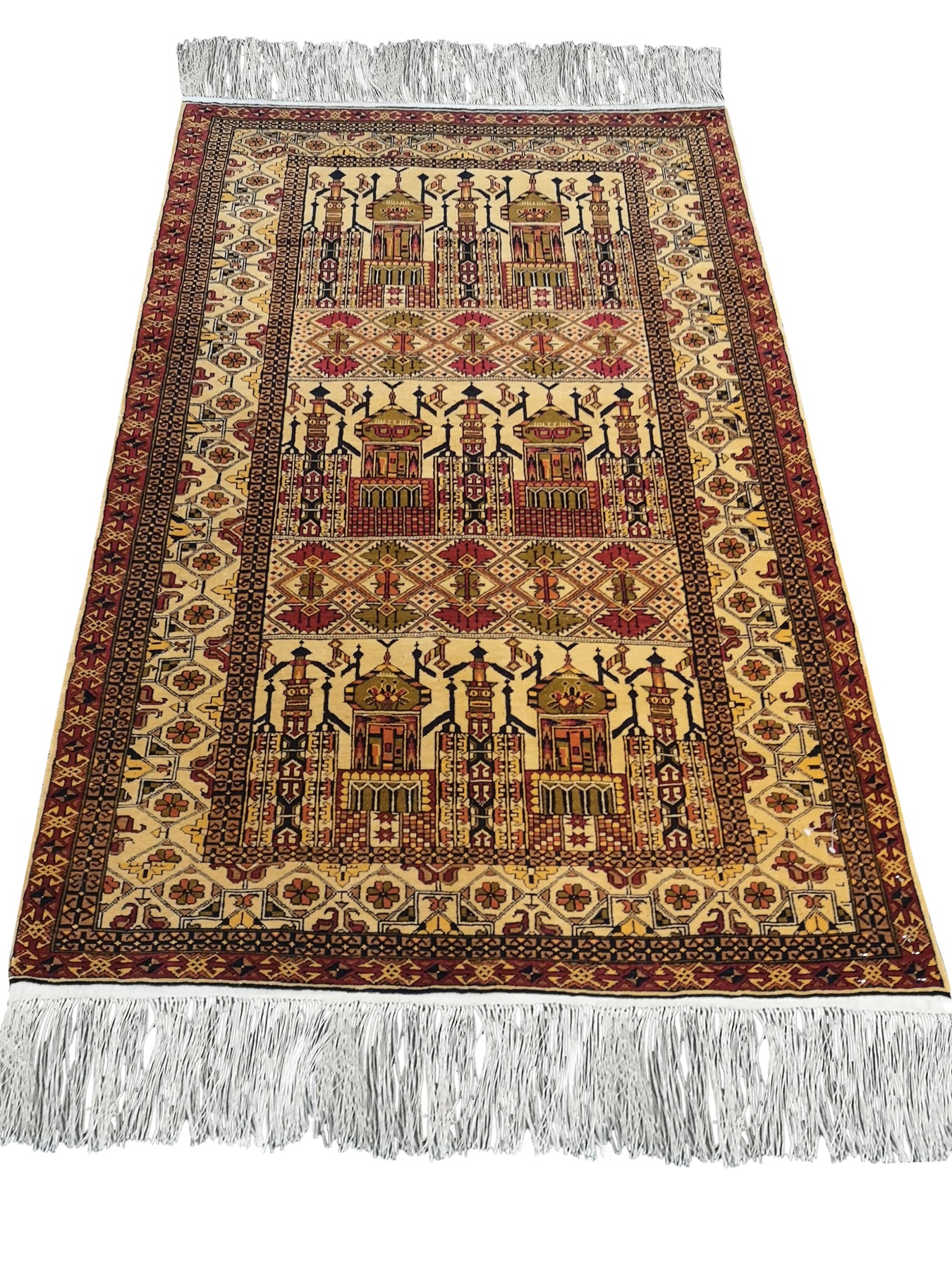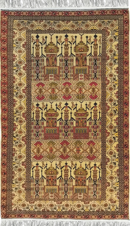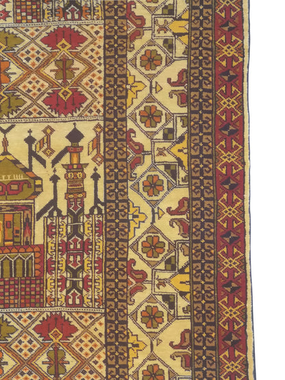 Hand-knotted in Kunduz, Afghanistan, this pictorial rug weaves architecture into art, featuring mosque-like motifs with minarets and domes arranged in a strikingly symmetrical layout. Framed by geometric accents and stylised floral elements, the design blends narrative depth with structural precision.