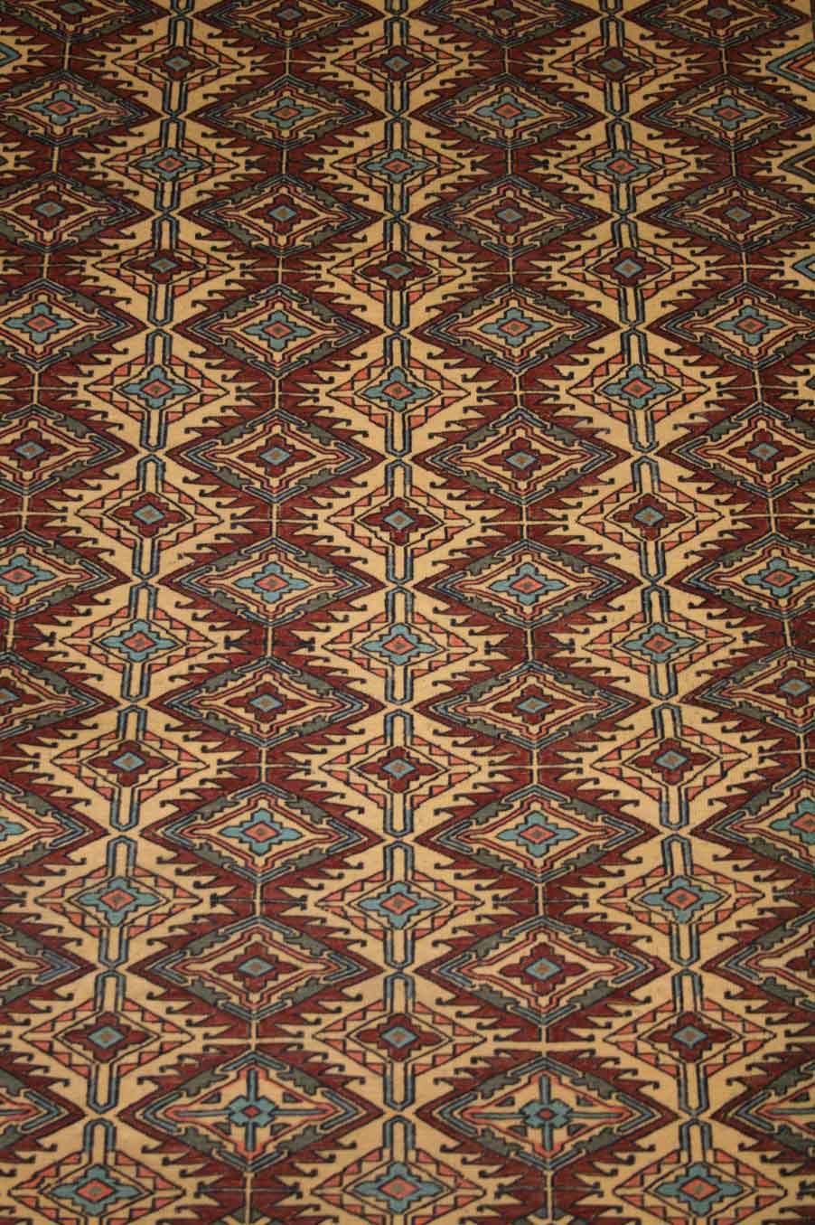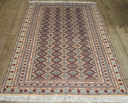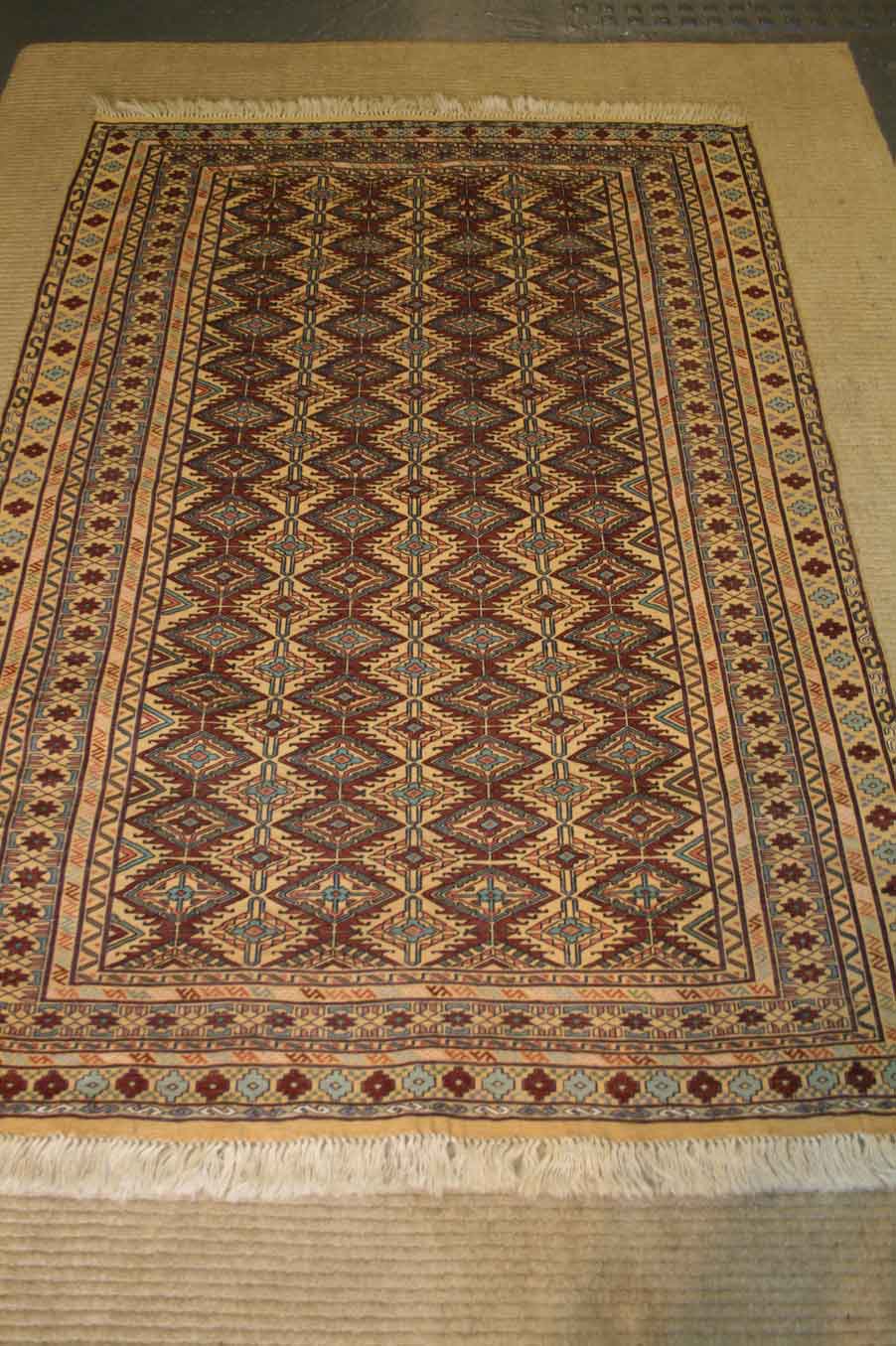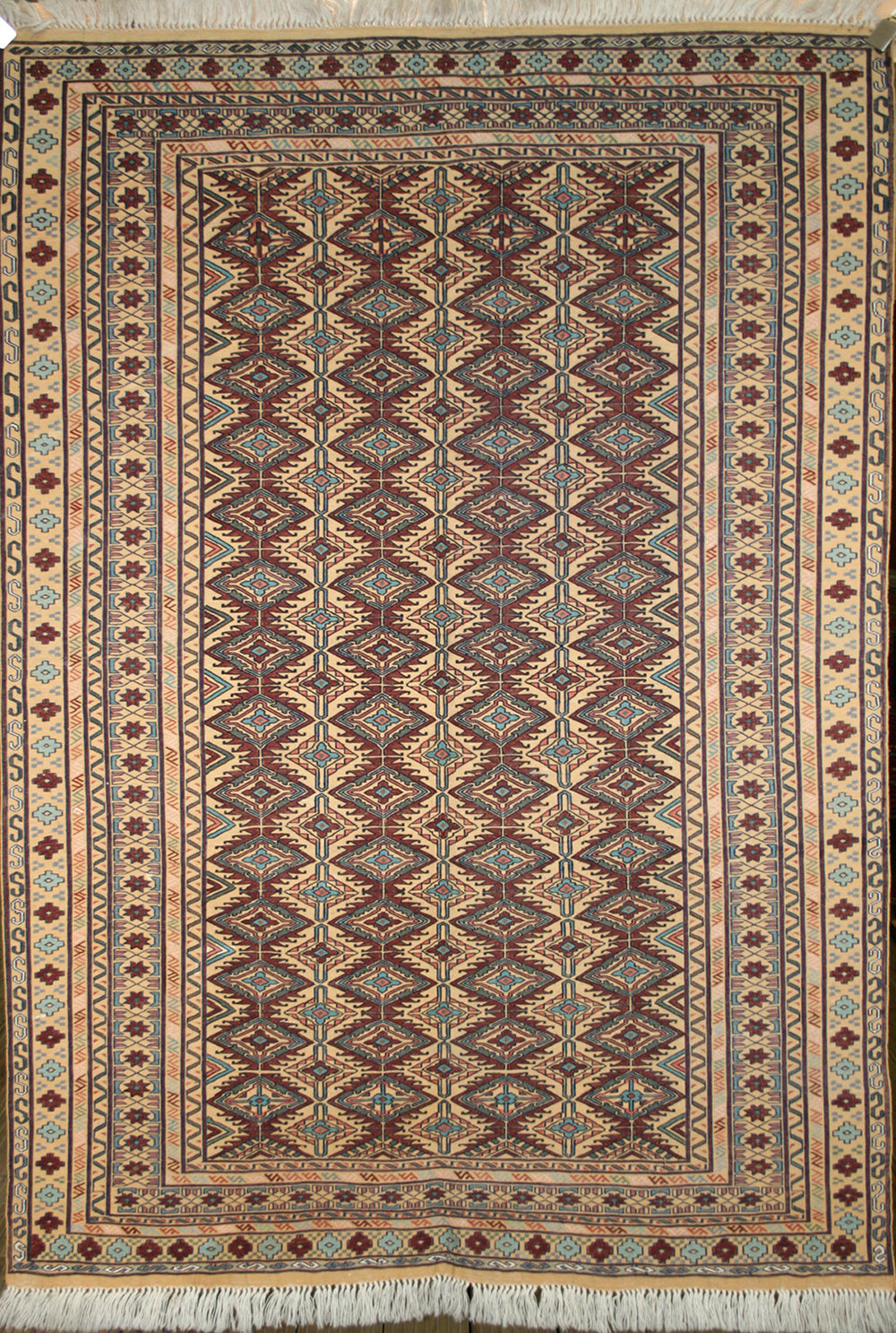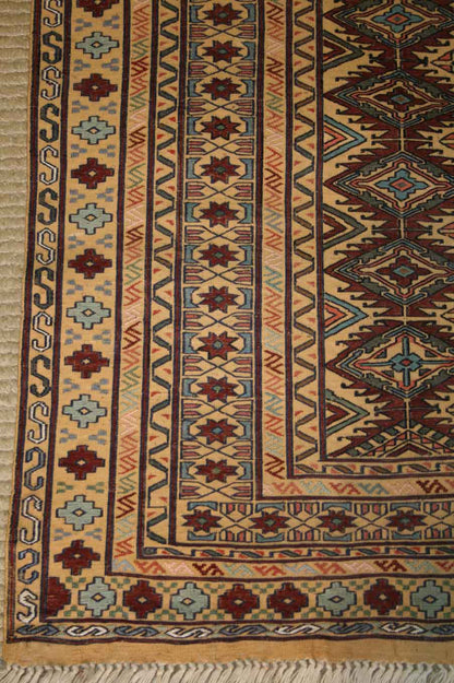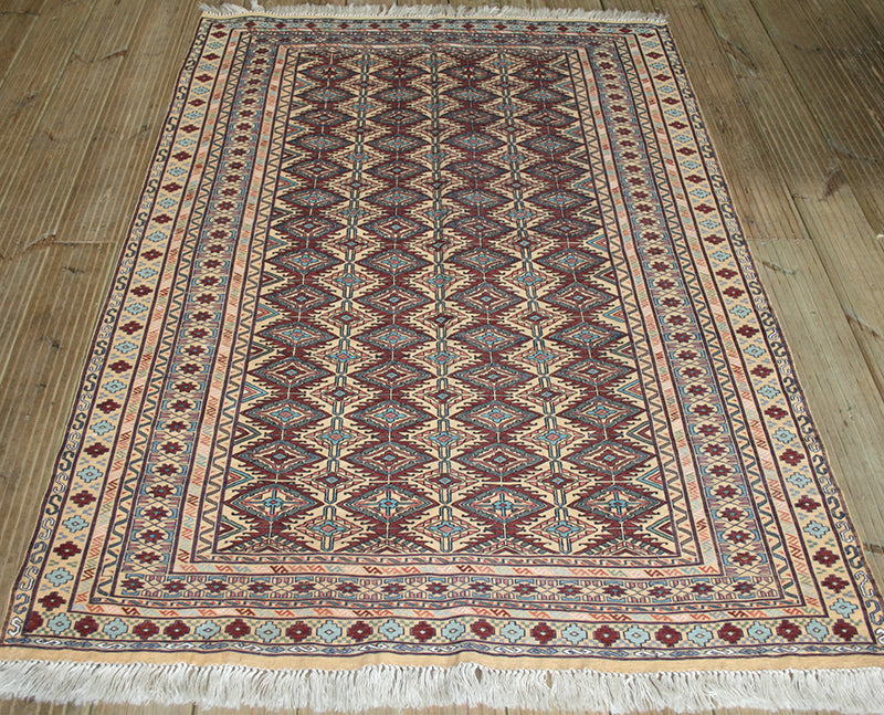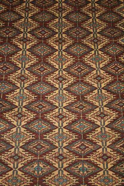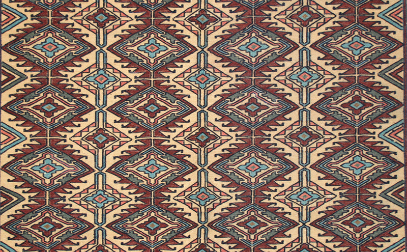 The rug's design is a harmonious blend of geometric precision and vibrant hues. Predominantly featuring a lattice of diamond-shaped motifs, it showcases a palette of warm reds, earthy browns, and subtle blues, set against a creamy background. The diamonds, a recurring motif, symbolise protection and strength, reflecting the cultural narratives woven into the fabric. The intricate borders frame the central pattern, adding layers of depth and visual interest.