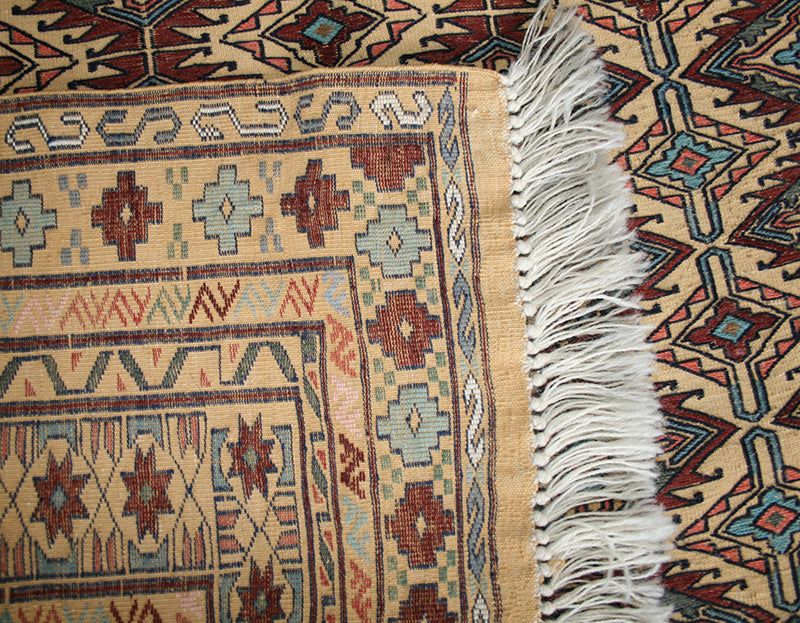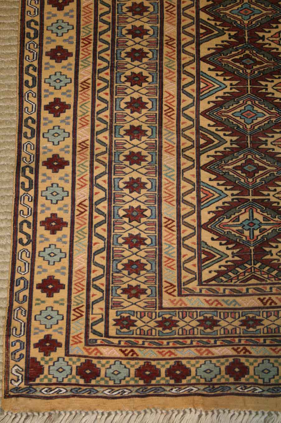 Rooted in the rich weaving traditions of the Shirvan region, this Afghan Shirvan Kilim Rug exemplifies the enduring appeal of traditional craftsmanship. While the design style hails from the Caucasus, the skilled artisans of Afghanistan have imbued this piece with a unique cultural resonance, marrying historical motifs with contemporary artistry.