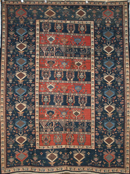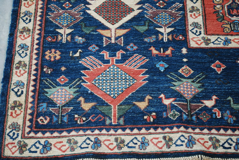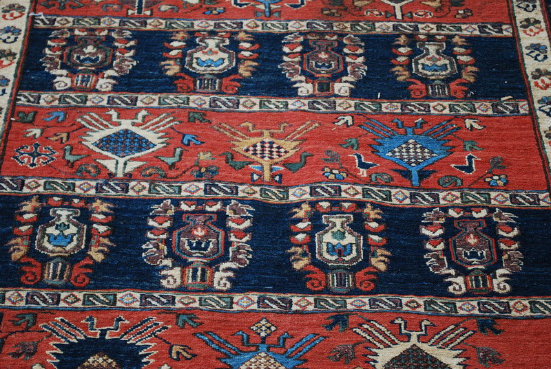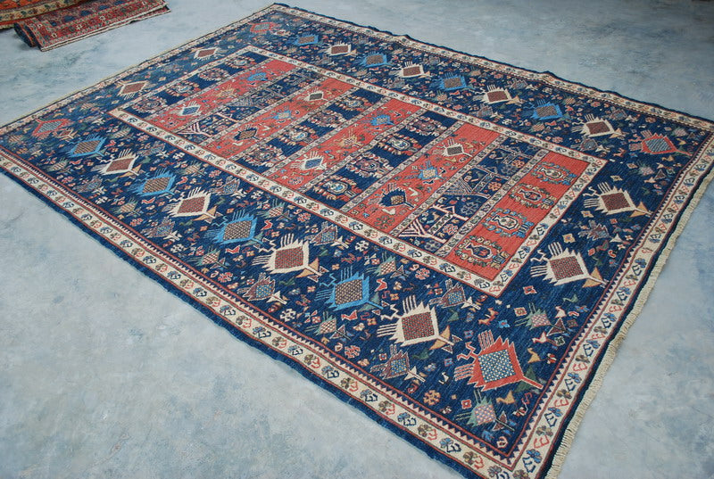 Unlike knotted rugs, Soumak weaving produces a flat, pileless surface, known for its durability and crisp definition. The navy field is boldly contrasted by rust red and ivory accents, while the serrated diamond border and ivory guard bands provide a rhythmic, grounded frame.