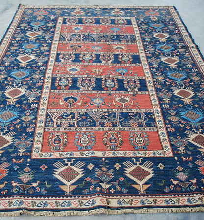 Handwoven in Afghanistan, this Soumak rug is a striking example of tribal design and practical craftsmanship. Its Panel (Khesti) layout—an ancient Persianate form—organises stylised trees, boteh-like forms, and geometric motifs into a grid of compartments, each rich with symbolism and structure.