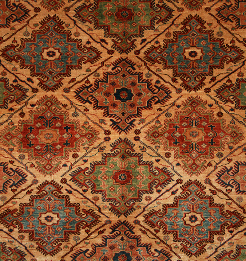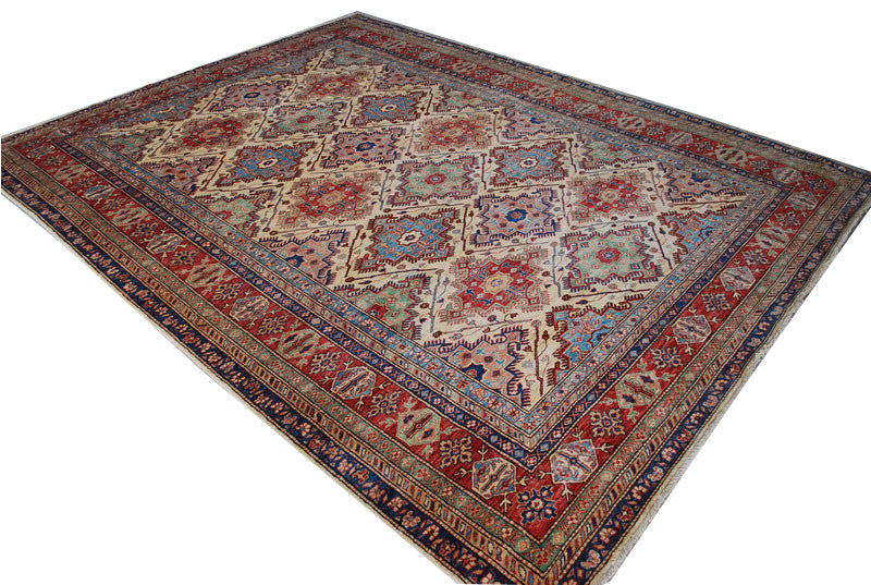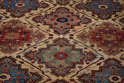 This hand-knotted Afghan Super Kazak rug is a striking tribute to tribal geometry and rich colour. Its repeat medallion layout, featuring octagonal forms within a diamond lattice, creates a bold, rhythmic structure rooted in Caucasian design traditions.