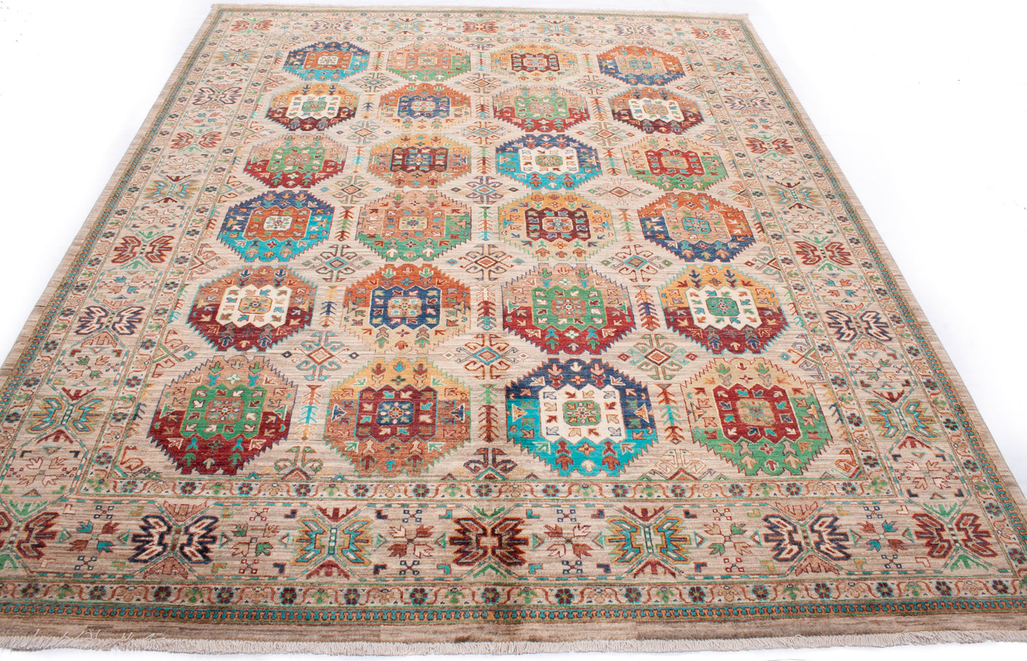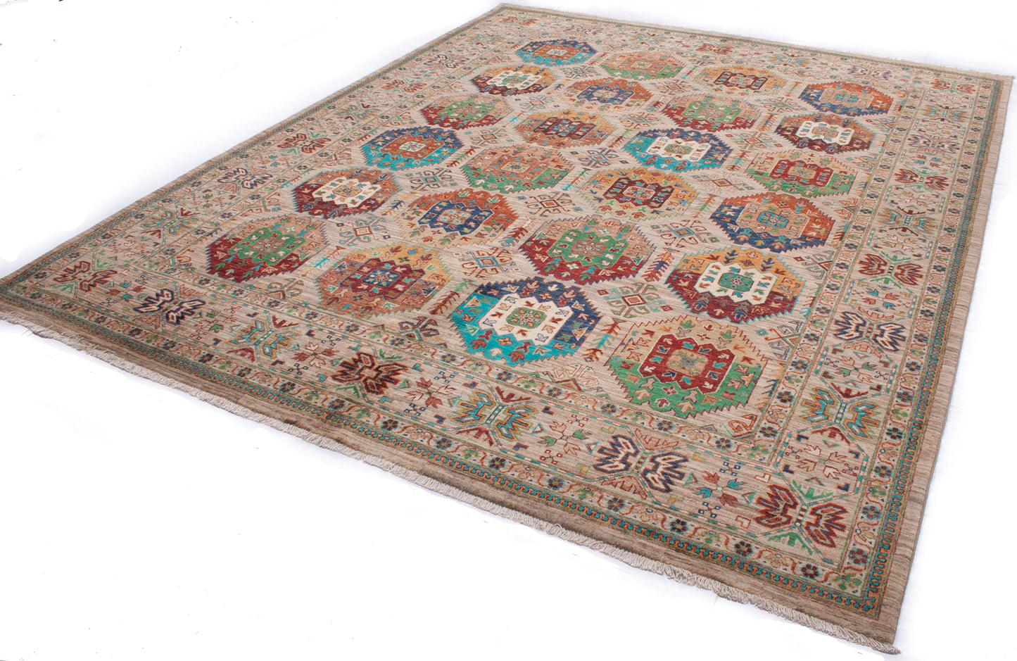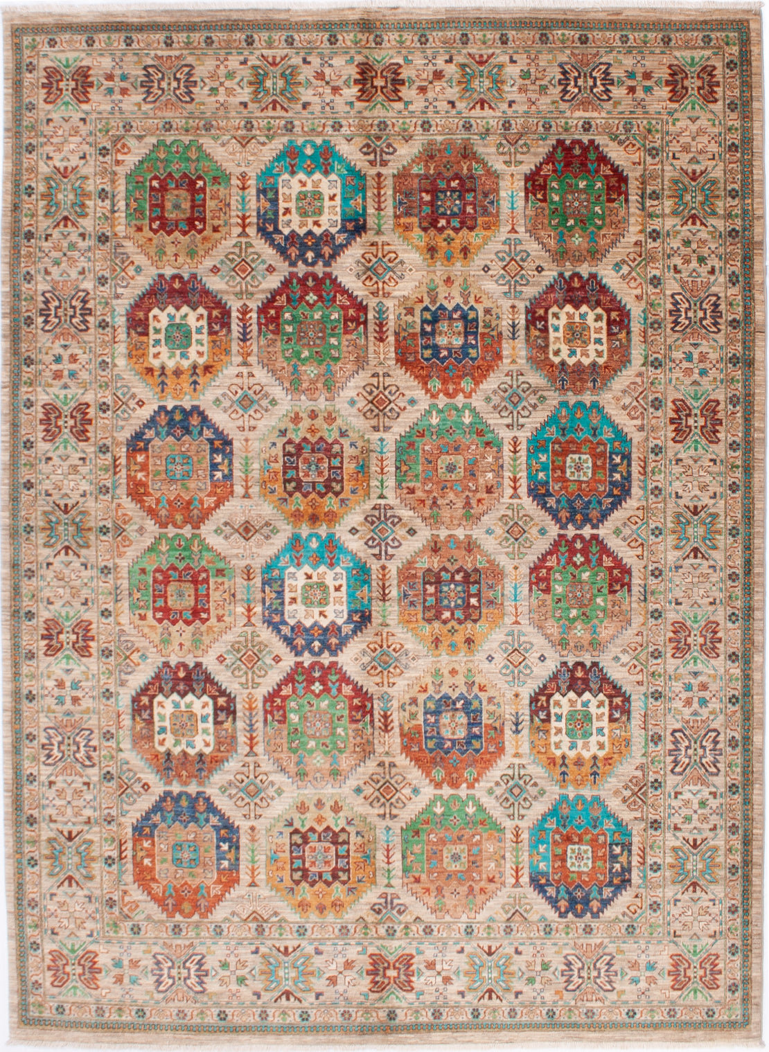 Hand-knotted in Afghanistan, this Super Kazak rug embodies the bold geometry and tribal spirit of Caucasian-inspired design. Its repeat medallion layout features octagonal forms arranged in a precise, symmetrical grid, enriched with star motifs, crosses, and stylised floral elements.