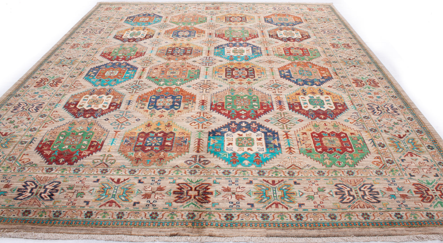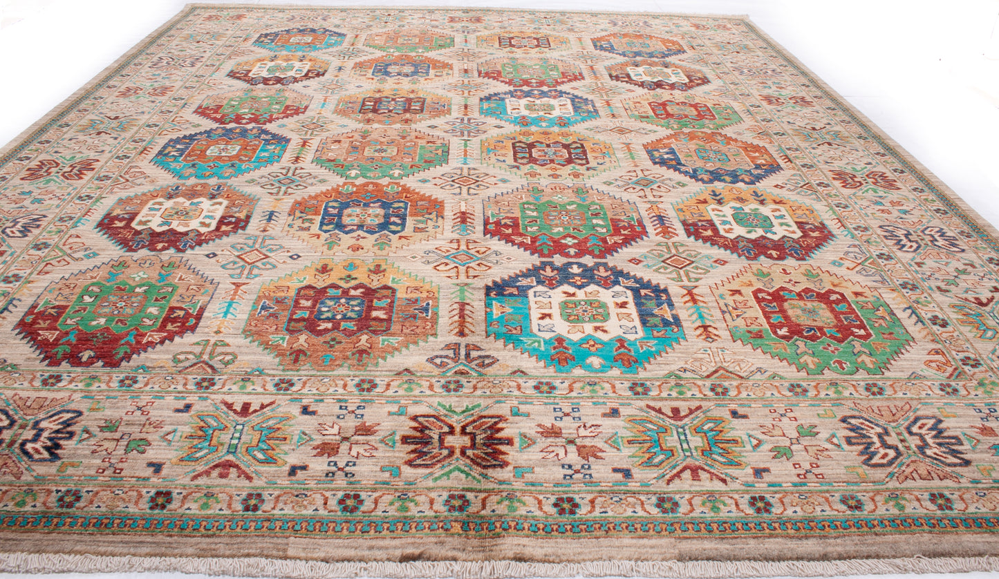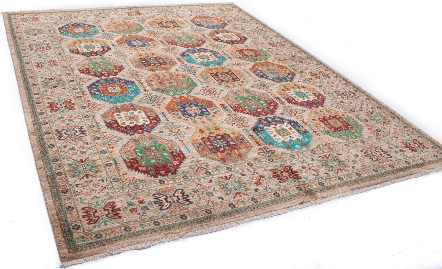 Hand-knotted in Afghanistan, this Super Kazak rug embodies the bold geometry and tribal spirit of Caucasian-inspired design. Its repeat medallion layout features octagonal forms arranged in a precise, symmetrical grid, enriched with star motifs, crosses, and stylised floral elements.