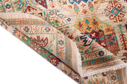 The earthy palette of beige, teal, and rust red is softened by tones of sage green, walnut brown, and cream, with accents of burnt orange and navy adding subtle depth. A beige main border, adorned with geometric and floral motifs, frames the field with balance and clarity, supported by finely detailed guard bands.