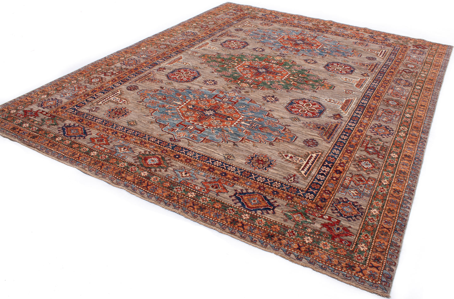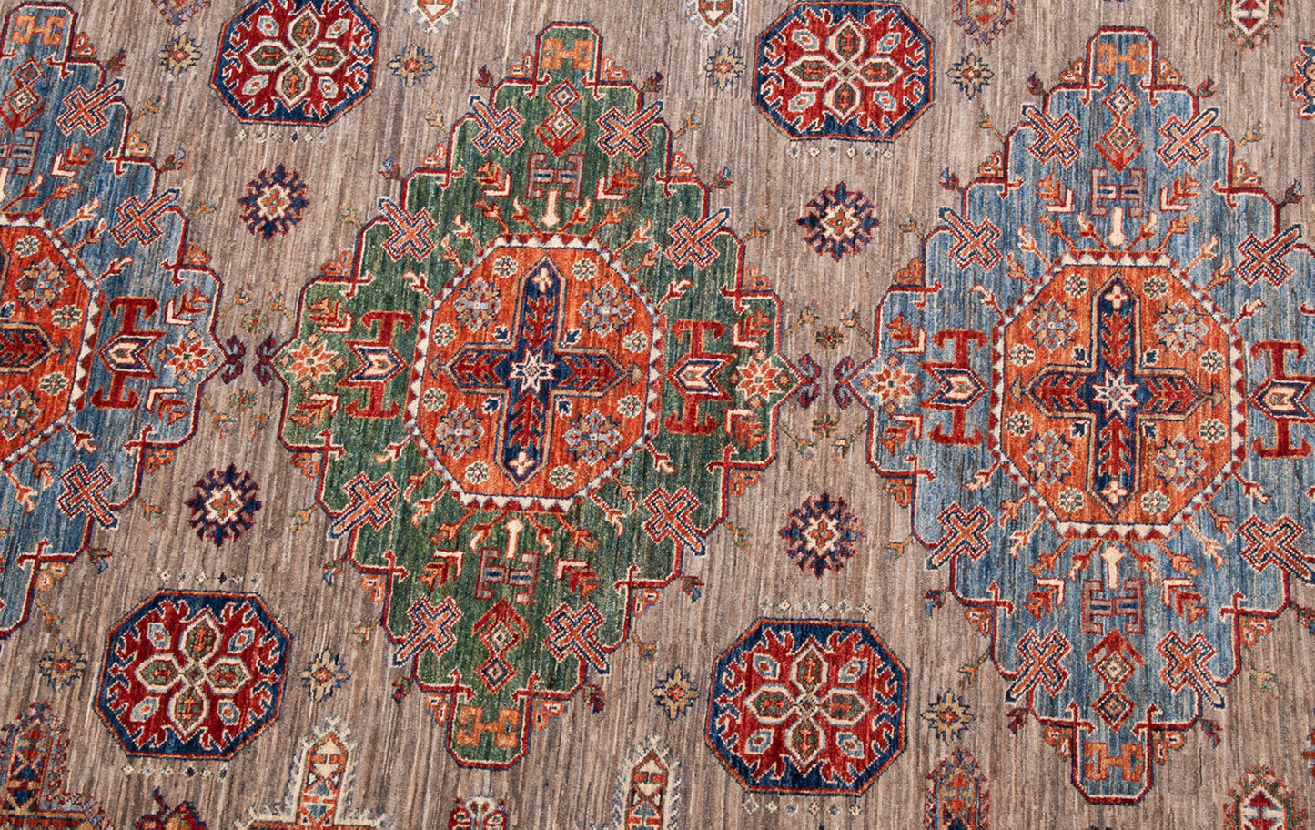 This hand-knotted Afghan Super Kazak rug pays homage to the tribal weaving traditions of the Caucasus, reinterpreted with Afghan craftsmanship. Its repeat medallion layout—featuring octagonal forms, floral rosettes, and angular extensions—creates a bold, symmetrical rhythm across the earthy taupe field.