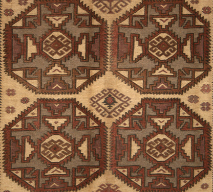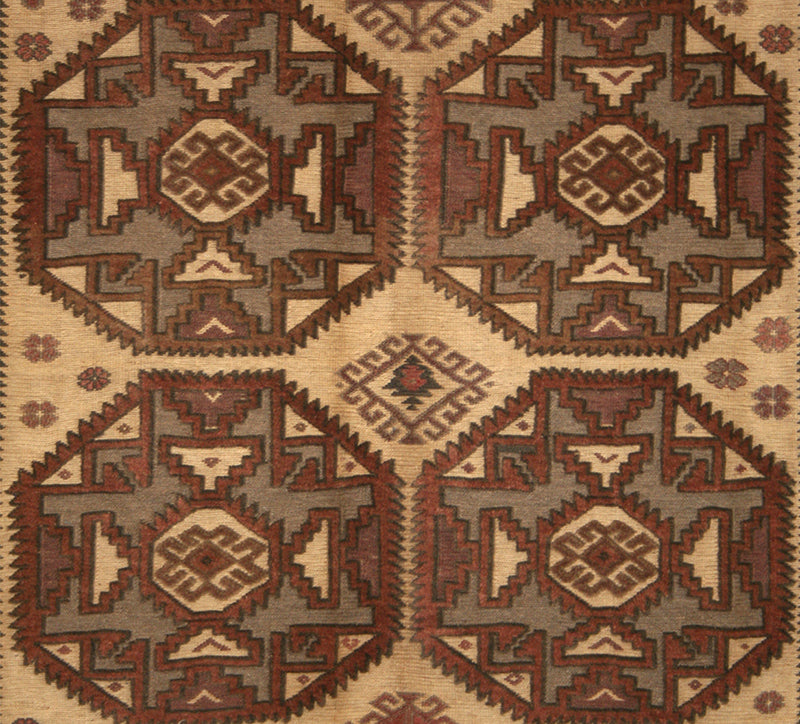 This Afghan Taimani rug is a striking blend of hand-knotted durability and Kilim versatility, woven in the tribal regions of Taimani, Afghanistan. Its repeat medallion layout features octagonal forms filled with octagram motifs, serrated edges, and rosette details—creating a rhythmic, symmetrical composition rooted in tribal symbolism.