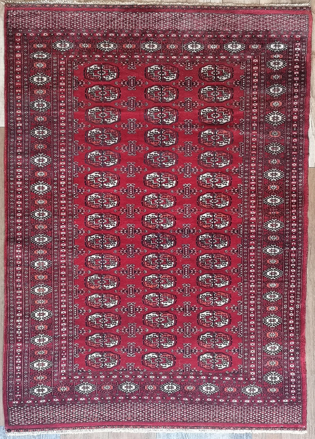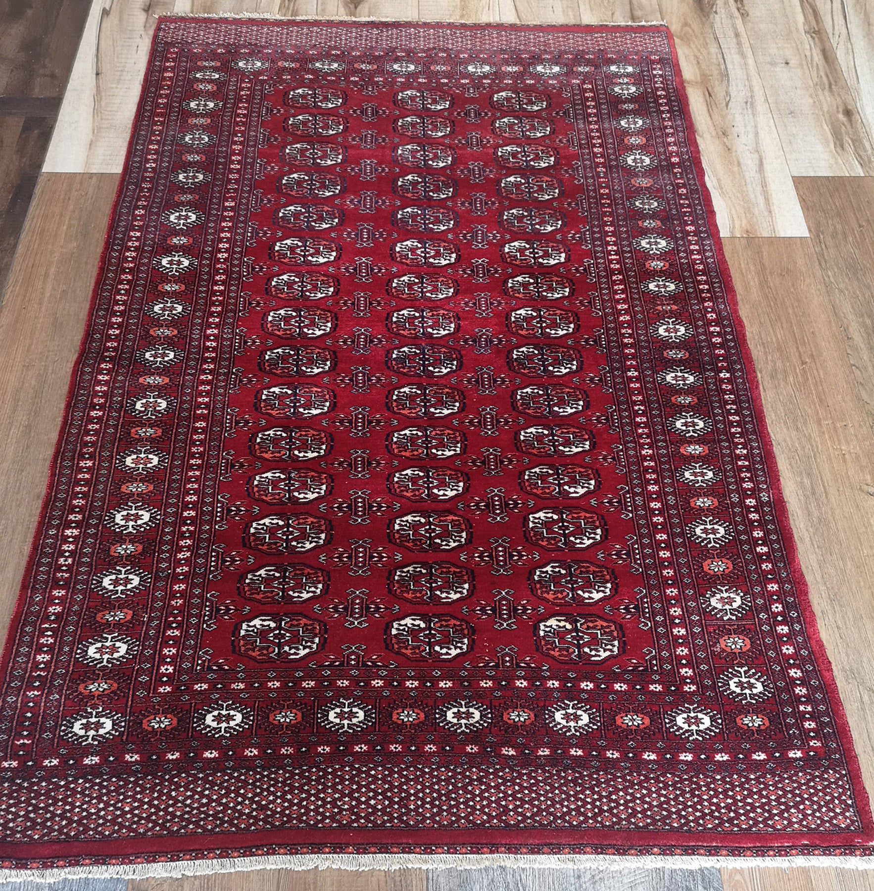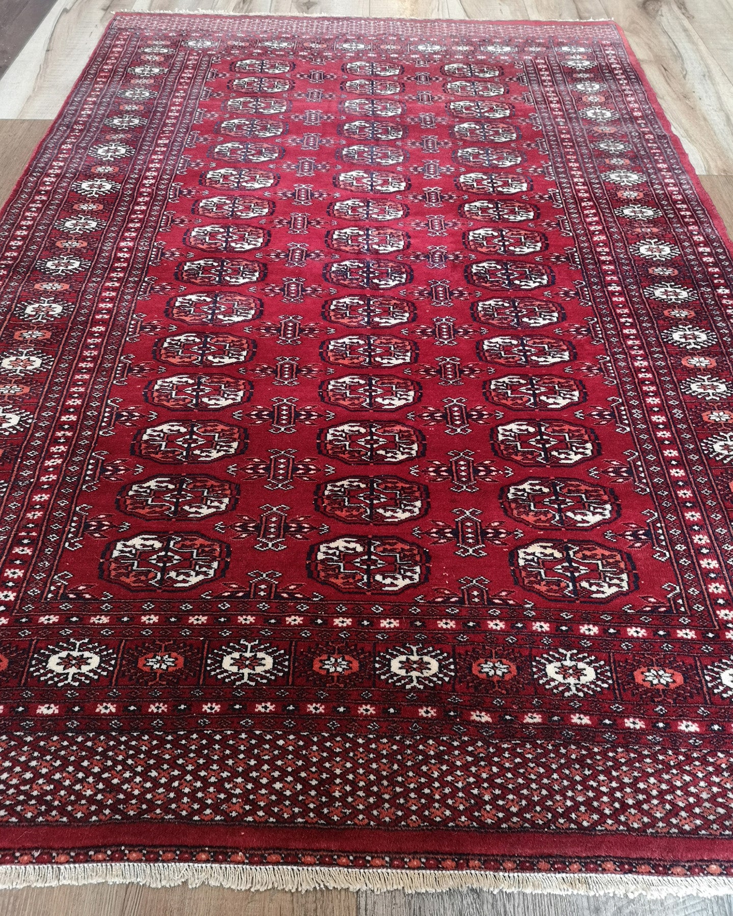 This hand-knotted Afghan Turkmen rug captures the essence of tribal weaving, rooted in tradition and symmetry. Its repeat medallion layout features the iconic Gul motif—bold, geometric, and meticulously arranged across a deep crimson field.