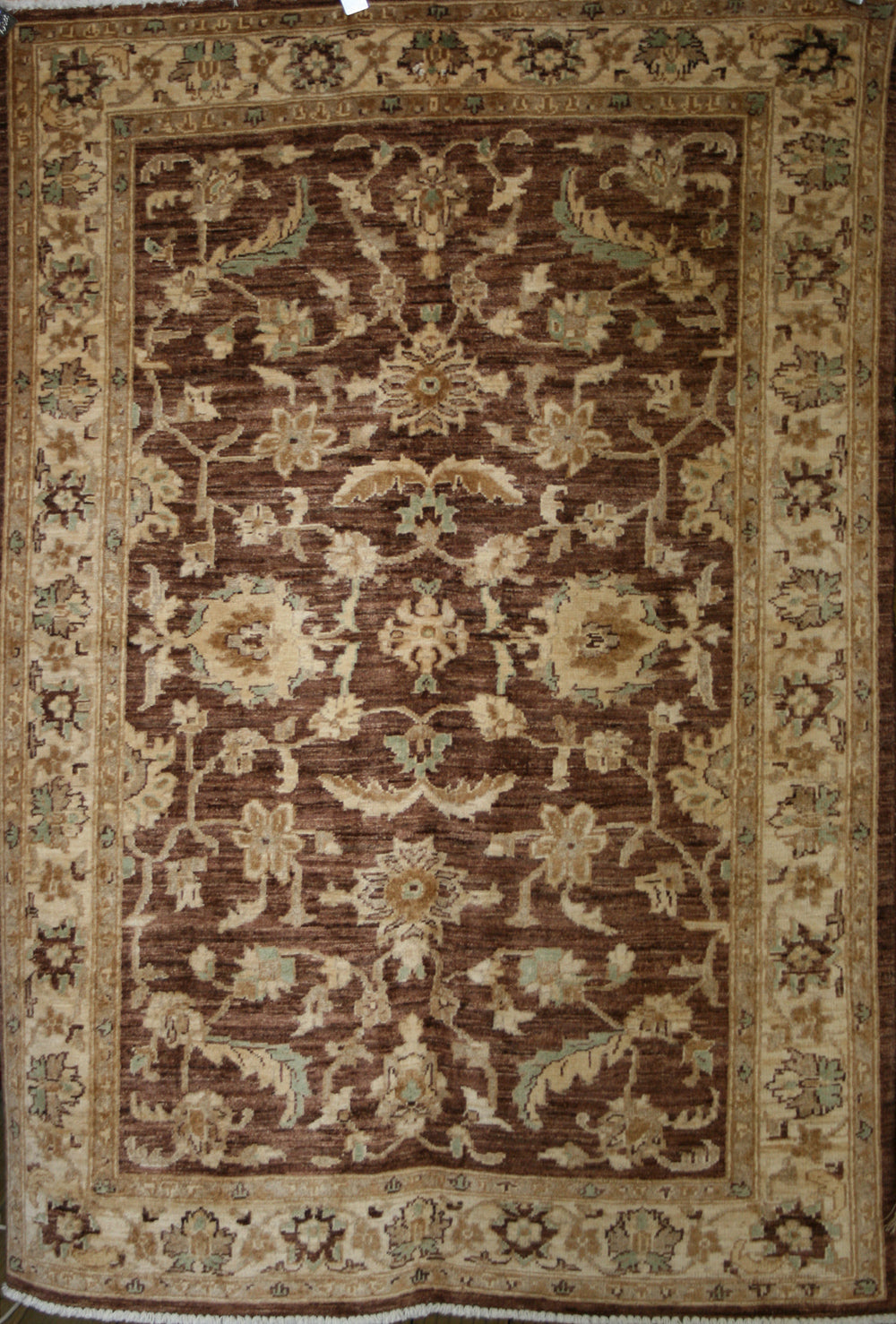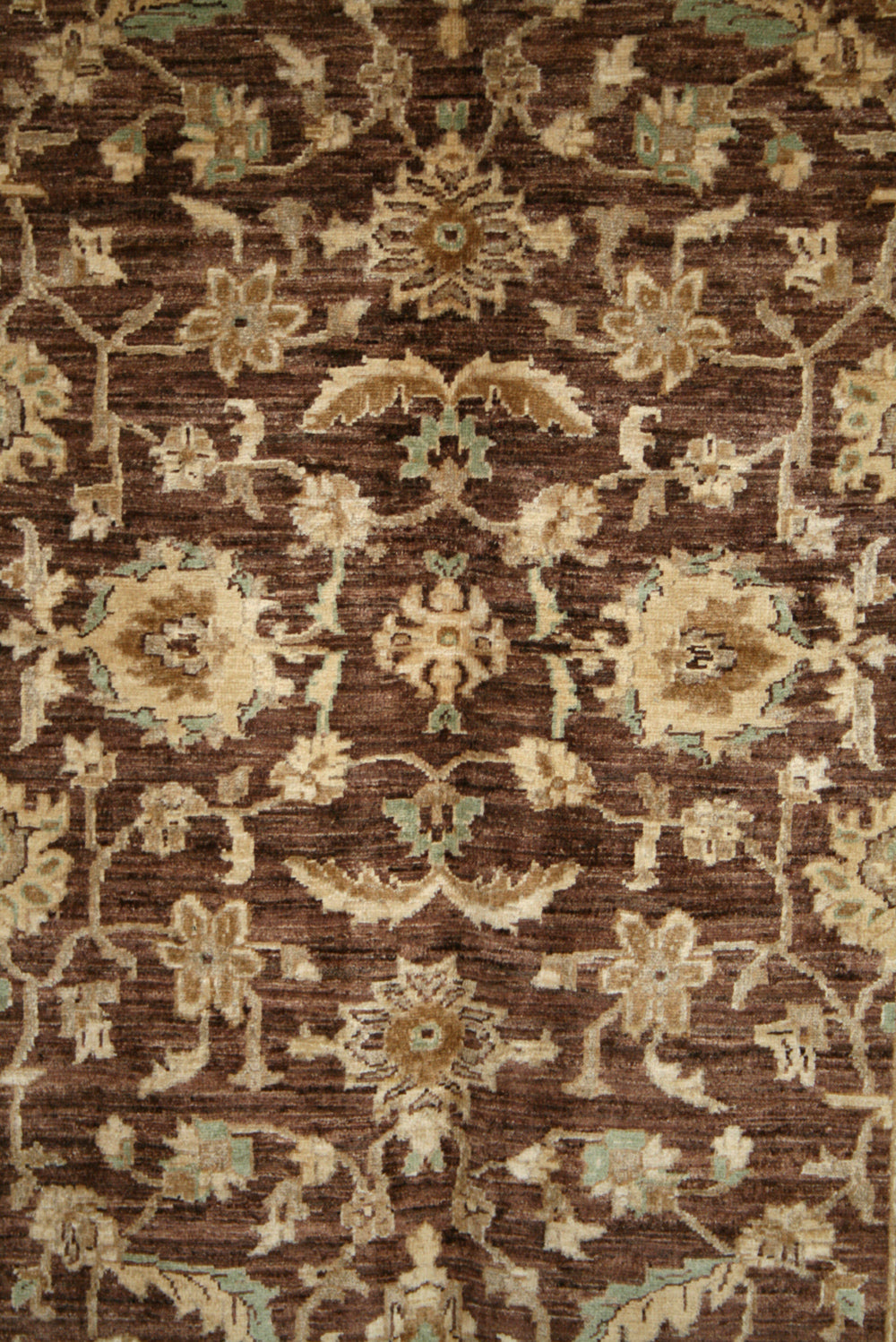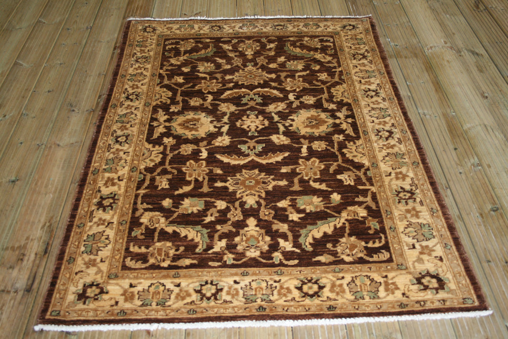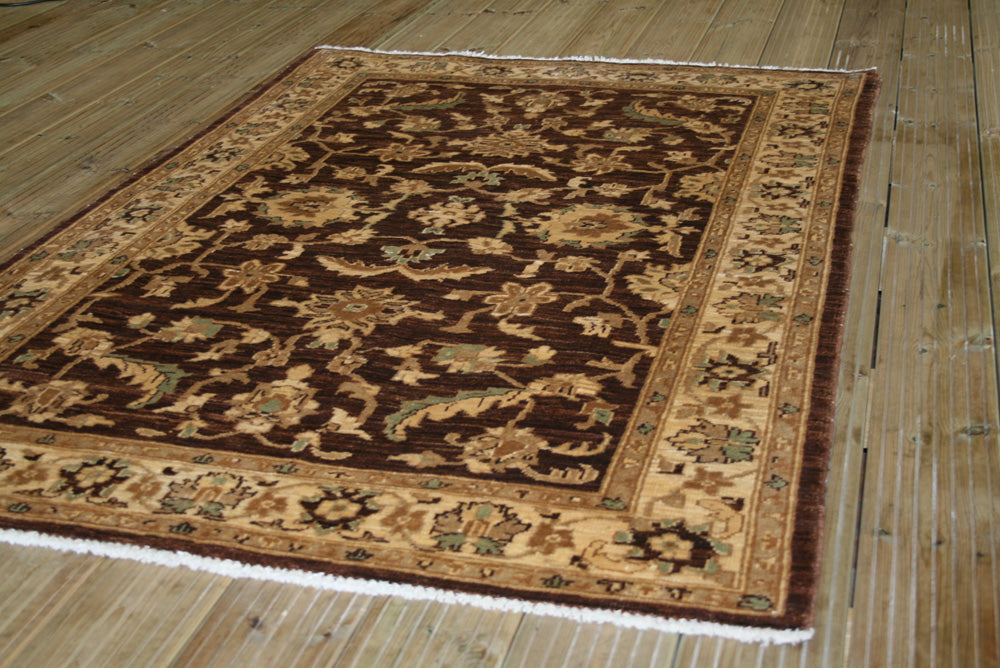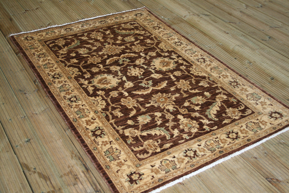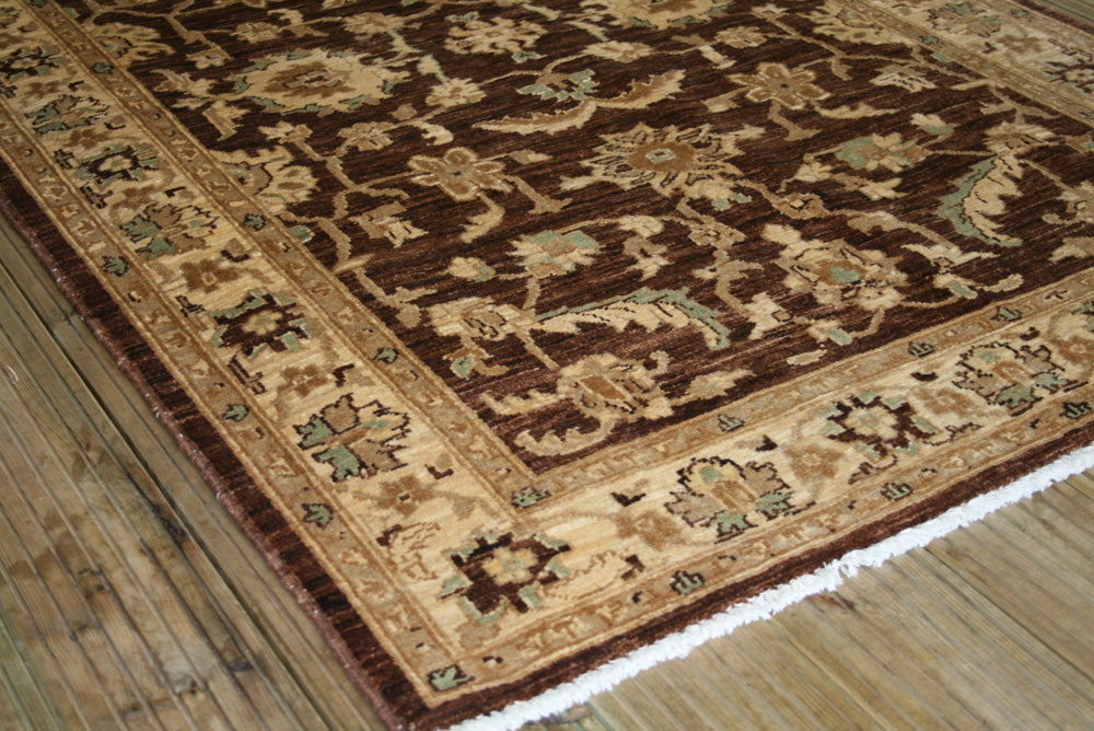 The rug's design is a sophisticated interplay of floral and botanical motifs, rendered in a palette of earthy browns and muted golds. The central field is adorned with stylised floral patterns that evoke a sense of organic elegance, reminiscent of the Herati motif, although more simplified and abstract in form. The border complements the central design with a series of repeating floral elements, creating a frame that enhances the overall visual harmony. The subtle contrast between the rich background and the delicate motifs highlights the intricate craftsmanship that defines the Ziegler tradition.