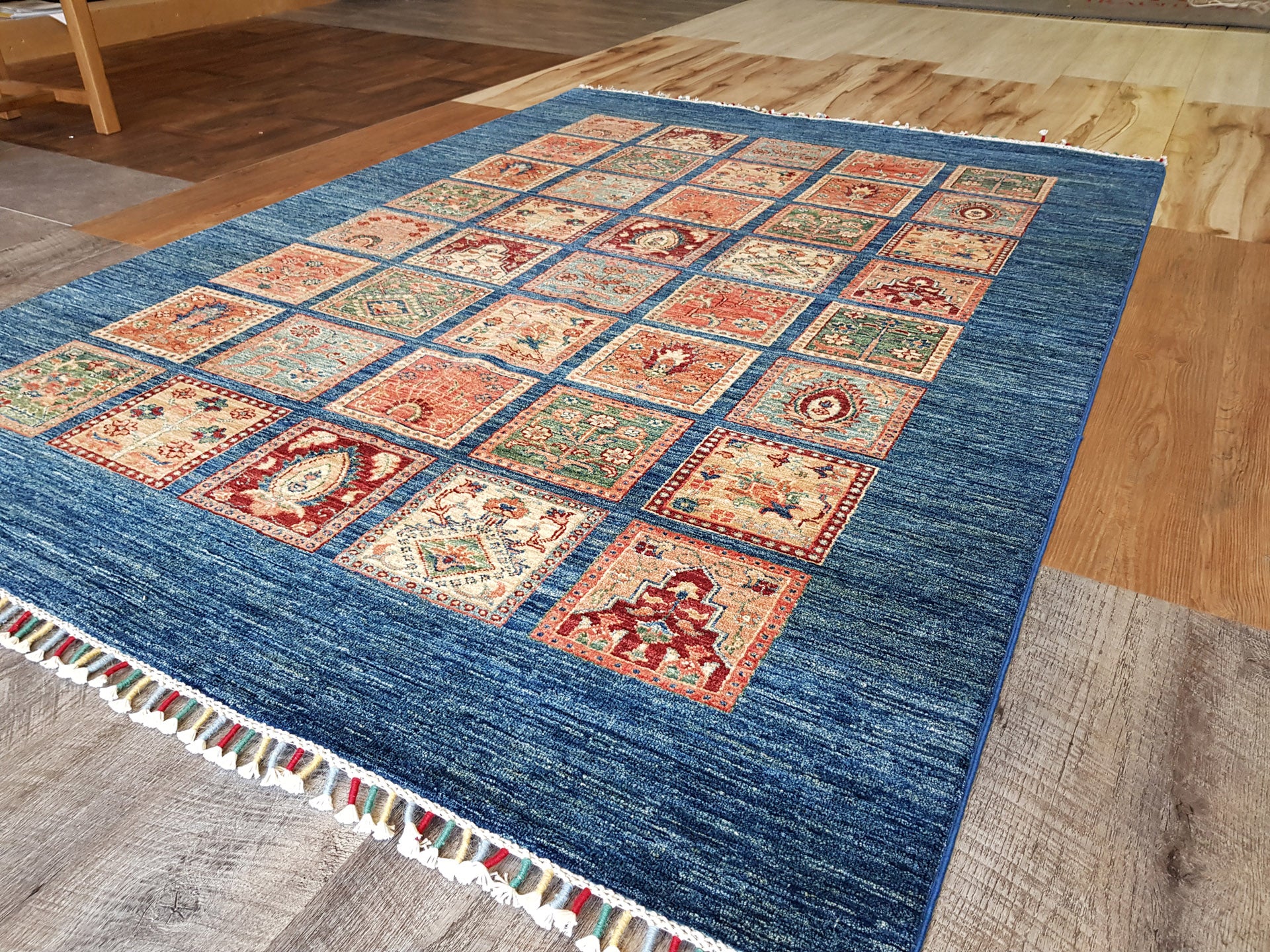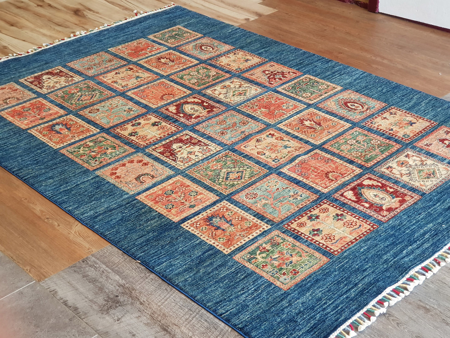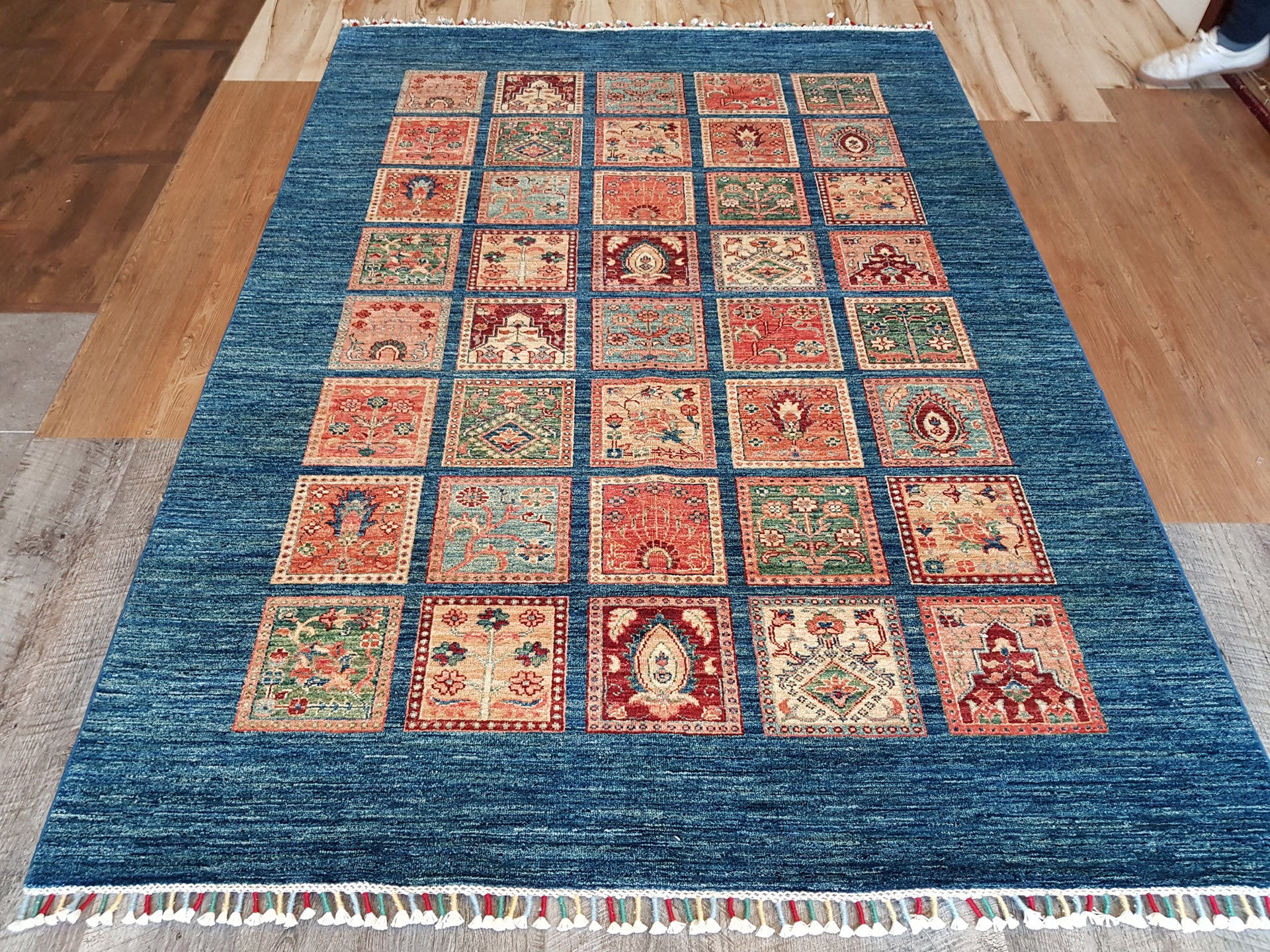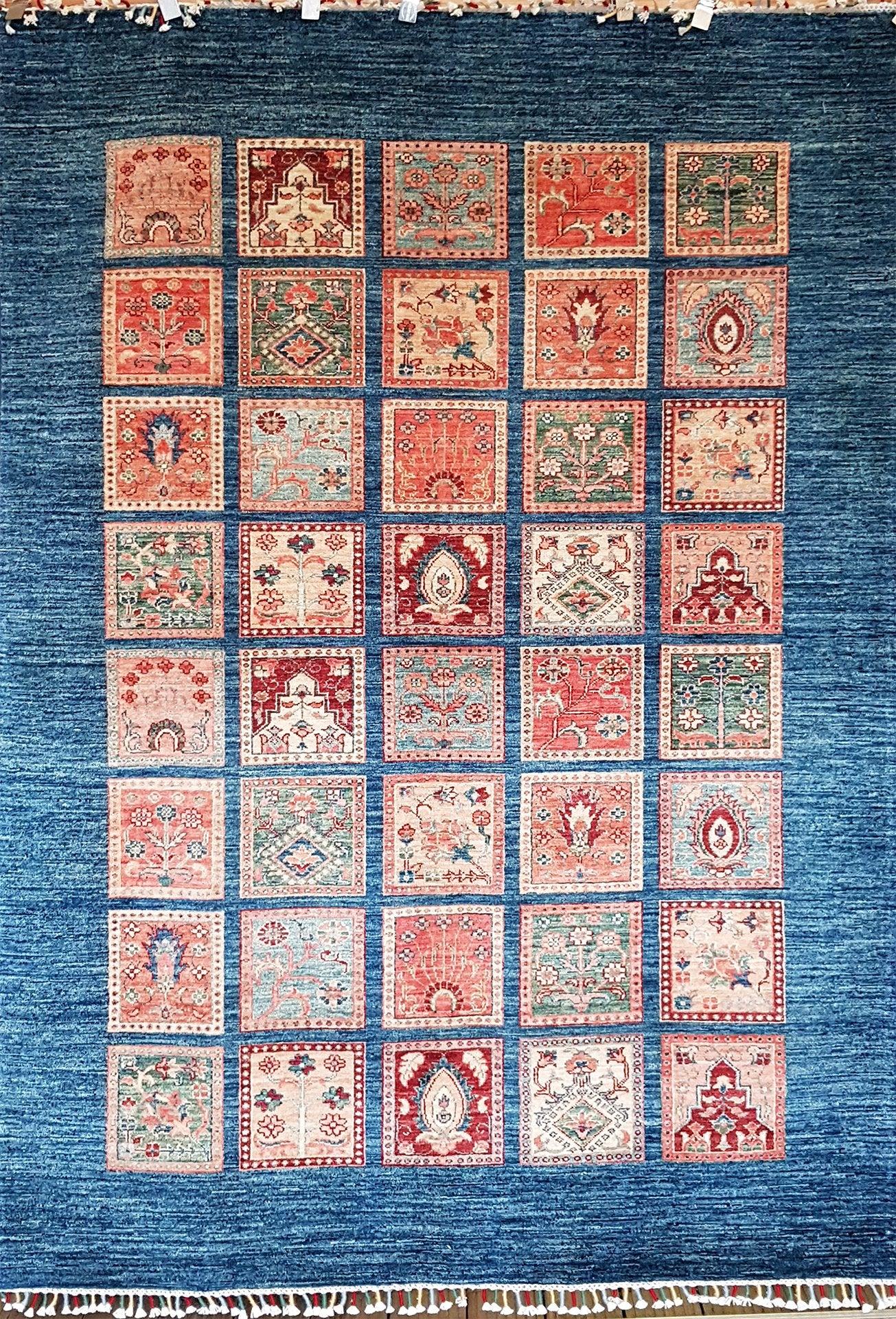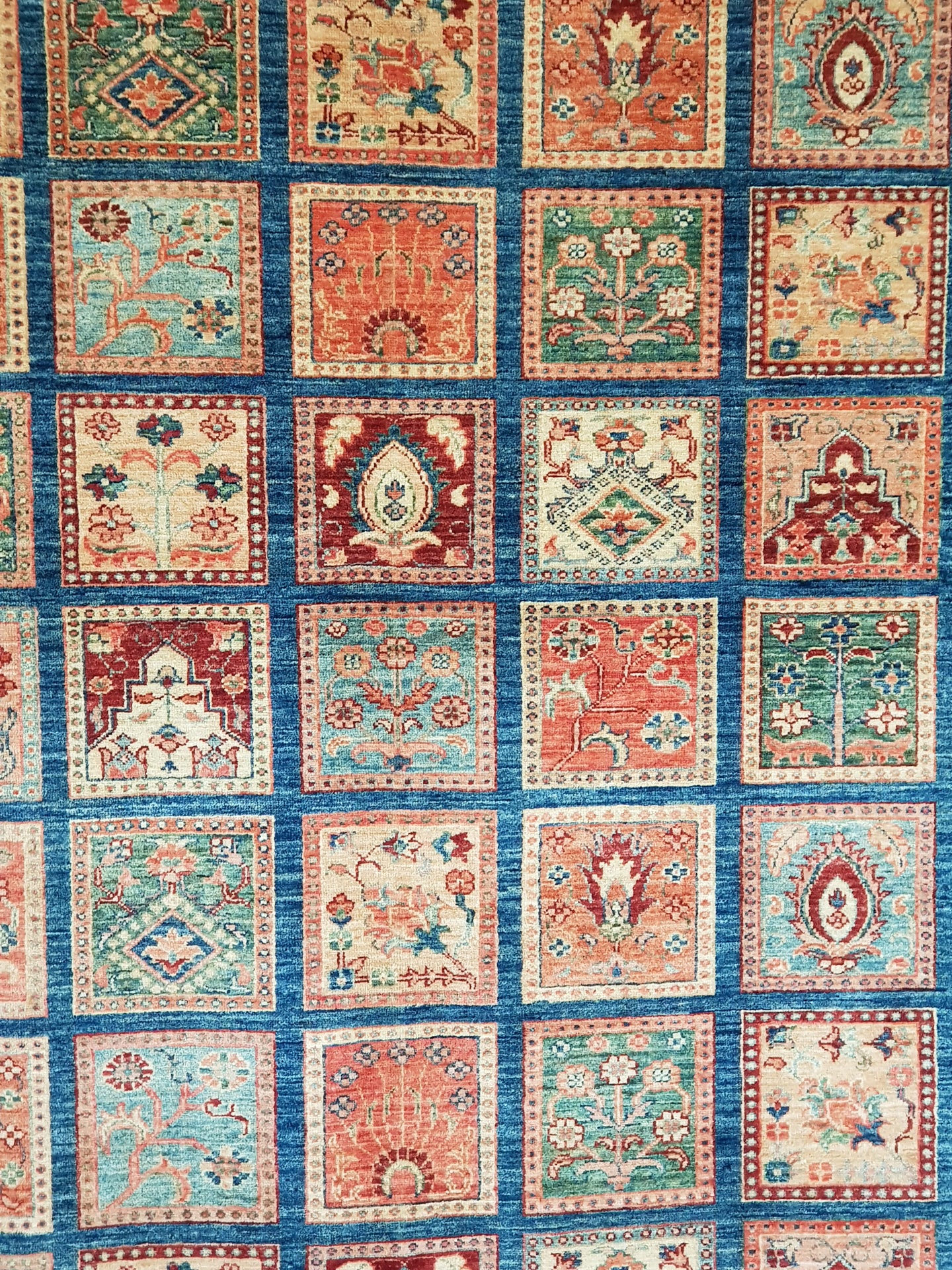 This hand-knotted Afghan Ziegler rug features a striking Panel (Khesti) design, where geometric compartments frame an array of motifs including boteh, floral sprays, palmettes, and stylised trees. Some squares echo architectural forms, resembling mihrabs, adding a sense of symbolism to the structure.