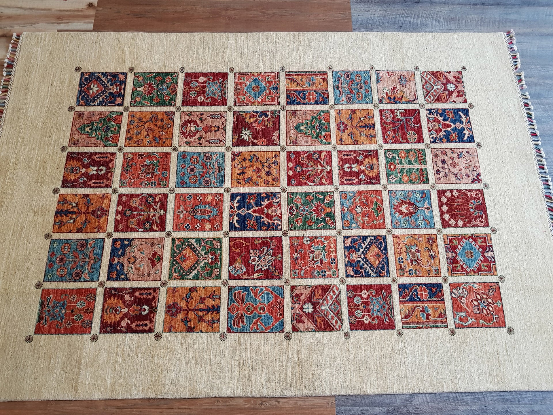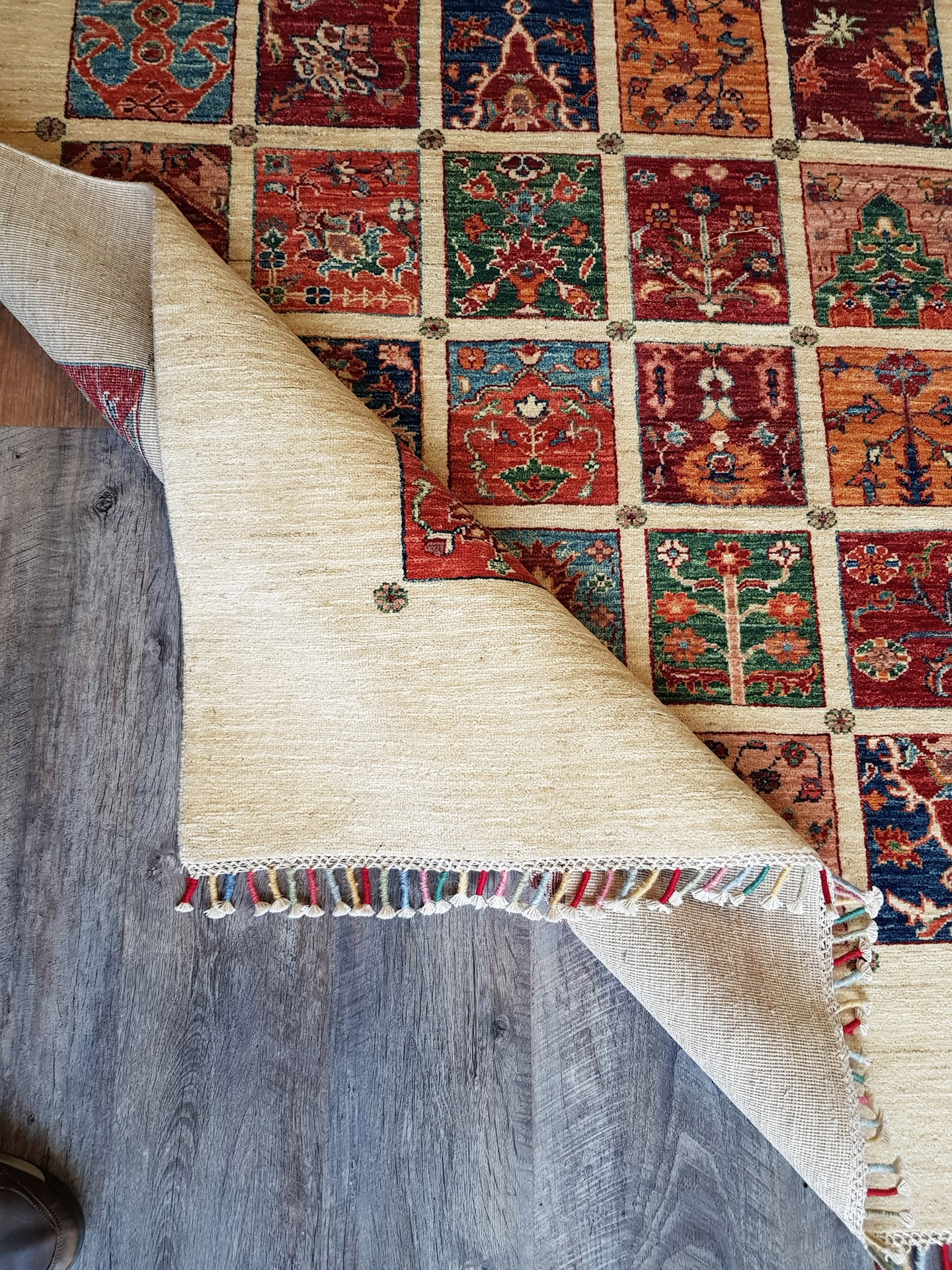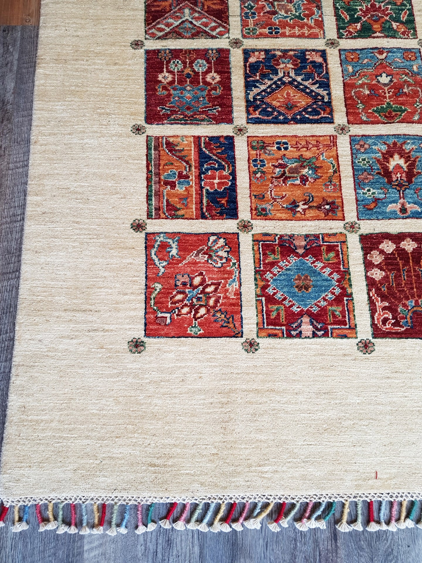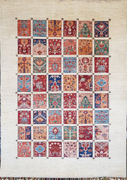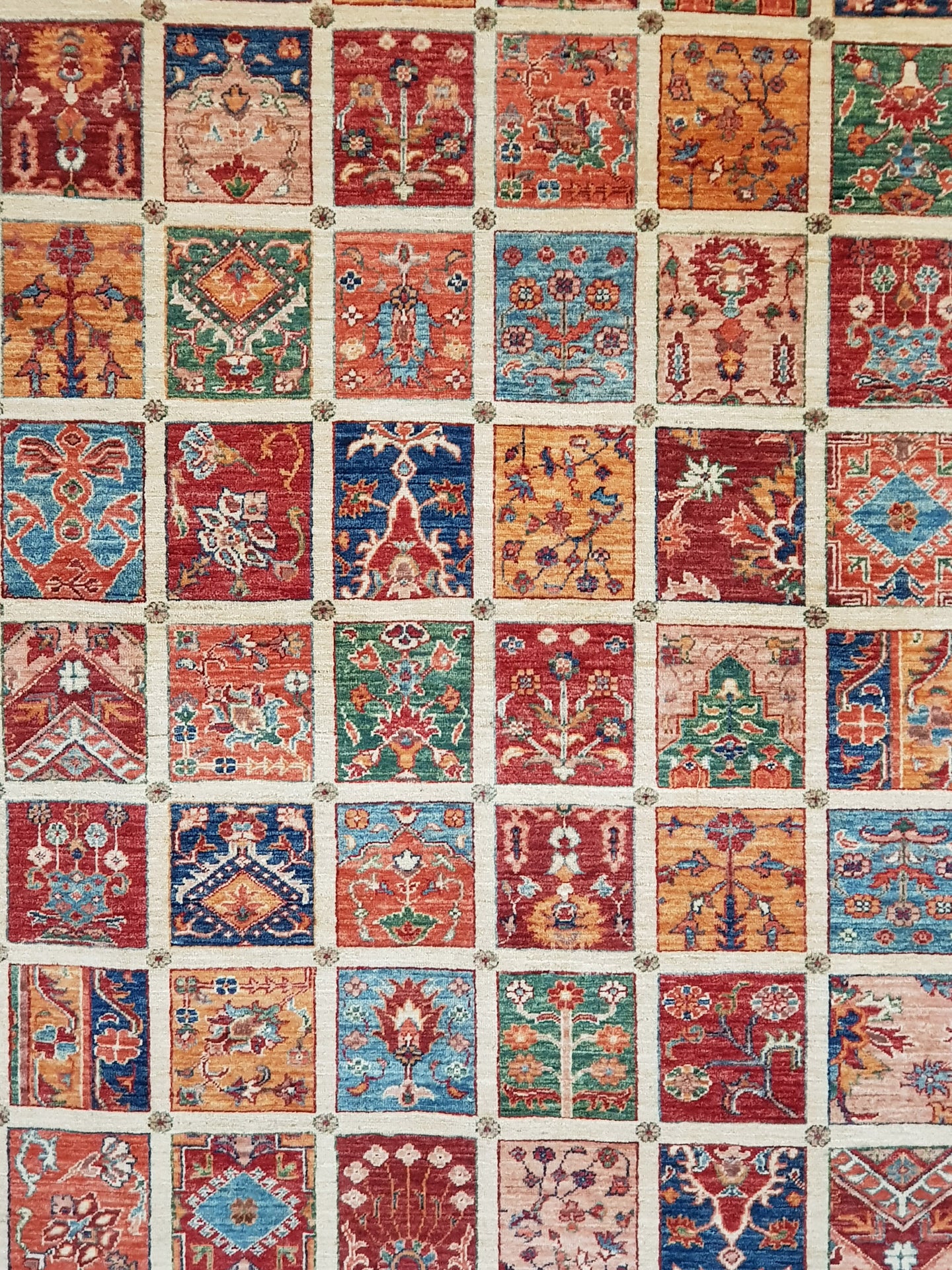 This hand-knotted Afghan Ziegler rug features a striking Panel (Khesti) design, where each compartment forms a self-contained vignette of palmettes, lotus flowers, stylised trees, and boteh forms. The grid layout offers a structured yet dynamic aesthetic, blending geometric precision with floral richness.