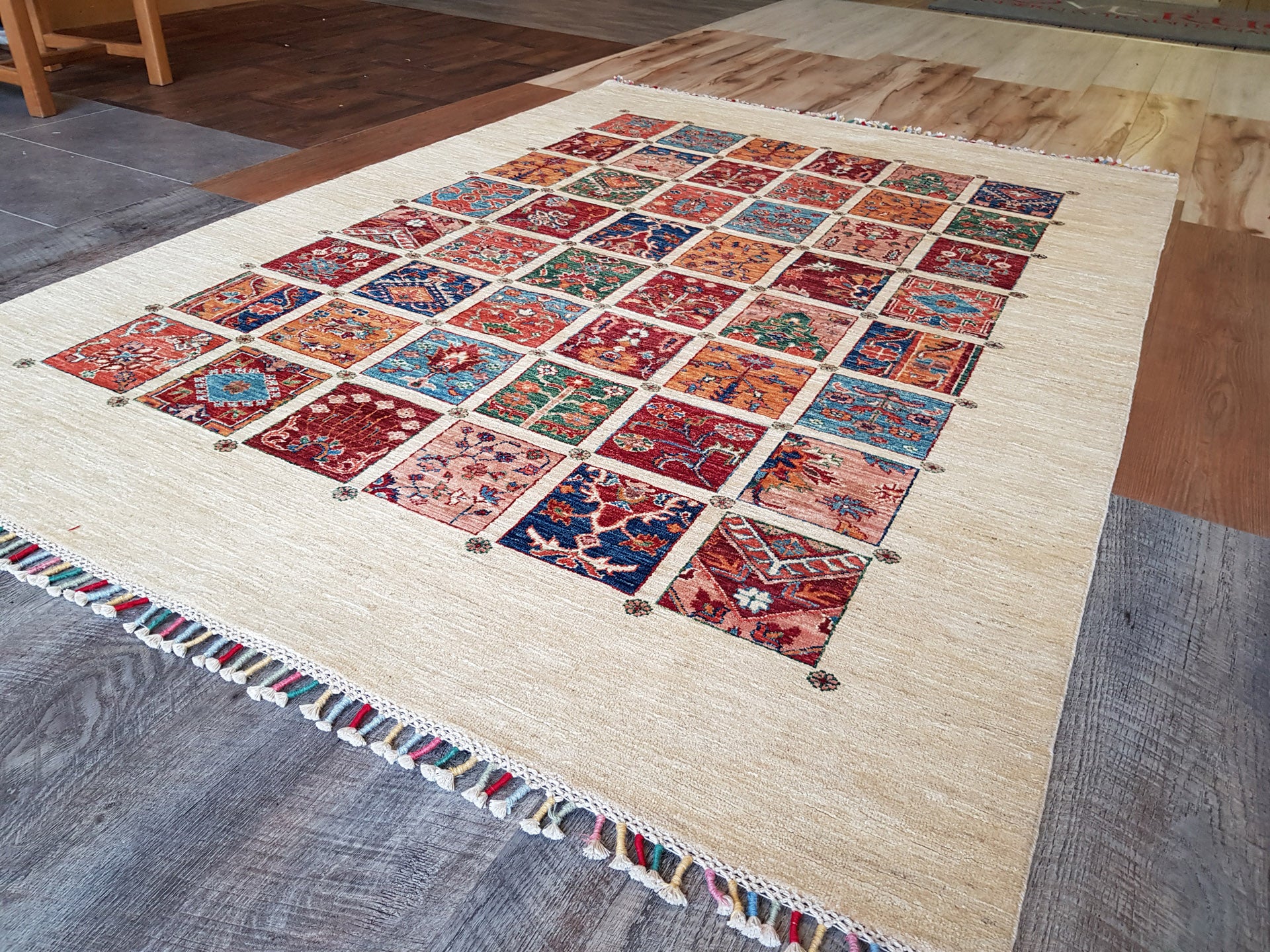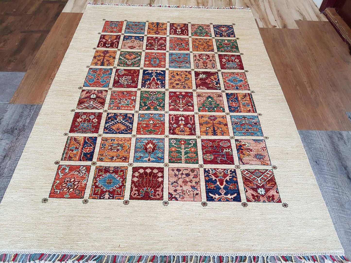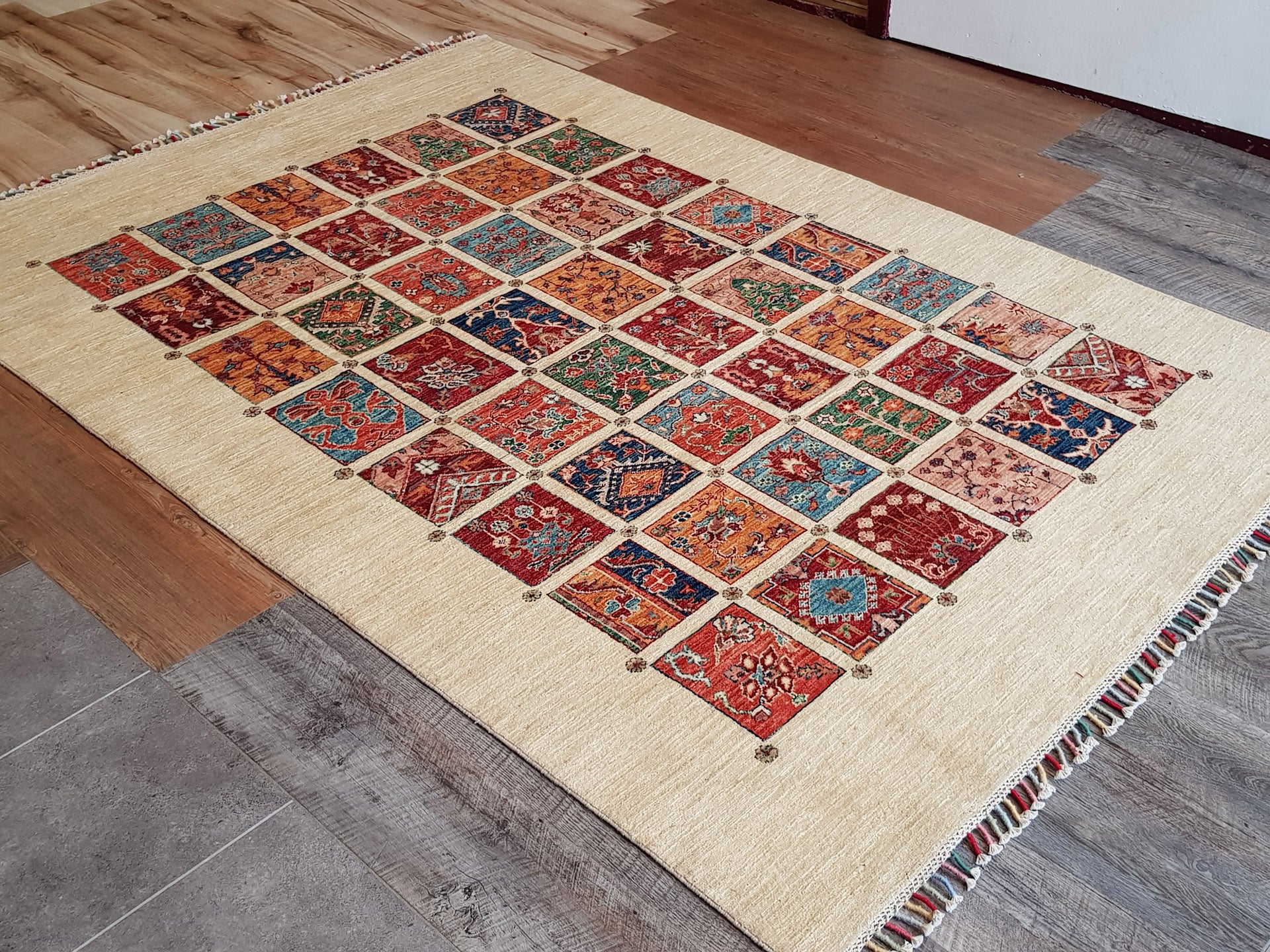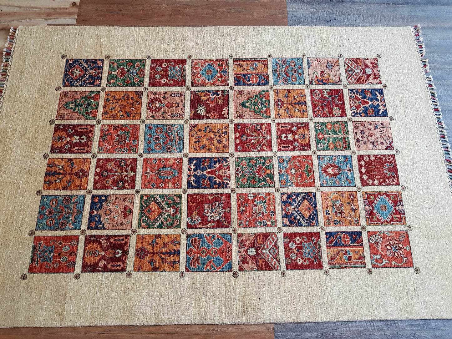 This hand-knotted Afghan Ziegler rug features a striking Panel (Khesti) design, where each compartment forms a self-contained vignette of palmettes, lotus flowers, stylised trees, and boteh forms. The grid layout offers a structured yet dynamic aesthetic, blending geometric precision with floral richness.