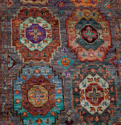 The earthy palette of slate grey, teal, burnt orange, and mustard yellow is enriched with touches of burgundy, lavender, and coral, offering depth without overwhelming the eye. The slate grey field provides a grounding backdrop for the vibrant medallions, while the rosette-framed border adds structure and refinement.
