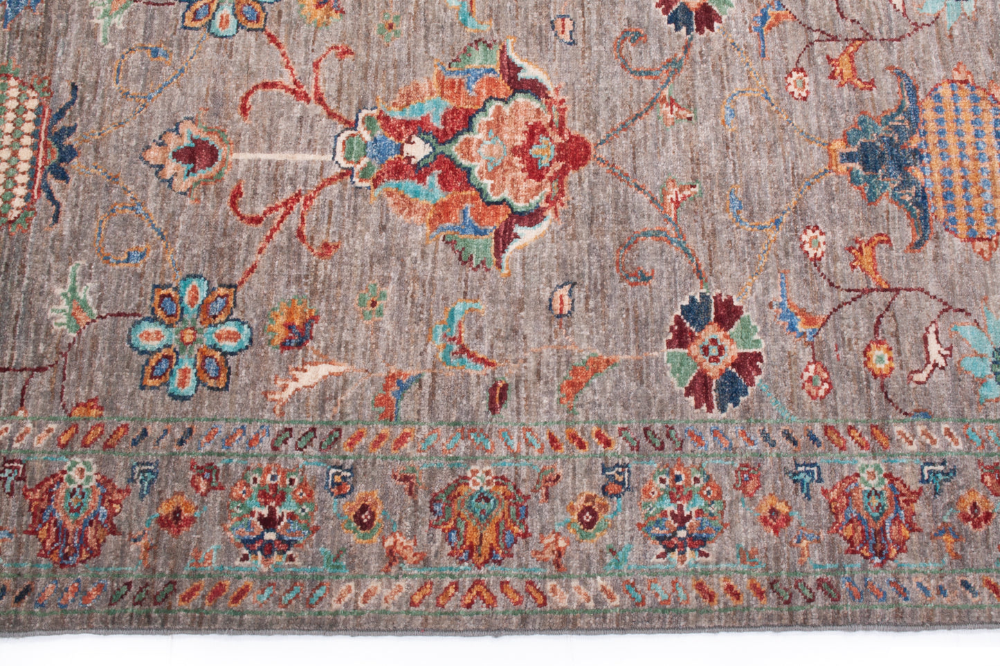 The earthy palette of warm taupe, teal, burnt orange, and deep red is softened by accents of ivory and sage green, creating a warm and inviting feel. The taupe main border, adorned with floral and vine motifs, is framed by delicate guard bands that add subtle structure to the design.
