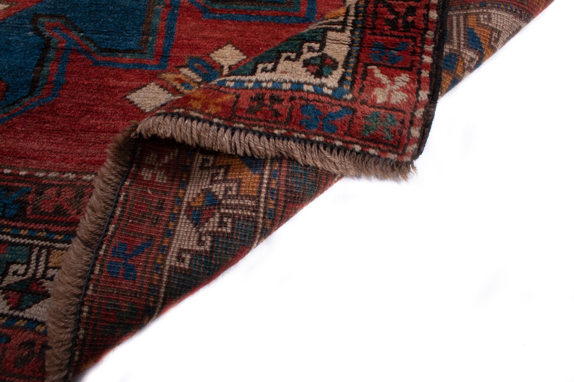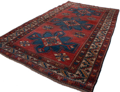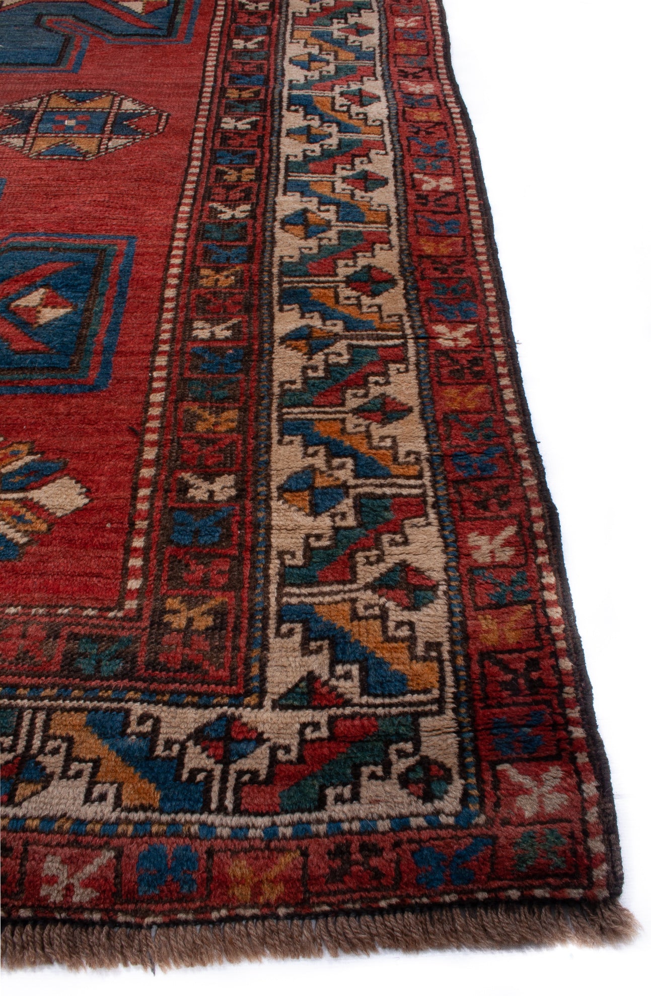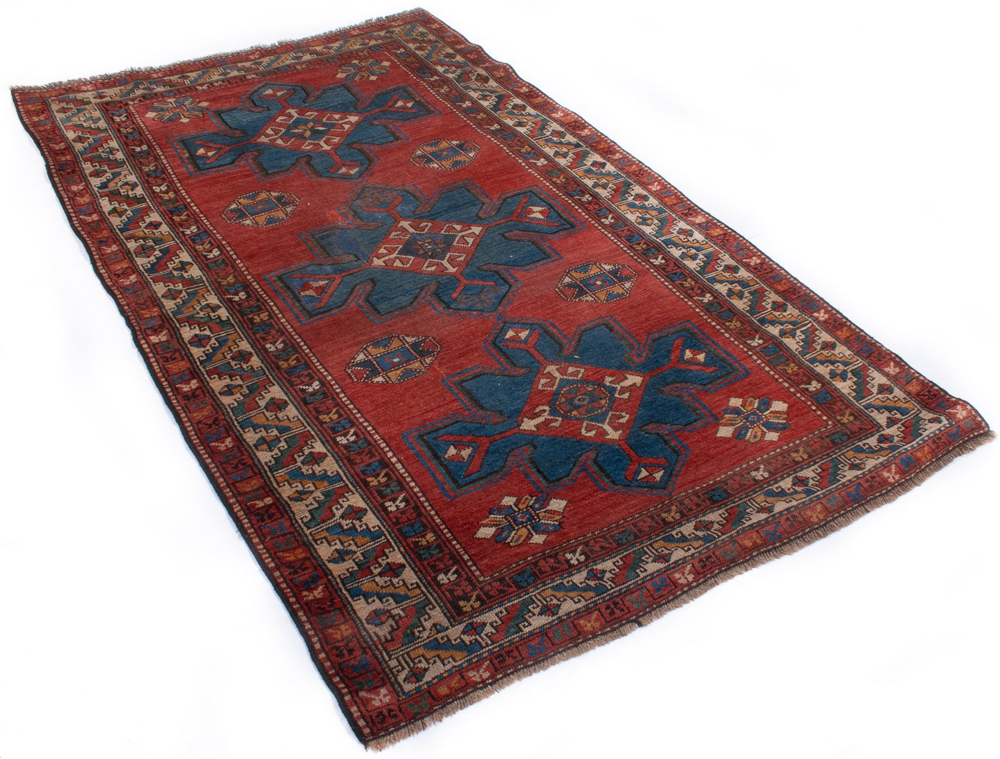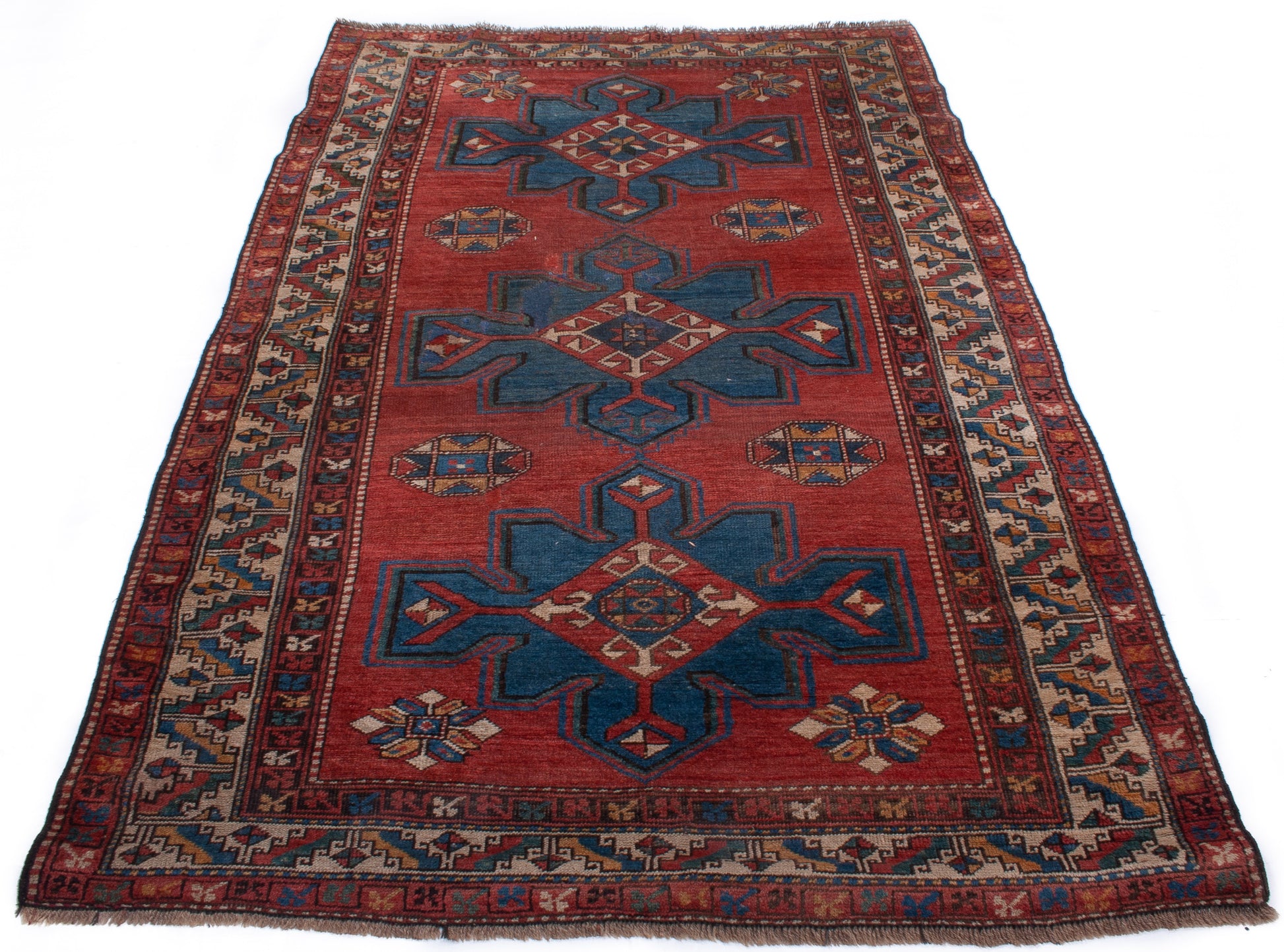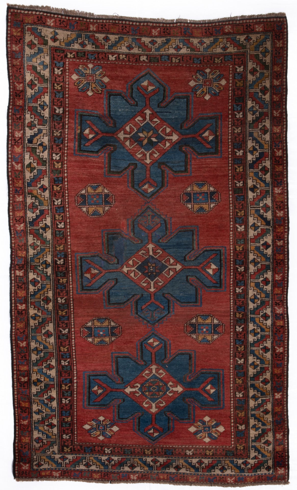 This antique Caucasian rug embodies the bold geometry and symbolic richness of tribal weaving. Its repeat medallion design features star-shaped motifs with angular extensions, arranged in a spacious, vertically aligned layout that emphasises symmetry and structure.
