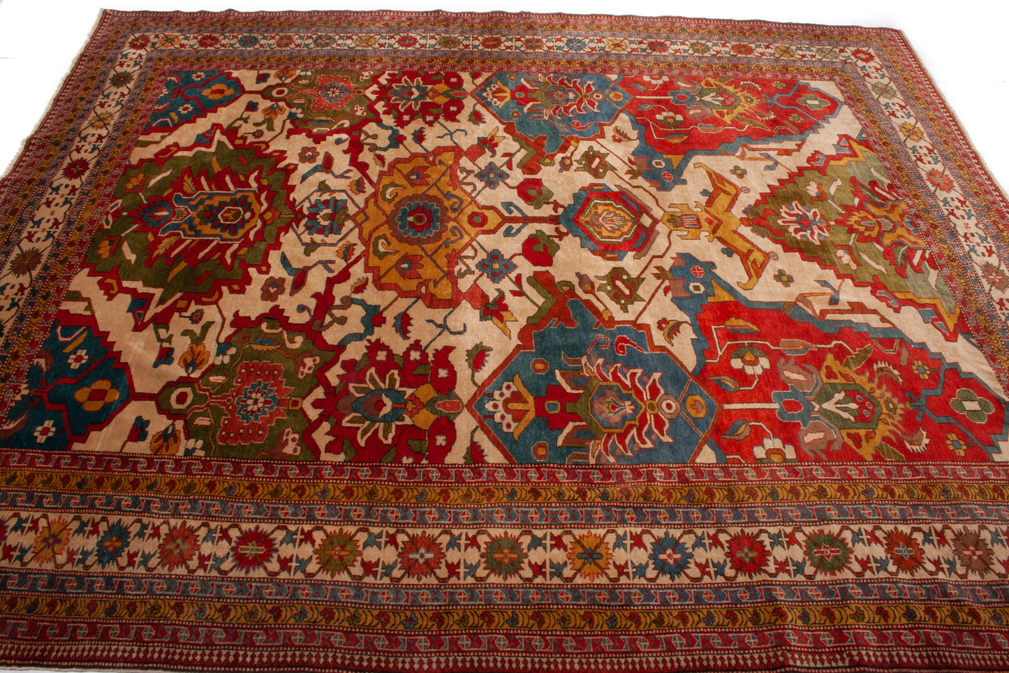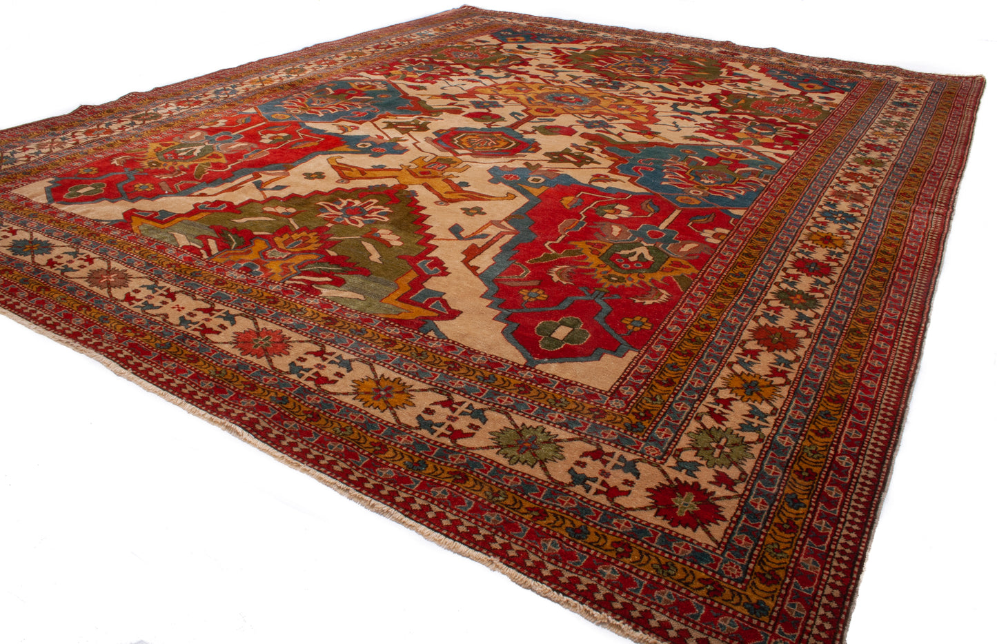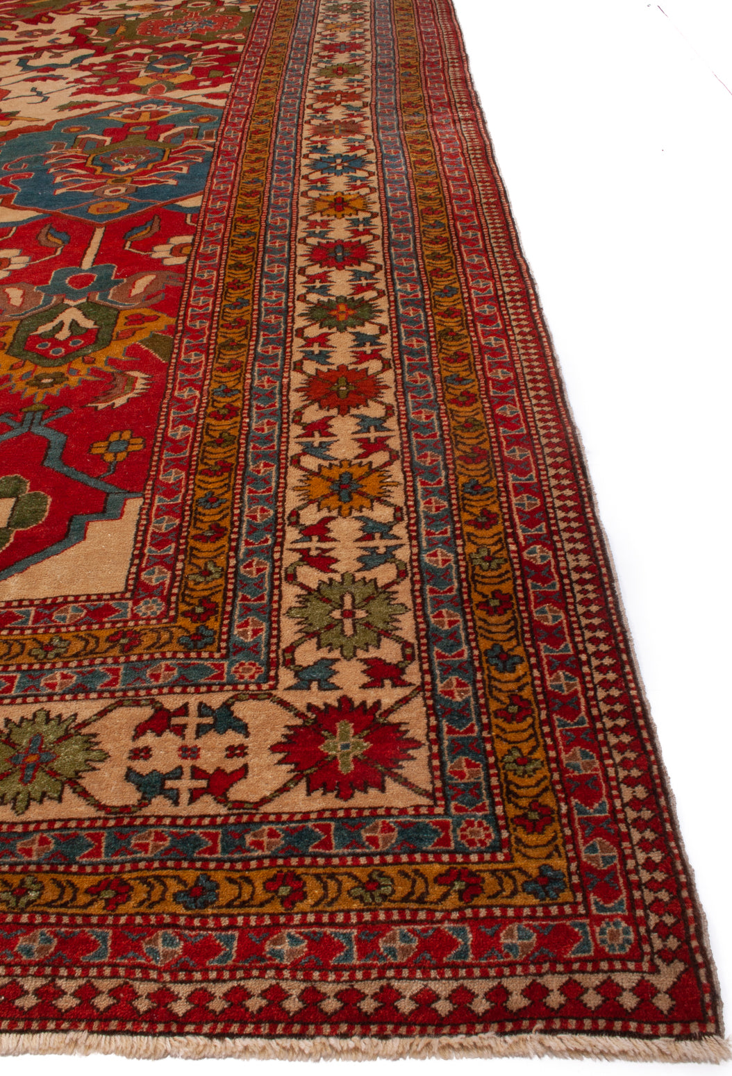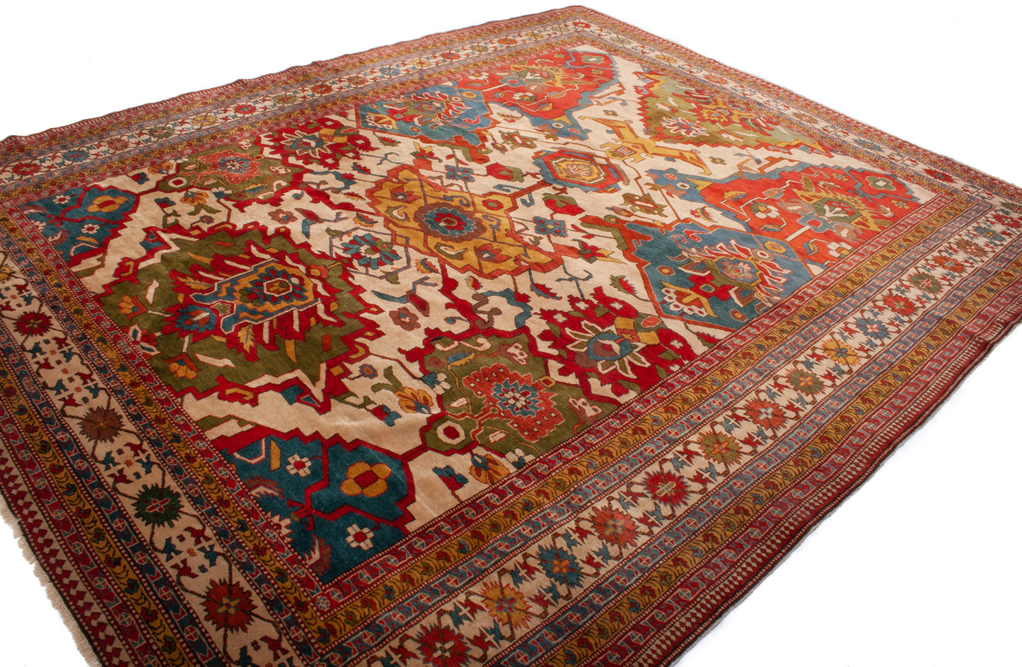 The ivory field provides a luminous backdrop for the rich red, deep green, and dark blue motifs, accented with touches of mustard yellow and soft brown. A striking red border frames the piece, adorned with rosettes and angular forms, flanked by finely detailed guard bands that enhance the sense of structure and balance.