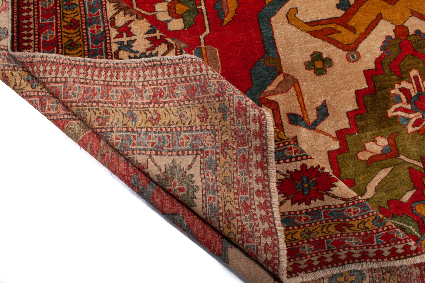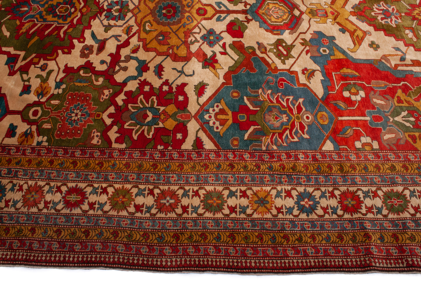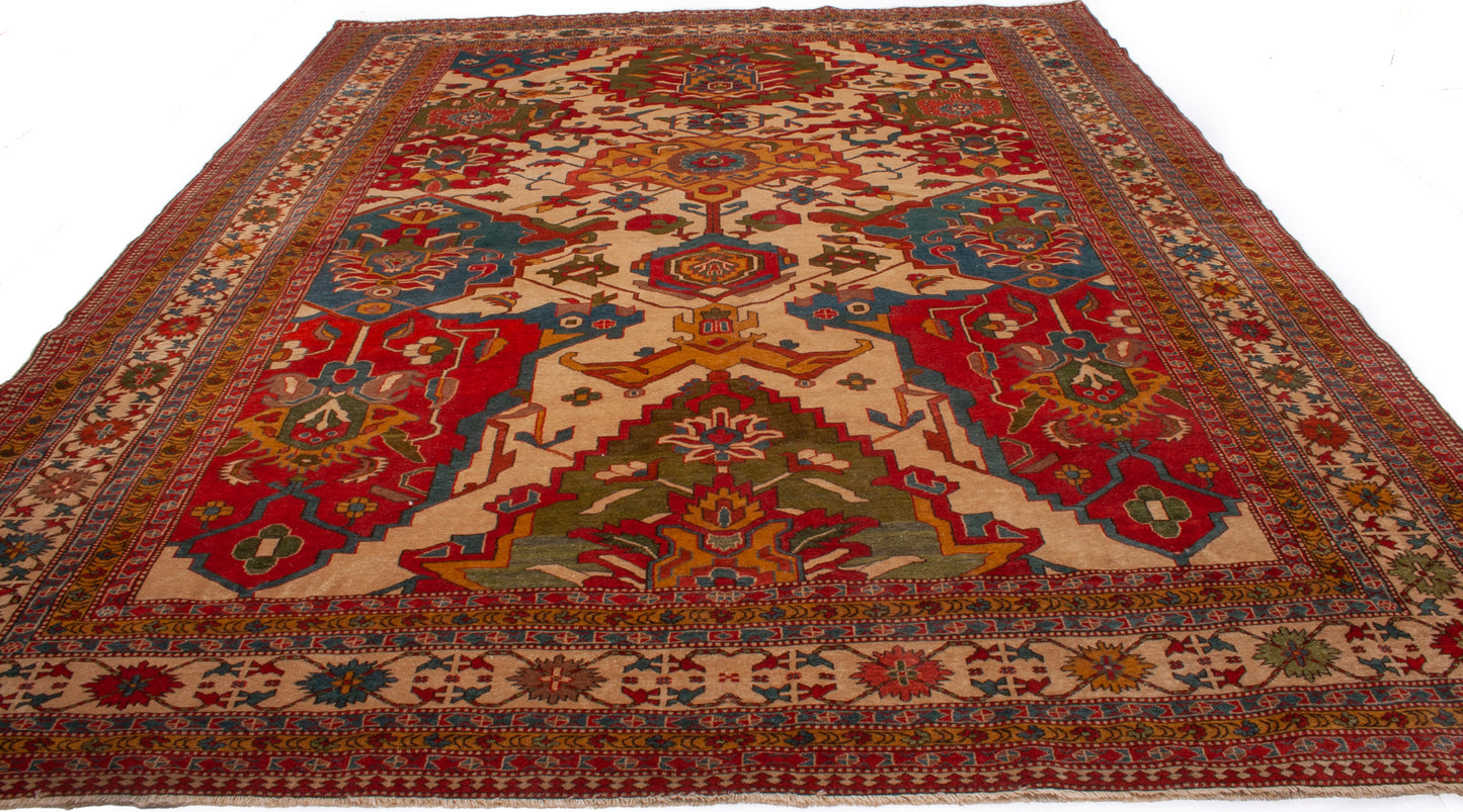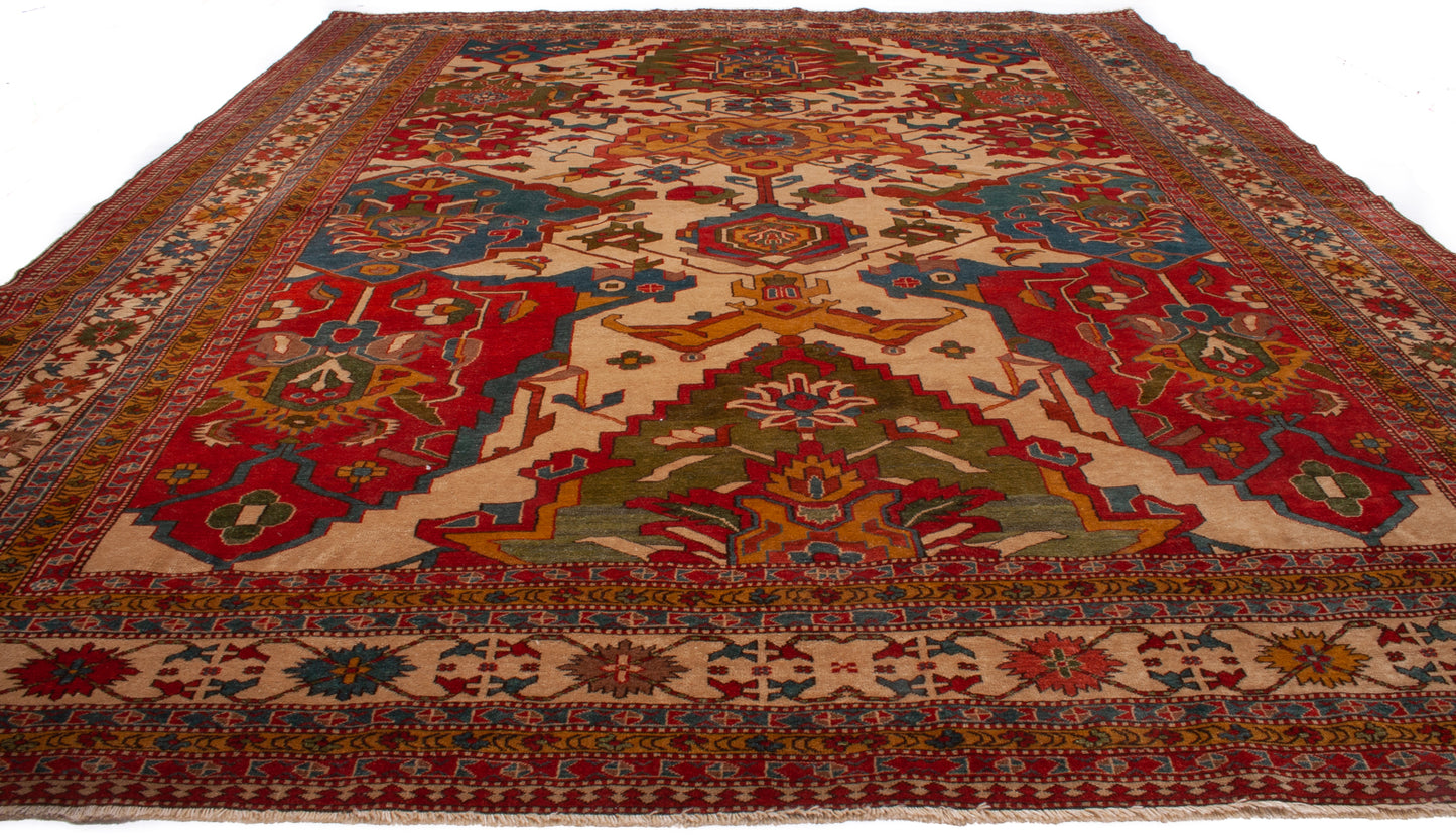 The ivory field provides a luminous backdrop for the rich red, deep green, and dark blue motifs, accented with touches of mustard yellow and soft brown. A striking red border frames the piece, adorned with rosettes and angular forms, flanked by finely detailed guard bands that enhance the sense of structure and balance.