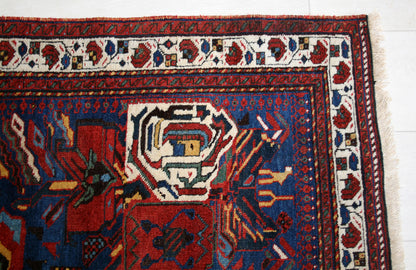 Hand-knotted by the Afshar tribes of Iran, this antique Persian rug embodies the raw energy and symbolic richness of tribal weaving. Its asymmetrical, all-over design features octagonal shapes, stylised birds, ram’s horns (Koçboynuzu), and abstract forms—each motif a fragment of tribal storytelling.