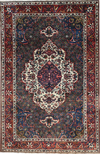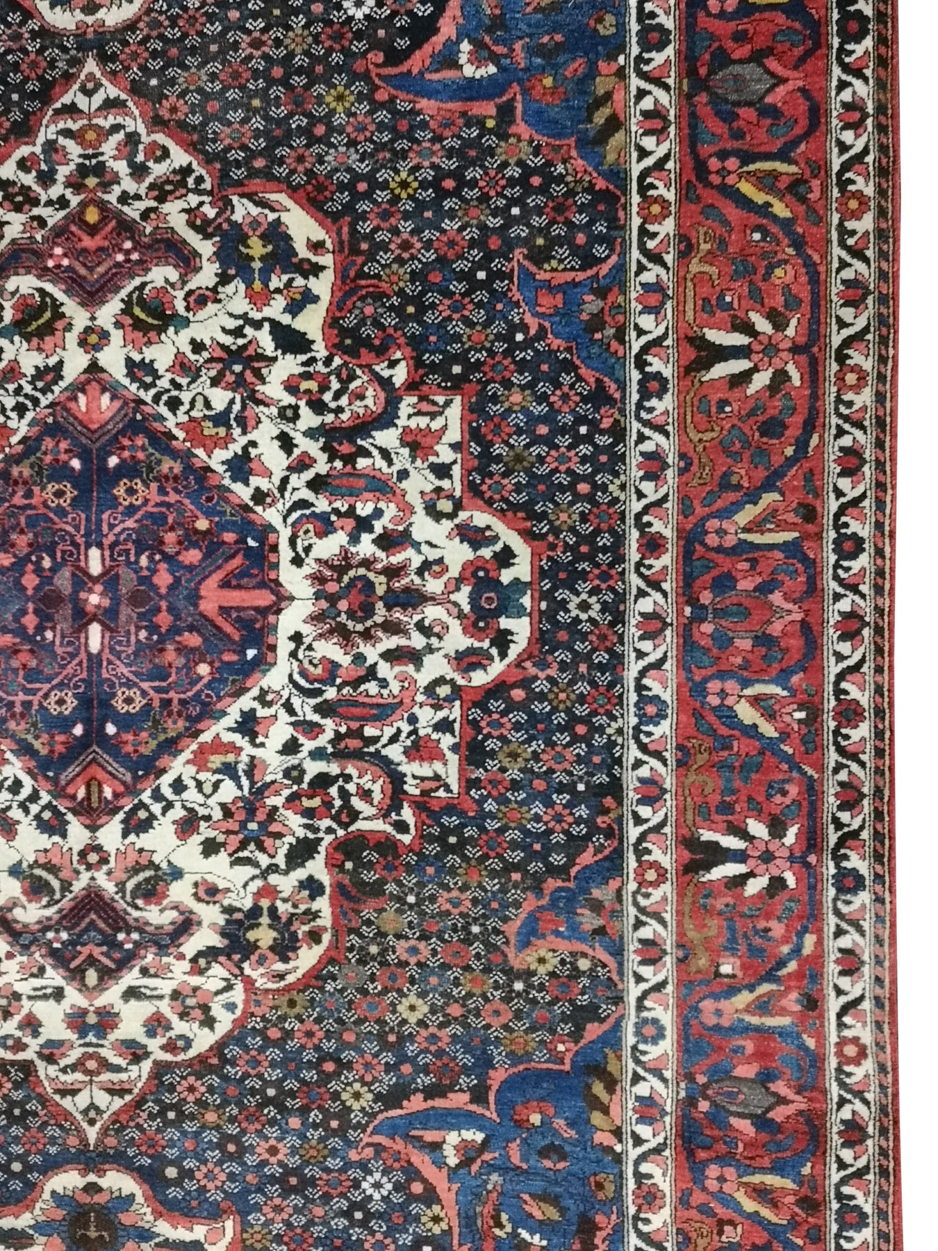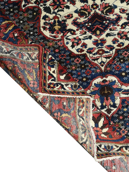 This antique Persian Bakhtiari rug captures the bold intricacy and structural balance that define the region’s weaving tradition. At its heart lies a lobed medallion, set against a navy field adorned with the Herati motif—a rhythmic arrangement of diamond forms, floral elements, and curling leaves—framed by ivory spandrels that echo the field’s symmetry.