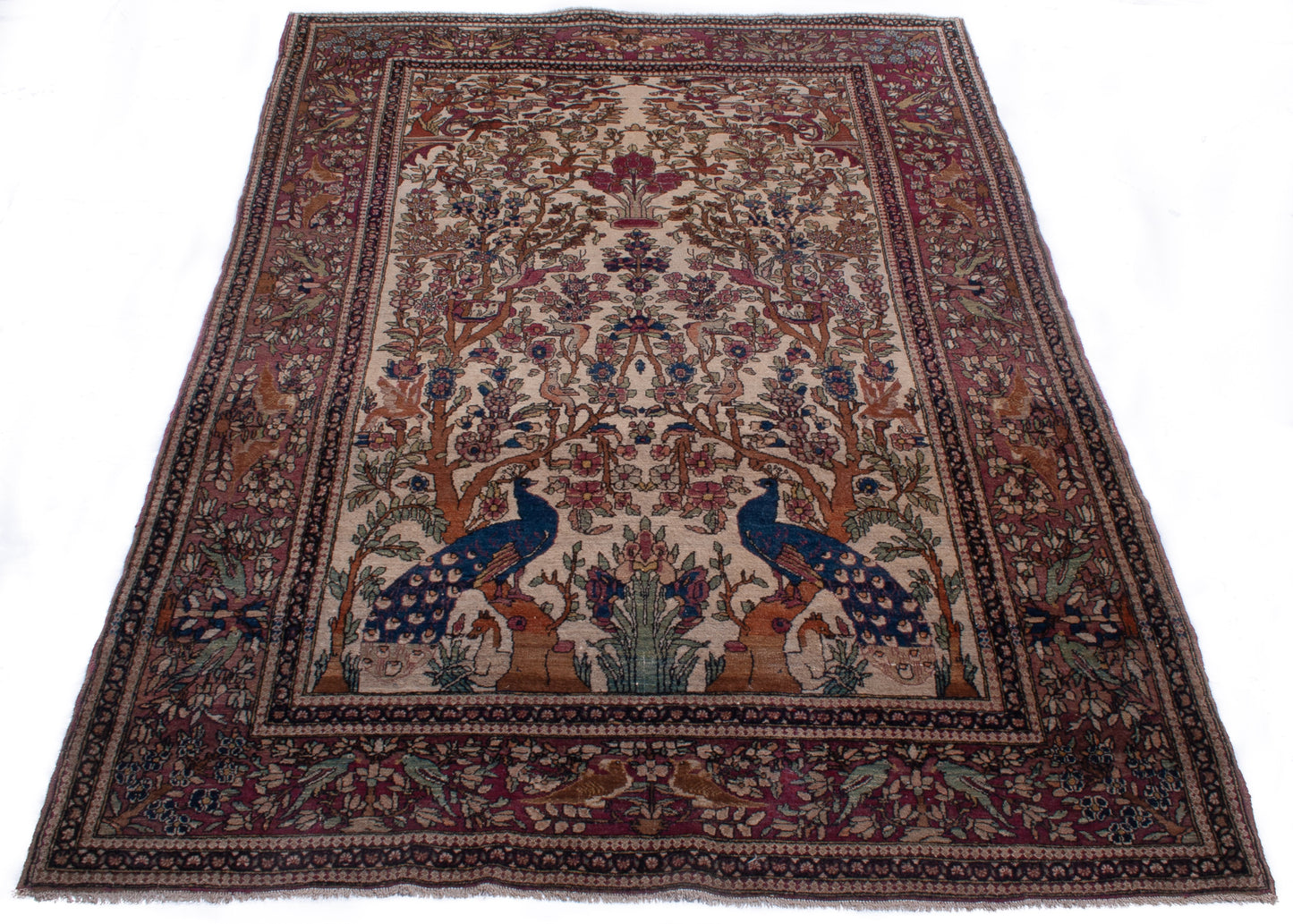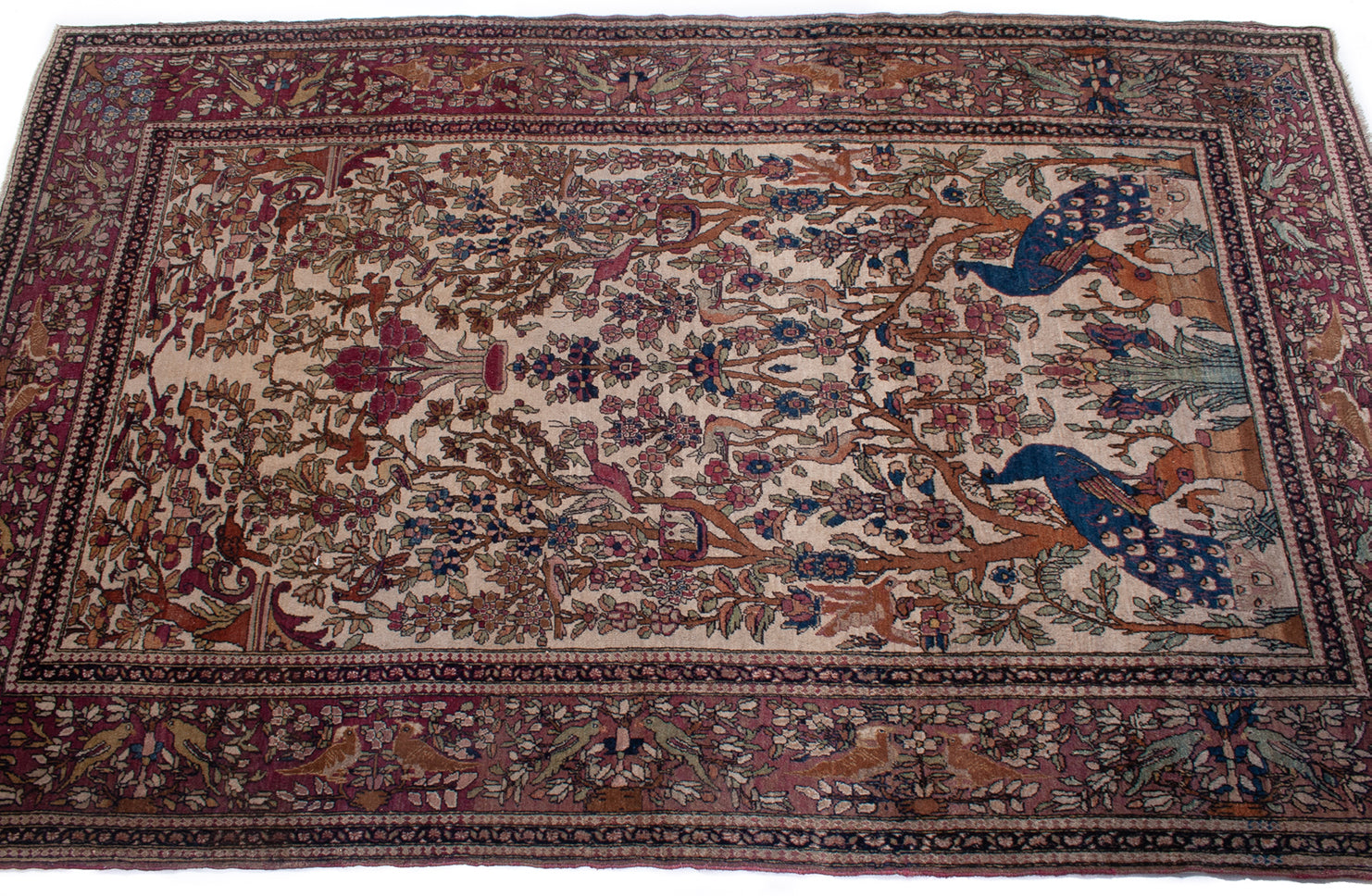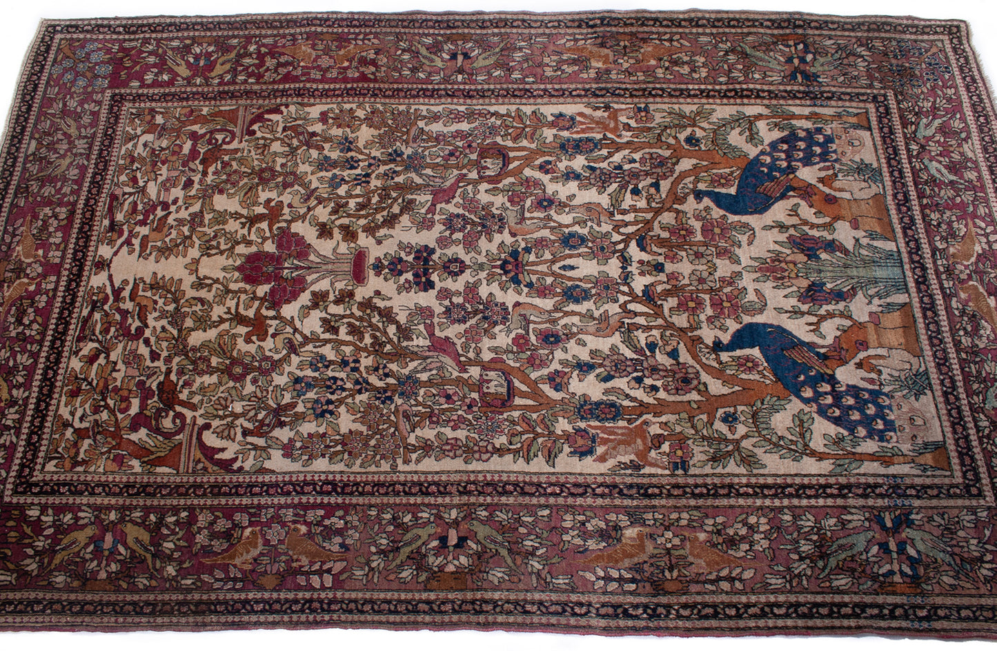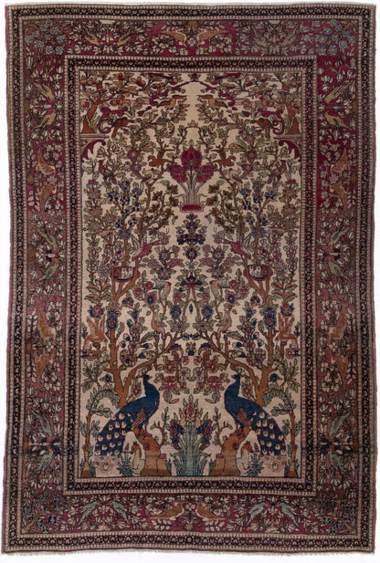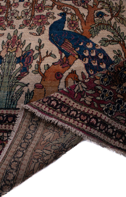 Hand-knotted in Isfahan, this antique Persian rug is a poetic expression of artistry and symbolism, woven with extraordinary precision. At its heart lies the Tree of Life (Daraxt-e-Hayāt), rising symmetrically from an ivory field, its branches rich with floral motifs and crowned by two majestic peacocks—symbols of immortality and beauty in Persian tradition.