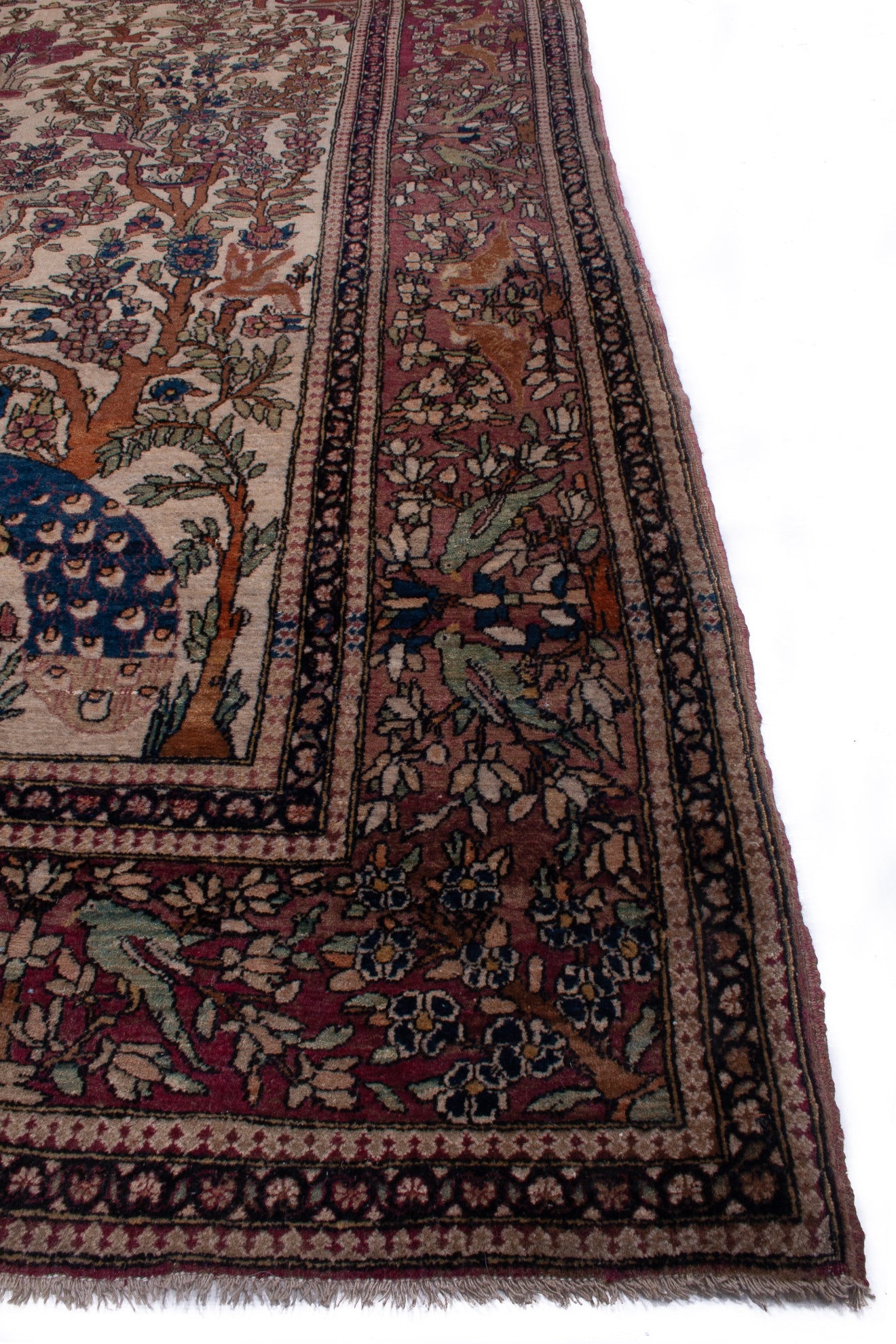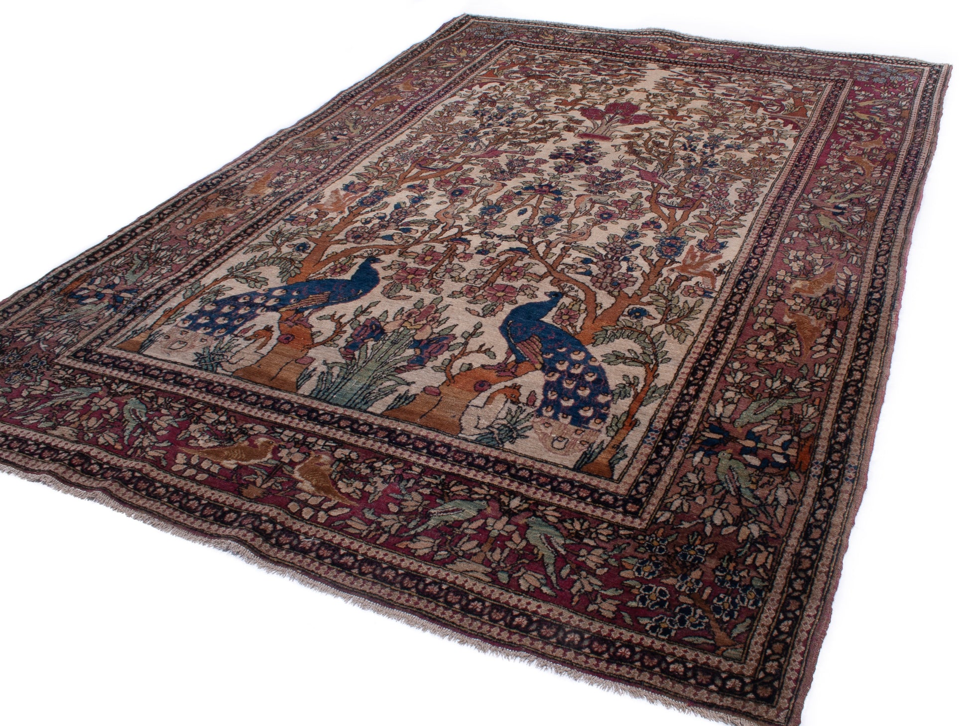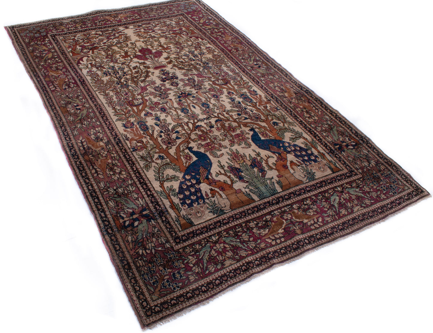 Hand-knotted in Isfahan, this antique Persian rug is a poetic expression of artistry and symbolism, woven with extraordinary precision. At its heart lies the Tree of Life (Daraxt-e-Hayāt), rising symmetrically from an ivory field, its branches rich with floral motifs and crowned by two majestic peacocks—symbols of immortality and beauty in Persian tradition.