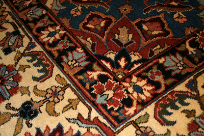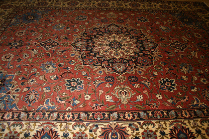 The rust red field is framed by an ivory border adorned with floral and palmette elements, creating a striking contrast softened by tones of midnight blue, olive green, and soft gold. Delicate guard bands provide a refined transition between the field and border, enhancing the rug’s architectural clarity.