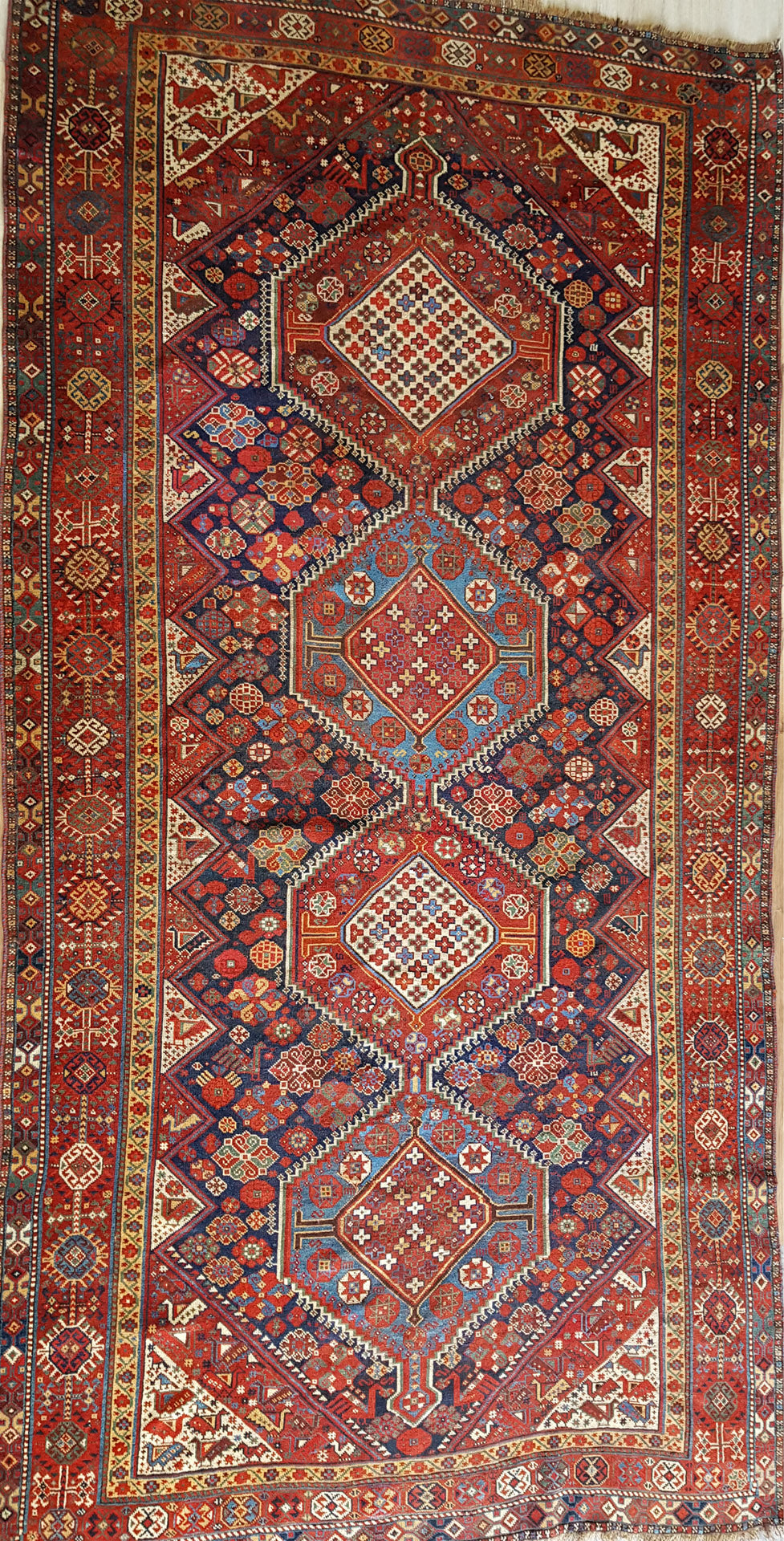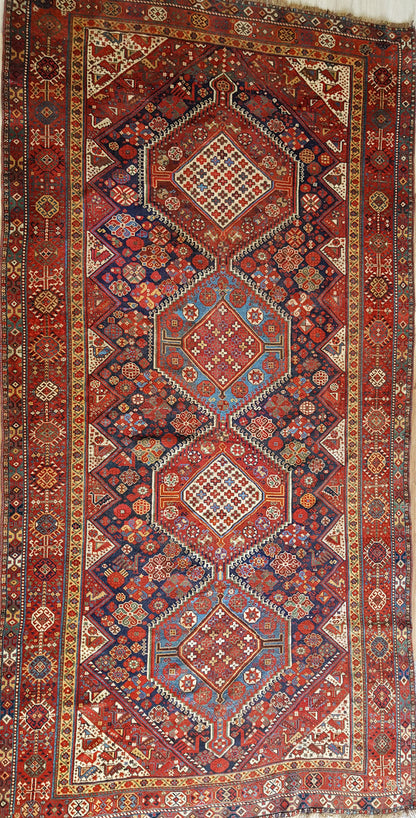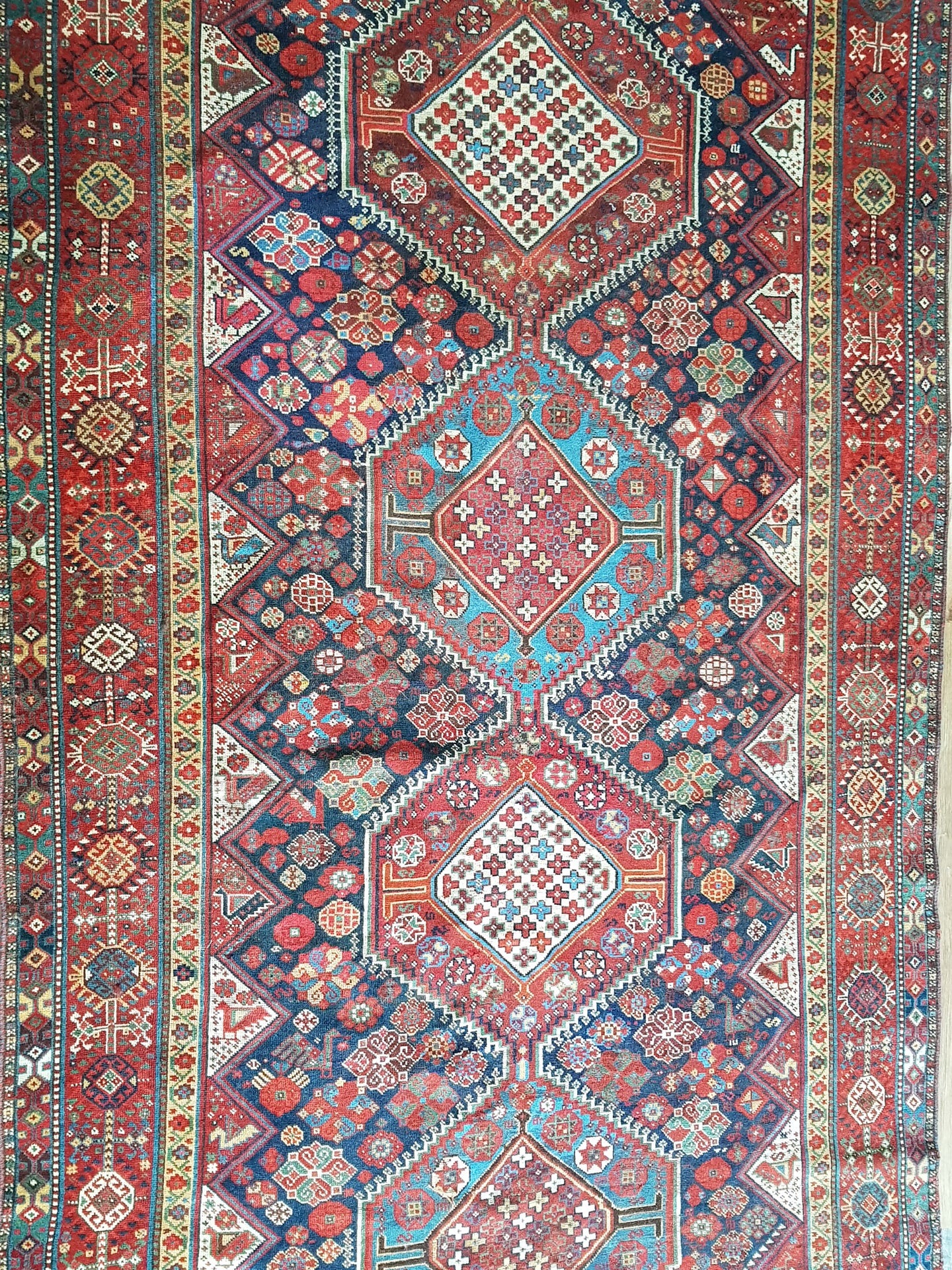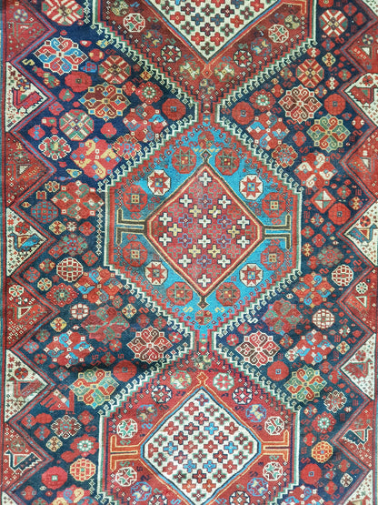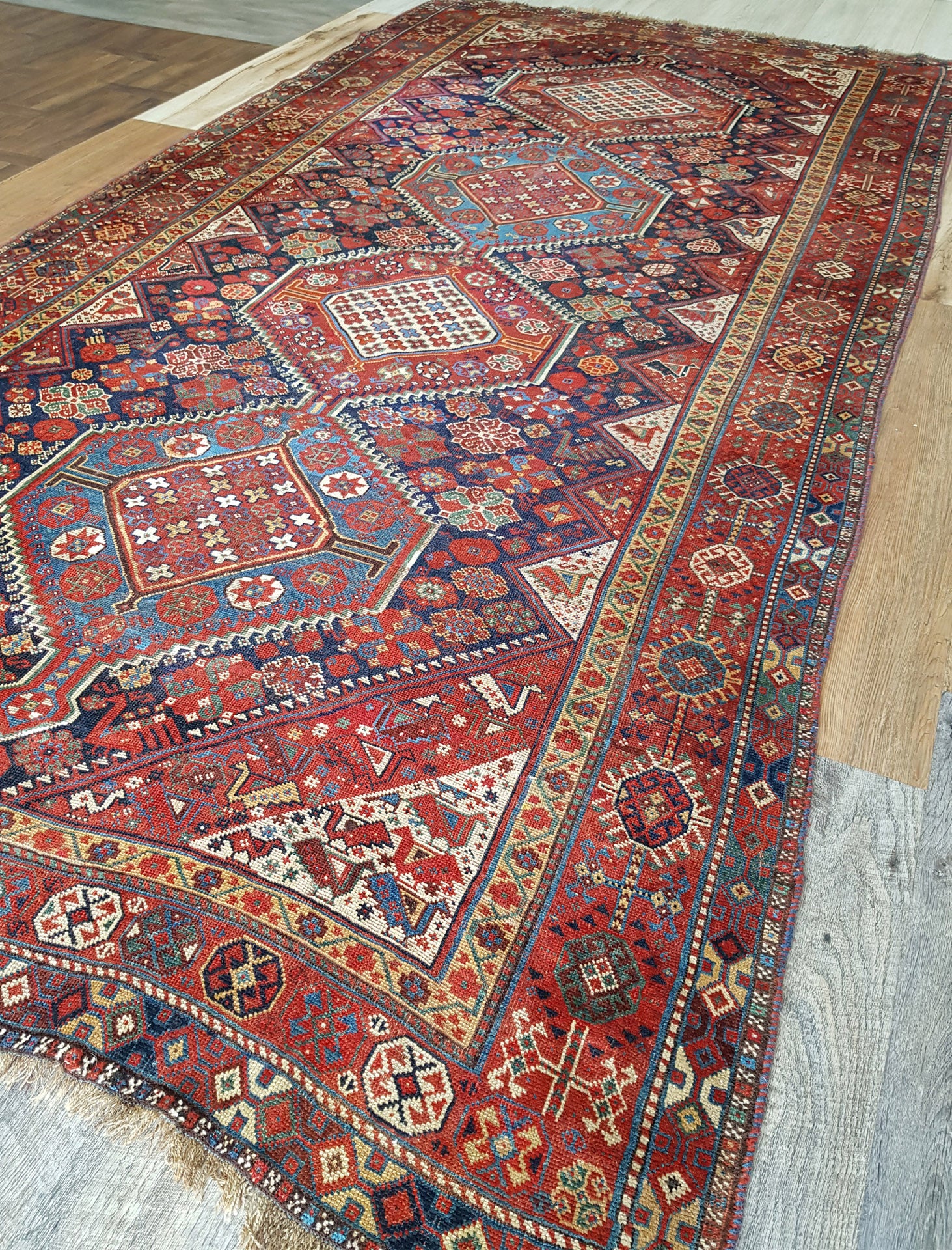 This antique Qashqai rug captures the spirit of tribal Persian weaving, rich in symbolism and bold design. Hand-knotted by the Qashqai nomads of Iran, it features a striking repeat medallion layout, with hexagonal forms running along the central axis, each filled with stylised floral motifs and cross symbols.