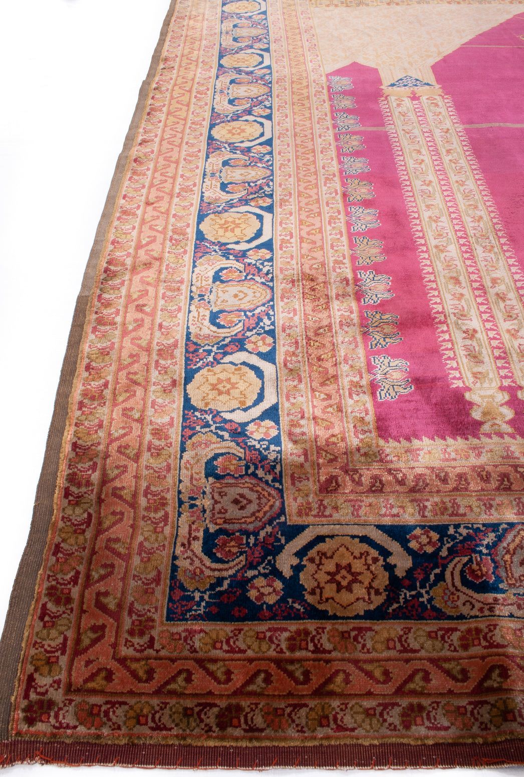 Hand-knotted in Konya, this antique Turkish prayer rug (mihrab) reflects the spiritual and artistic heritage of Anatolia. Its pointed arch and central hanging lamp motif evoke the symbolism of devotion, framed by floral spandrels and a mirrored arrangement of geometric and botanical elements.