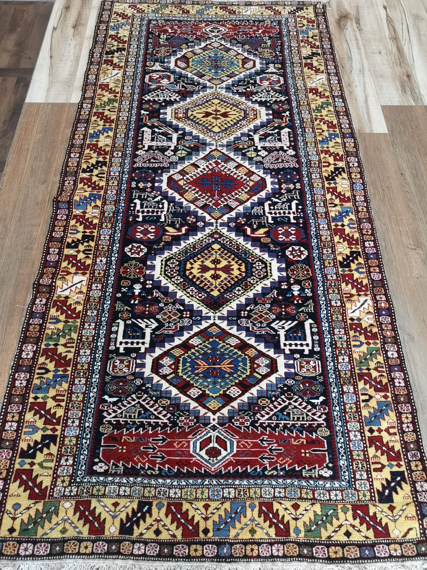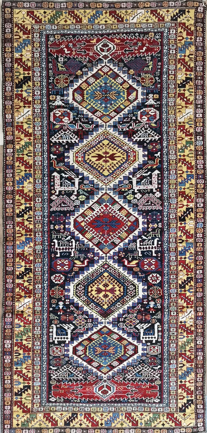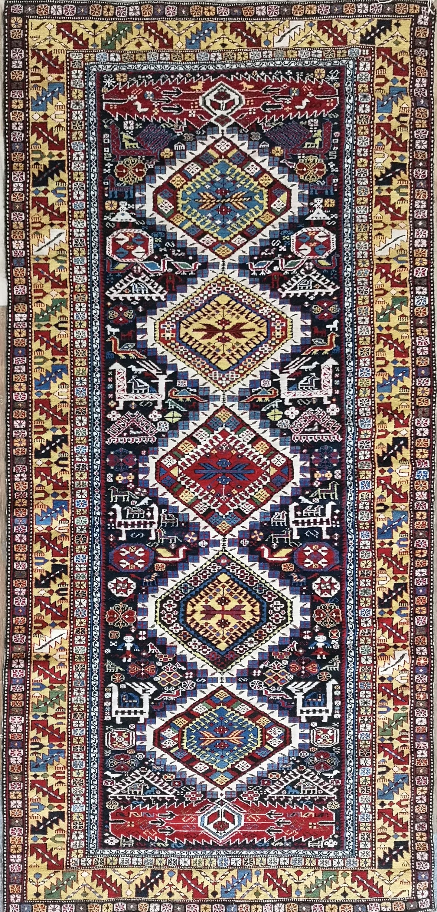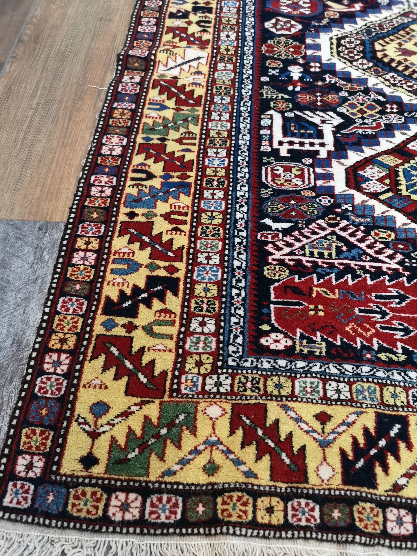 This hand-knotted Caucasian rug from Azerbaijan captures the bold spirit of tribal weaving, featuring a repeat medallion layout rich with symbolism and movement. Diamond-shaped medallions anchor the design, adorned with cross motifs, stylised animal figures, and angular floral elements, all arranged in a strikingly symmetrical composition.