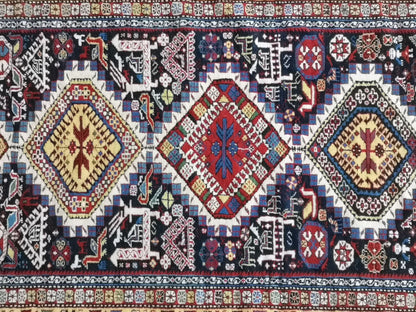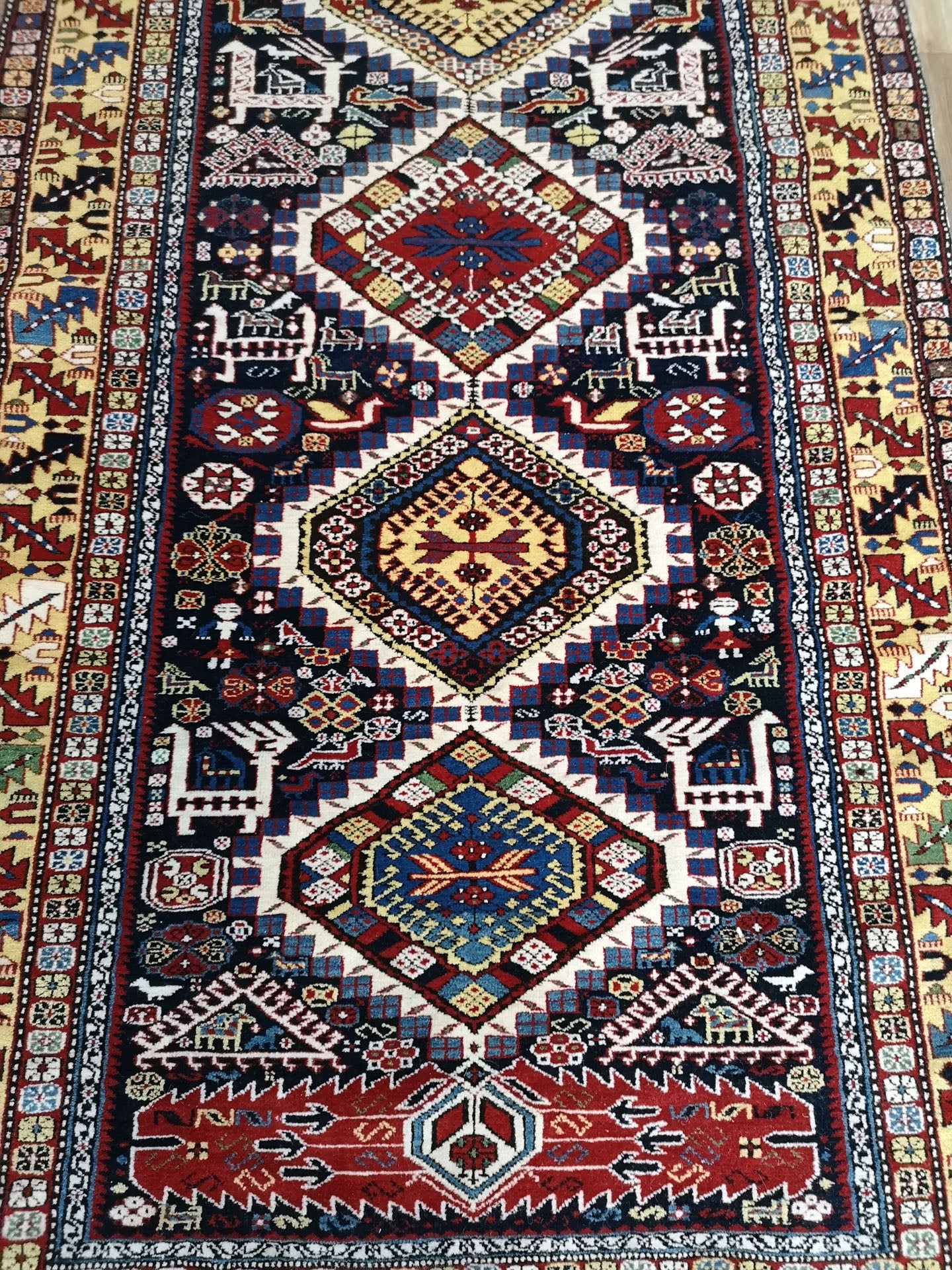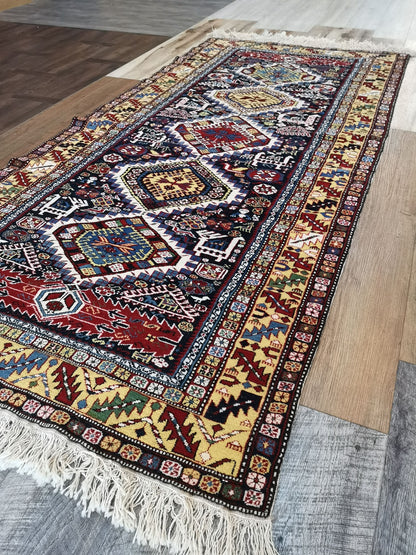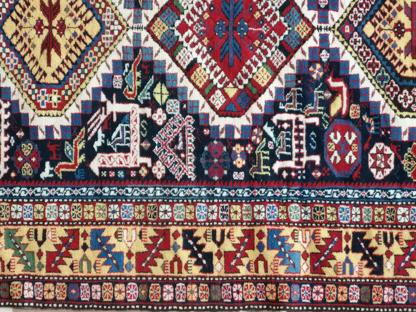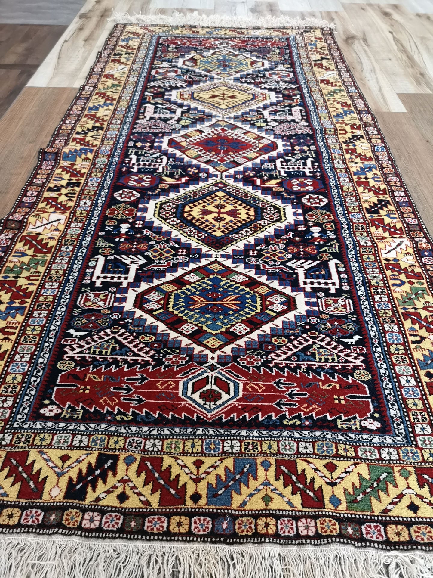 This hand-knotted Caucasian rug from Azerbaijan captures the bold spirit of tribal weaving, featuring a repeat medallion layout rich with symbolism and movement. Diamond-shaped medallions anchor the design, adorned with cross motifs, stylised animal figures, and angular floral elements, all arranged in a strikingly symmetrical composition.
