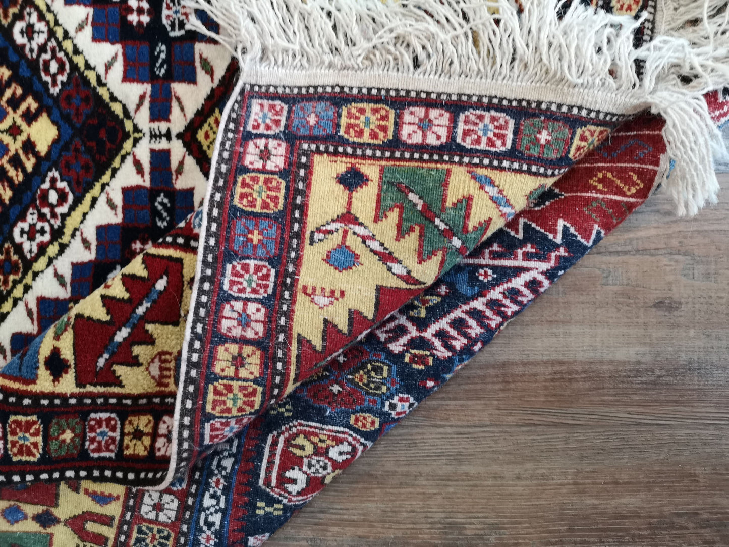 Hand-knotted with a dense 324 knots per square inch, this piece reflects the precision and heritage of Caucasian craftsmanship. Its bold palette and tribal geometry make it an ideal centrepiece for traditional or eclectic interiors, adding character and narrative to any space.
