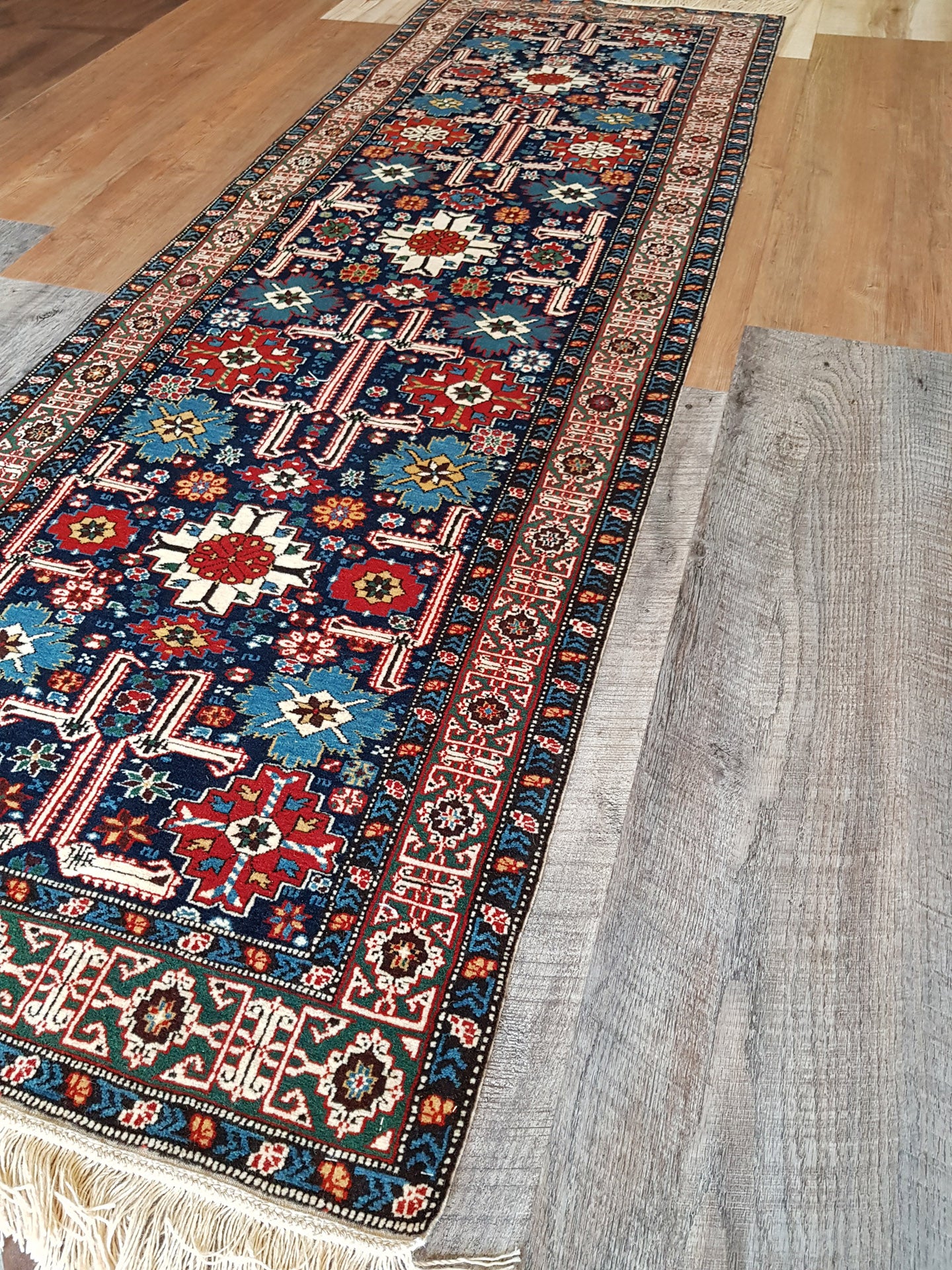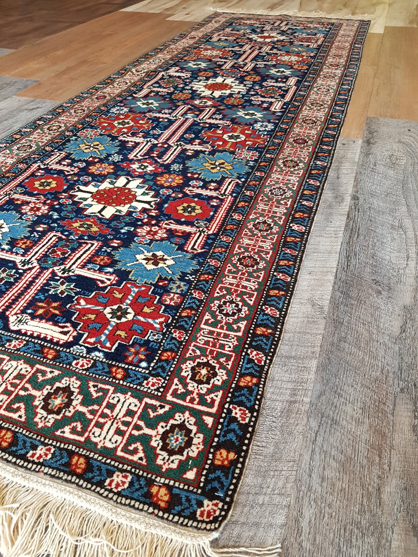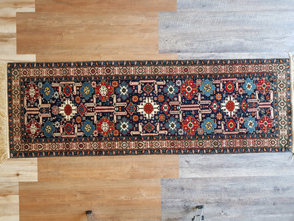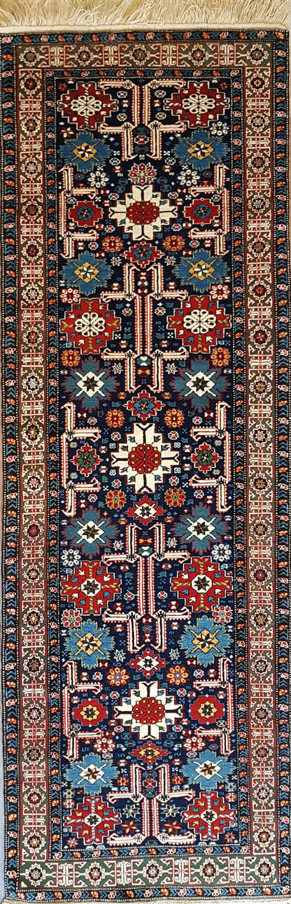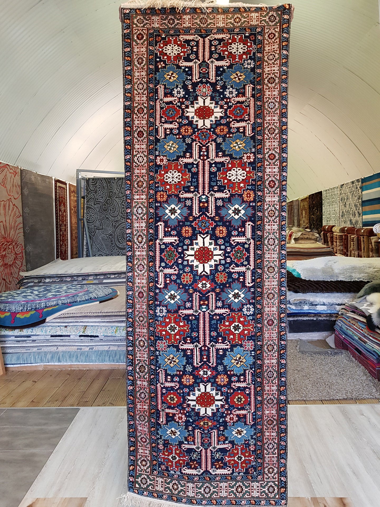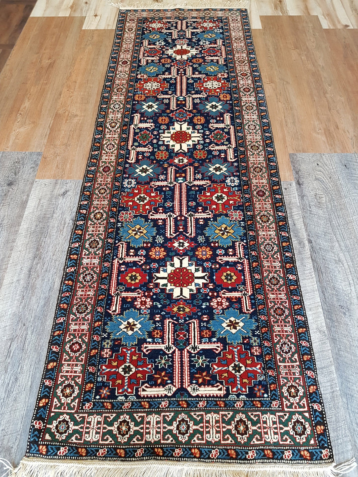 With its compact 300 knots per square inch, this piece is both durable and intricately woven, making it a practical yet artistic addition to a hallway or narrow space. Its timeless design carries the cultural heritage of Caucasian weavers, blending functionality with aesthetic appeal.