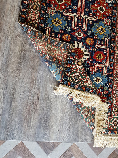 The deep blue and red field, accented with ivory, green, and yellow, creates a striking contrast that enhances the rug’s visual depth. The structured layout of rosettes, stylized flowers, and geometric symbols lends a sense of balance and movement, while the finely detailed border with scrolling vine elements provides a refined frame.