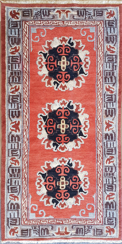 Hand-knotted in China, this 130 Line Peking rug showcases the precision and symmetry of repeat medallion design, rooted in classical Chinese weaving traditions. Three circular medallions, adorned with swirling floral motifs and cross-like elements, form the spine of the composition, creating a sense of balance and continuity.