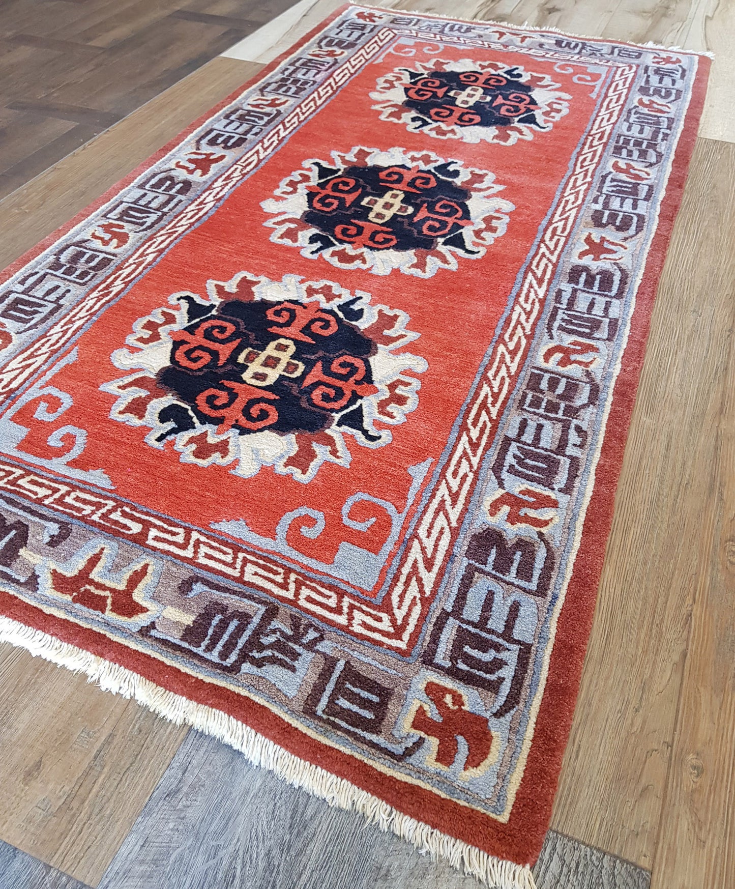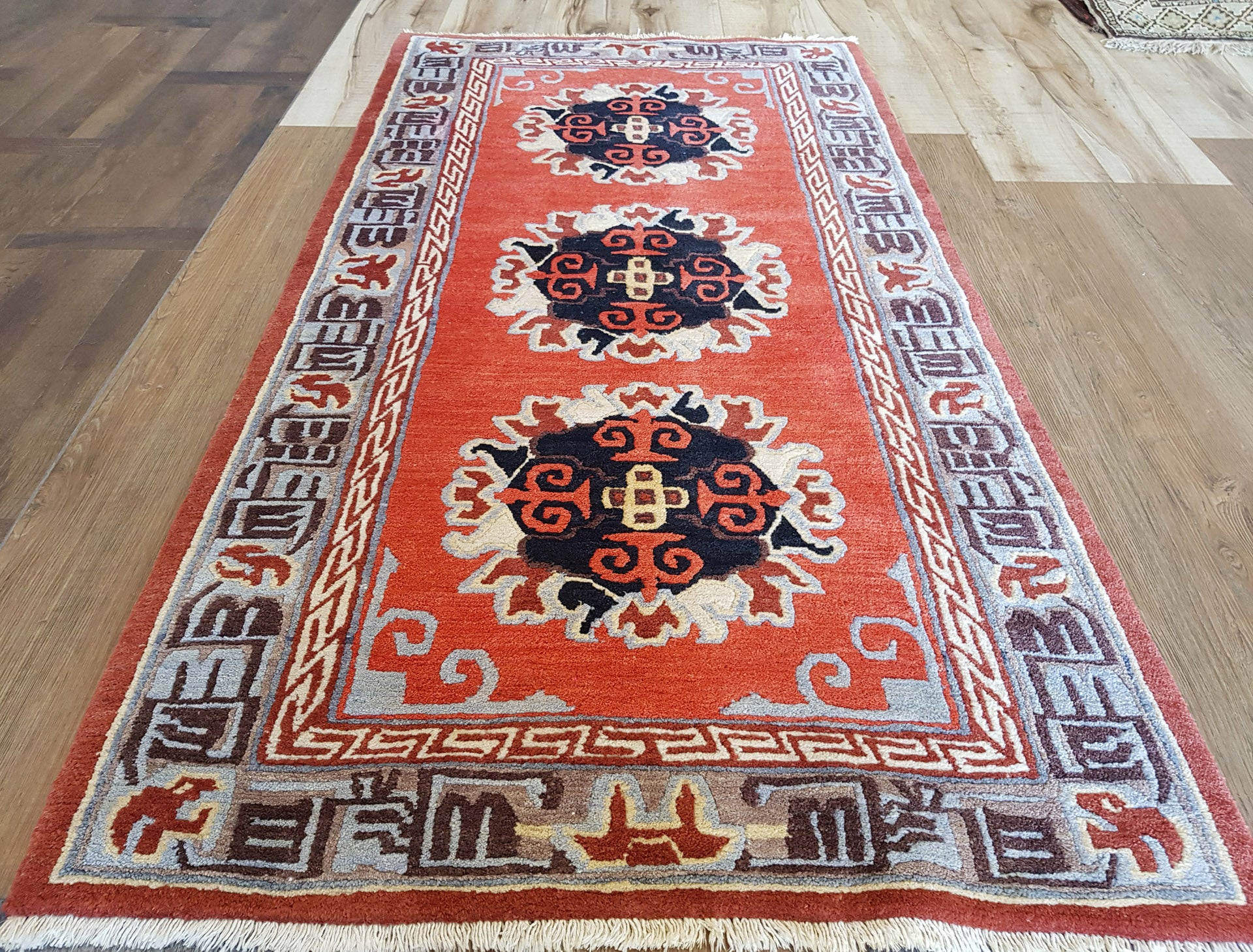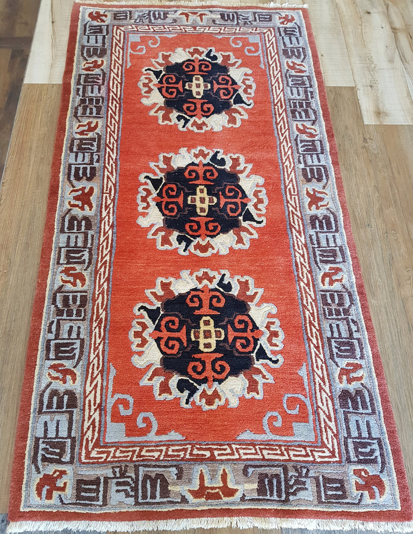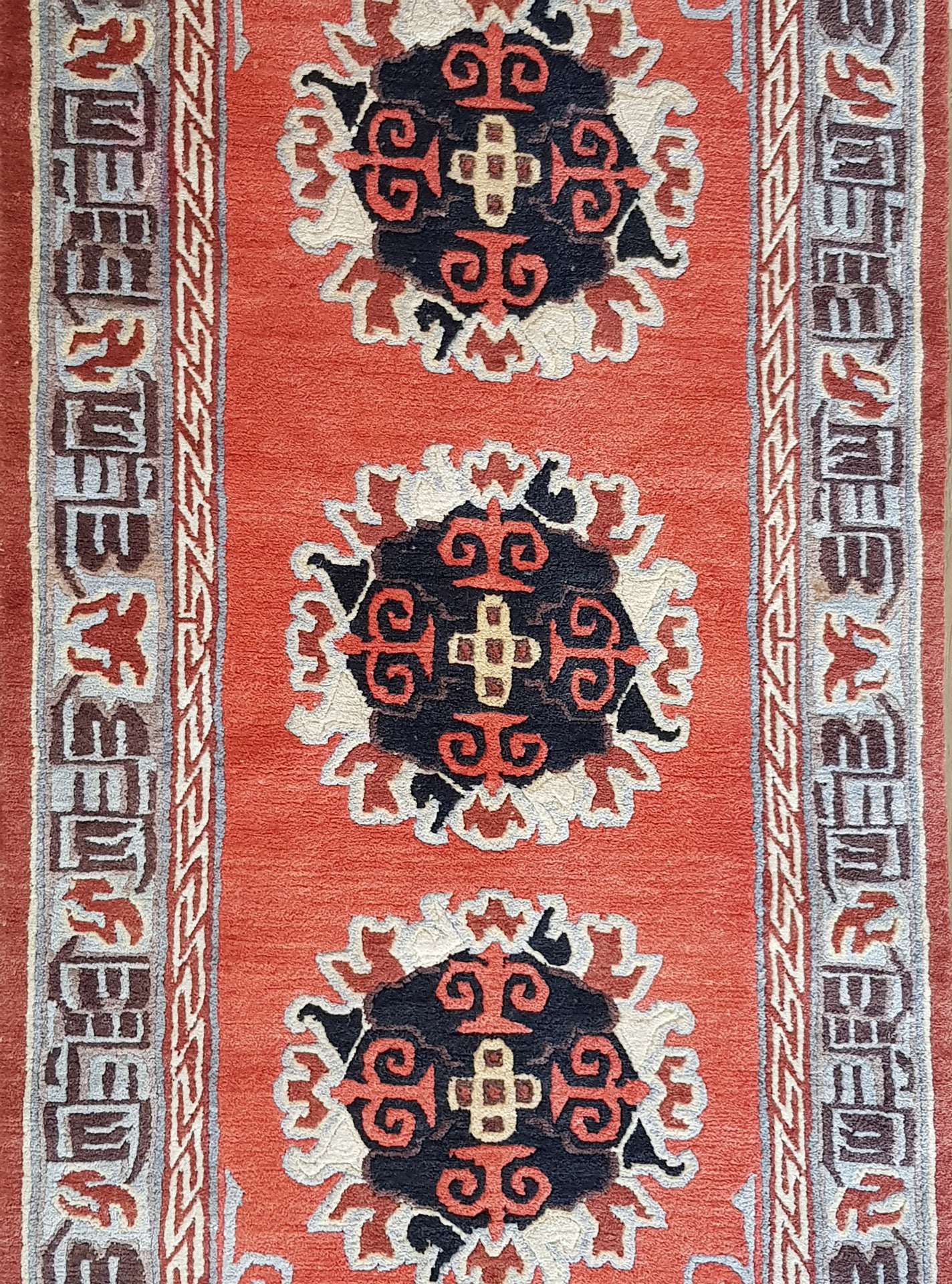 The rust orange field provides a bold contrast to the ivory, black, and coral accents within the medallions. A slate grey border, enriched with Kufic-like and geometric motifs in walnut brown and burnt orange, frames the design with structure and rhythm. An ivory guard border offers a subtle transition, softening the edges.