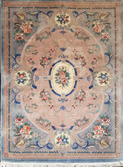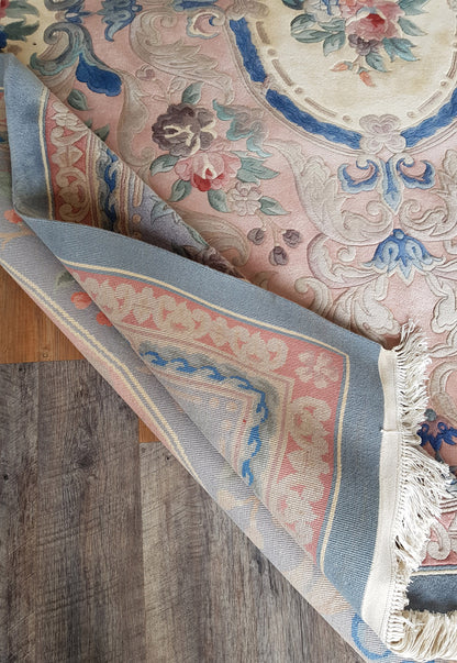 This hand-knotted Chinese Aubusson rug captures the grace of classical European design, reimagined through fine craftsmanship. Its softly muted palette of pink, ivory, and sage green lends a sense of delicacy, while floral medallions and scrolling vine motifs evoke the refinement of French decorative traditions.