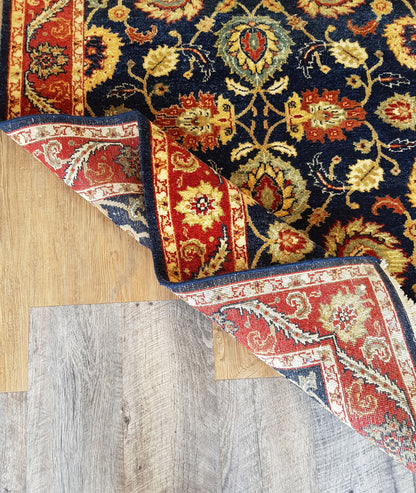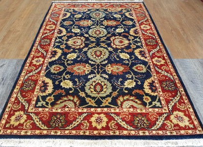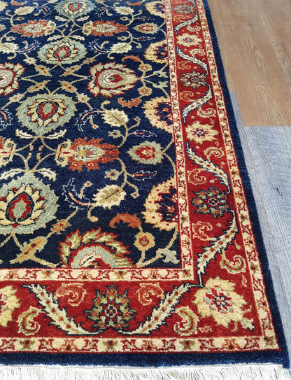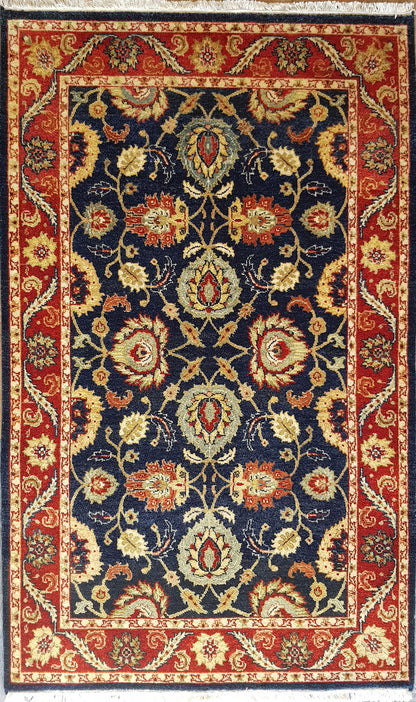 The navy blue field sets a dramatic foundation for the motifs in rich red, soft gold, and sage green, while accents of burnt orange and beige add subtle warmth. A bold red border adorned with palmettes and vine motifs provides a strong frame, softened by delicately toned guard bands.
