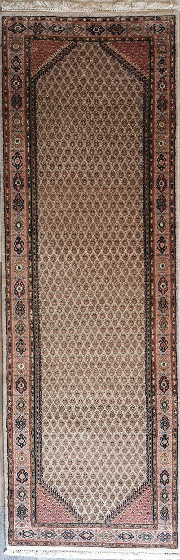 This Indian Bijar rug draws on the bold geometry and symbolic richness of tribal weaving traditions. Hand-knotted in India, it features a prayer arch (mihrab) design filled with densely arranged boteh motifs—symbolic of growth and resilience—set against an earthy brown field.