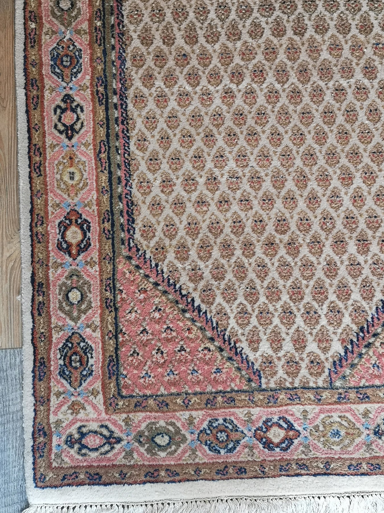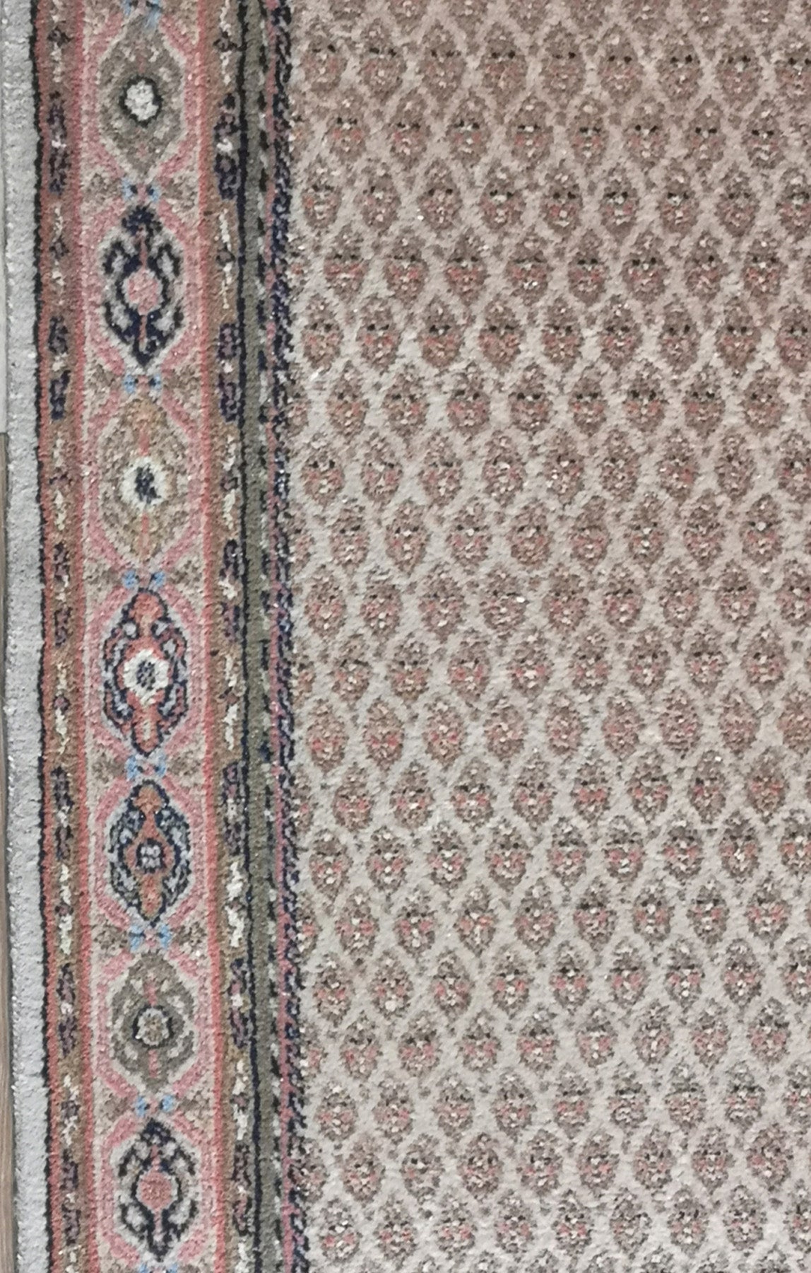 The soft pink border, adorned with stylised rosettes and geometric forms, introduces gentle contrast while maintaining the rug’s grounded palette of cream, dark blue, and muted tones. Framed by dark blue guard bands, the composition feels anchored and cohesive.
