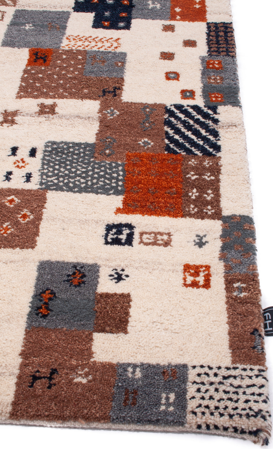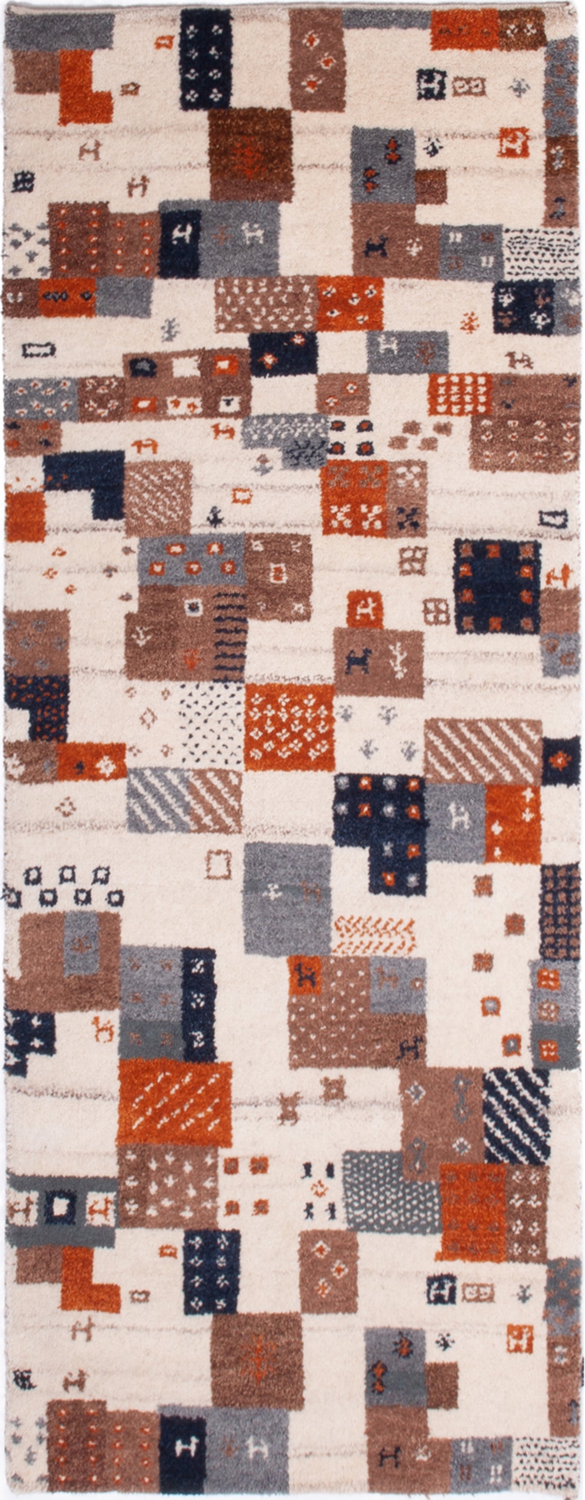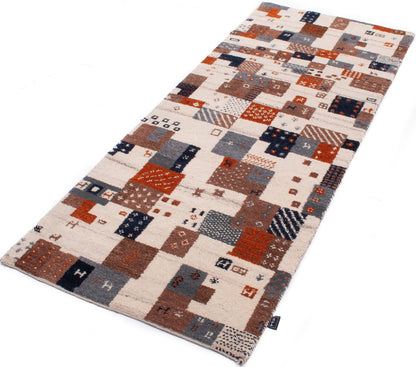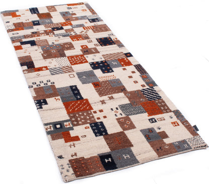 This hand-knotted Indian Gabbeh runner captures the spirit of tribal design through its Panel (Khesti) layout—a grid of uneven compartments filled with abstract shapes, dots, and simplified animal forms. The earthy palette of ivory, burnt orange, slate grey, and chocolate brown creates a soft, blended aesthetic, while the absence of a border gives the piece a raw, continuous energy.