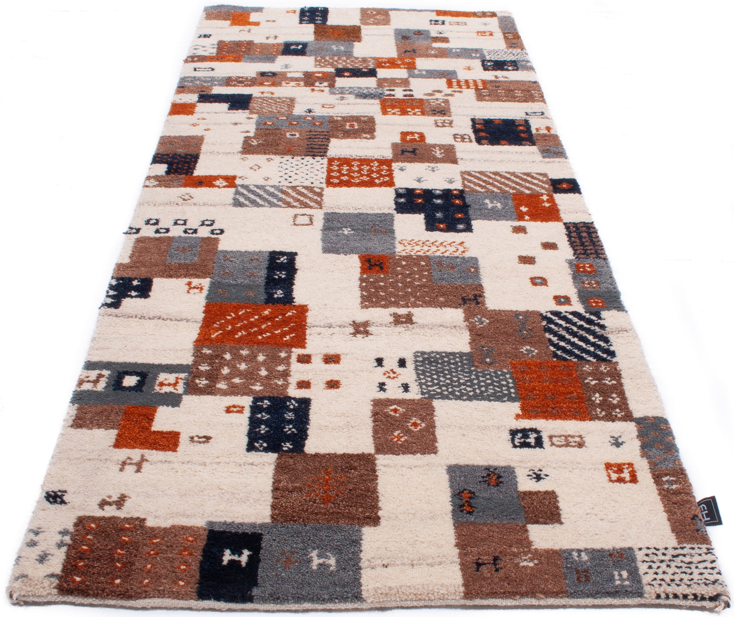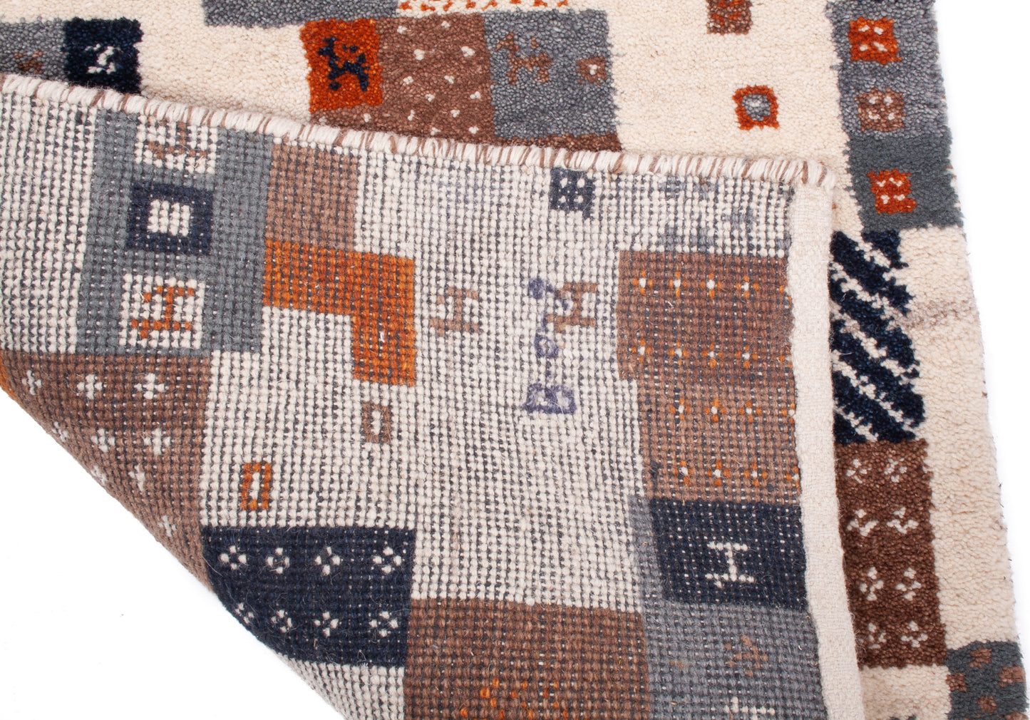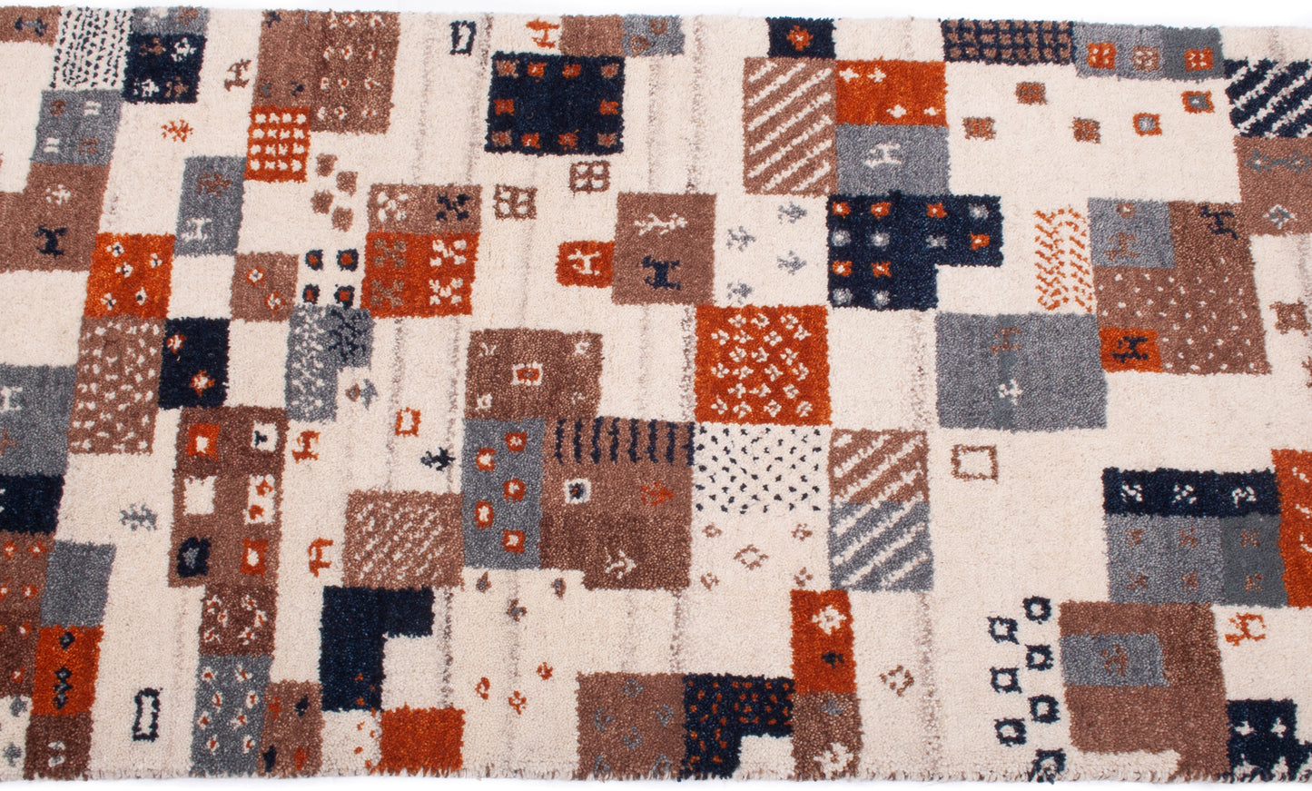 This hand-knotted Indian Gabbeh runner captures the spirit of tribal design through its Panel (Khesti) layout—a grid of uneven compartments filled with abstract shapes, dots, and simplified animal forms. The earthy palette of ivory, burnt orange, slate grey, and chocolate brown creates a soft, blended aesthetic, while the absence of a border gives the piece a raw, continuous energy.